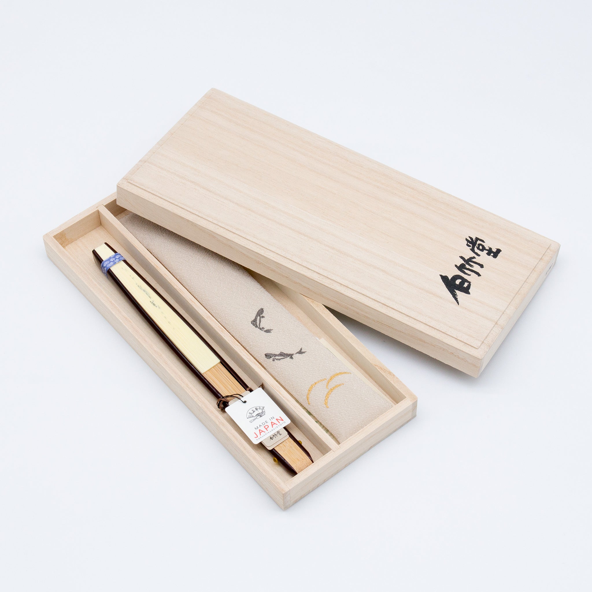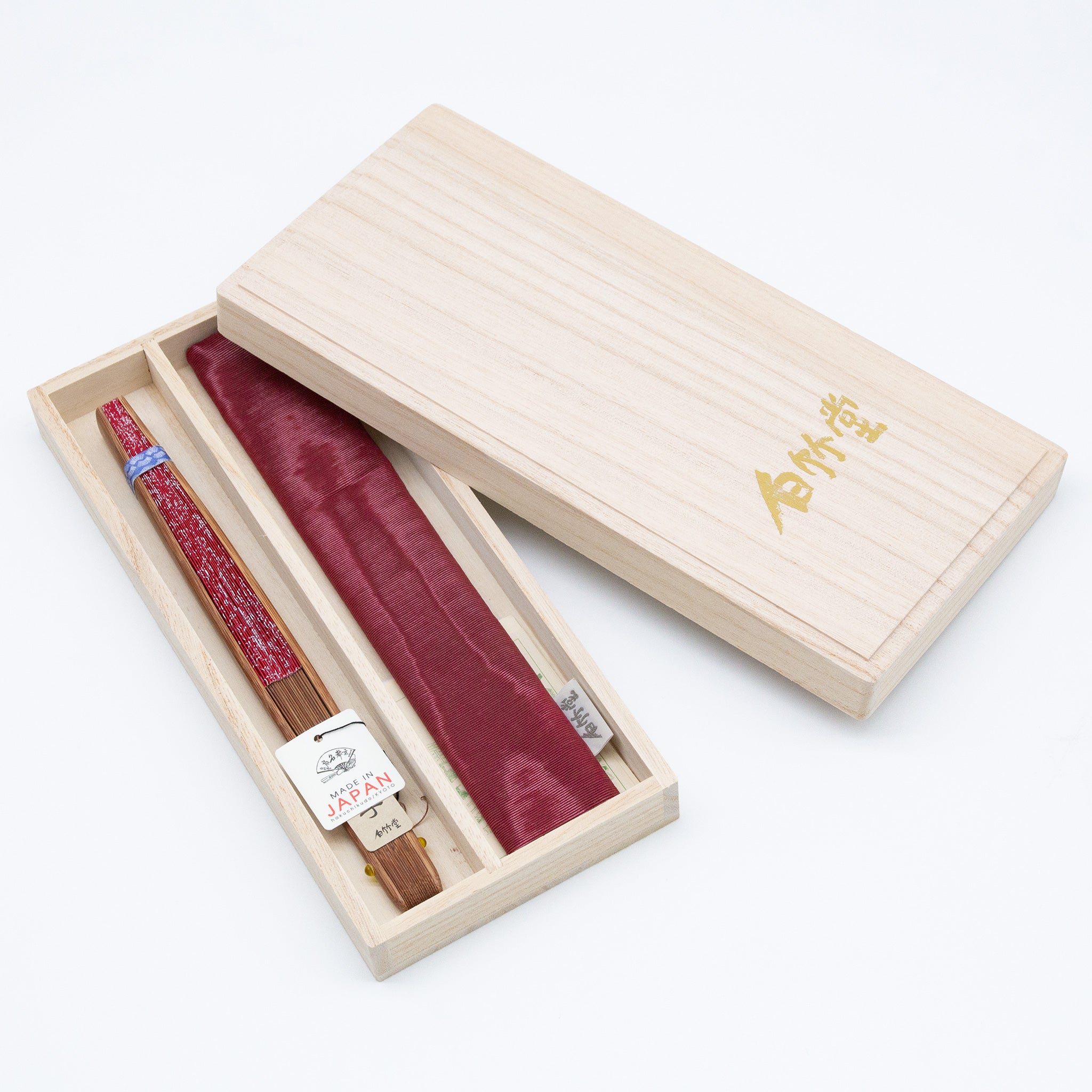 白竹堂の扇子の多くは、専用の扇子袋と高級感ある桐箱とのセット仕様。そのまま贈り物としてお使いいただけます。桐箱は防虫・防湿効果があり扇子を長持ちさせますので、保管の際も大変便利です。