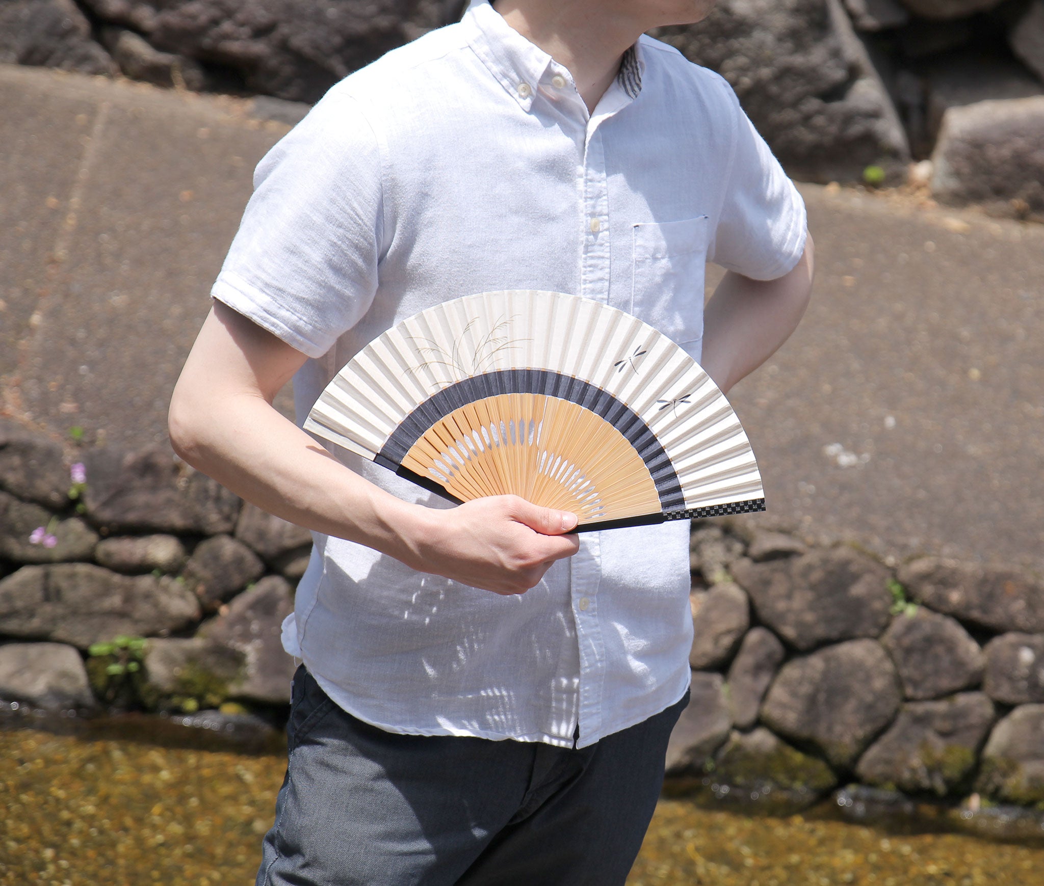 上下二段に別れた切り返しの扇面と、左右で異なる形状の仲骨がスタイリッシュでおしゃれです。