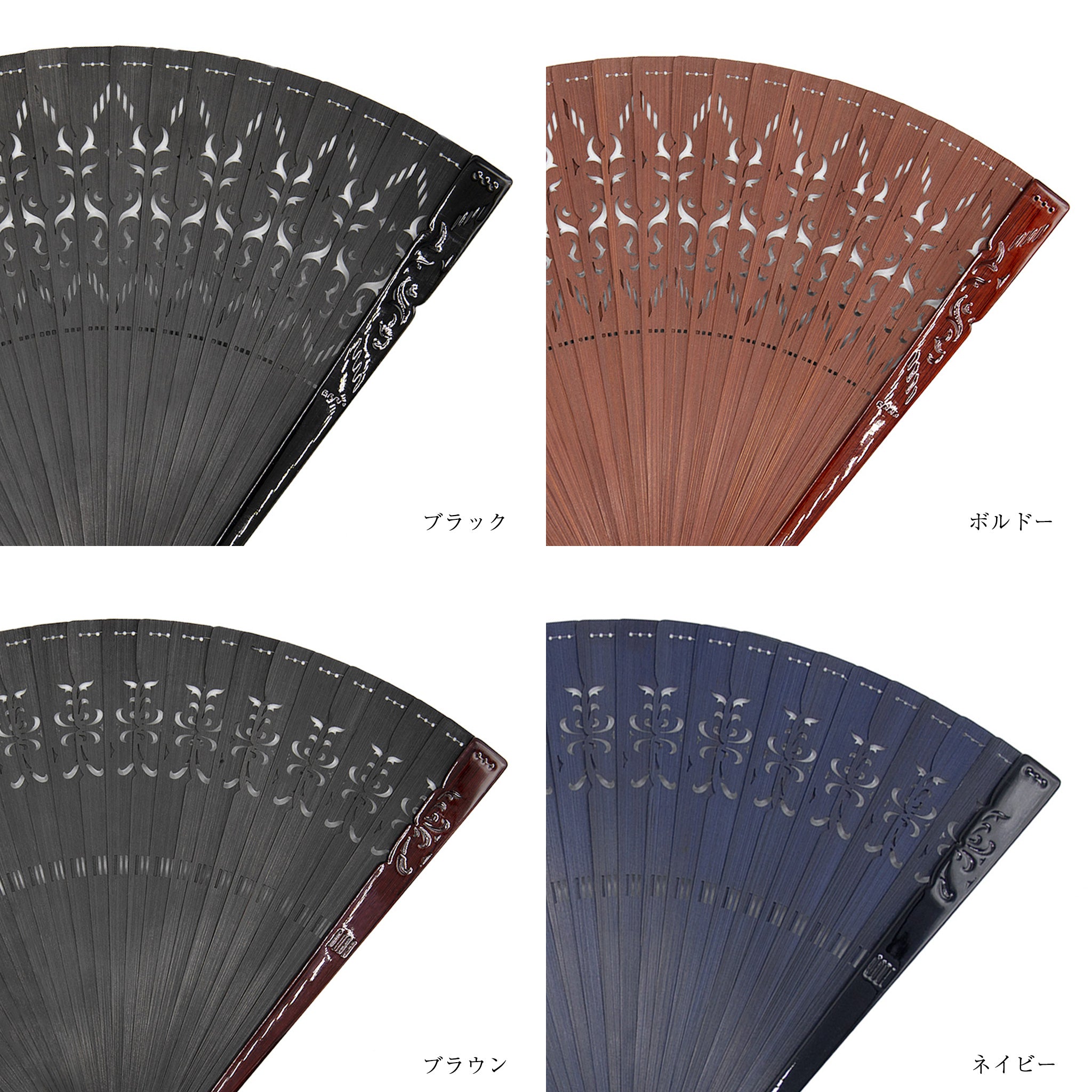 夫にブラックをプレゼントしました。色で迷いましたがブラックに。竹の扇子かっこいいですよ。透かしのデザインもセンスの良さを感じられます。別途ですが名前を入れていただけるのも嬉しいです。