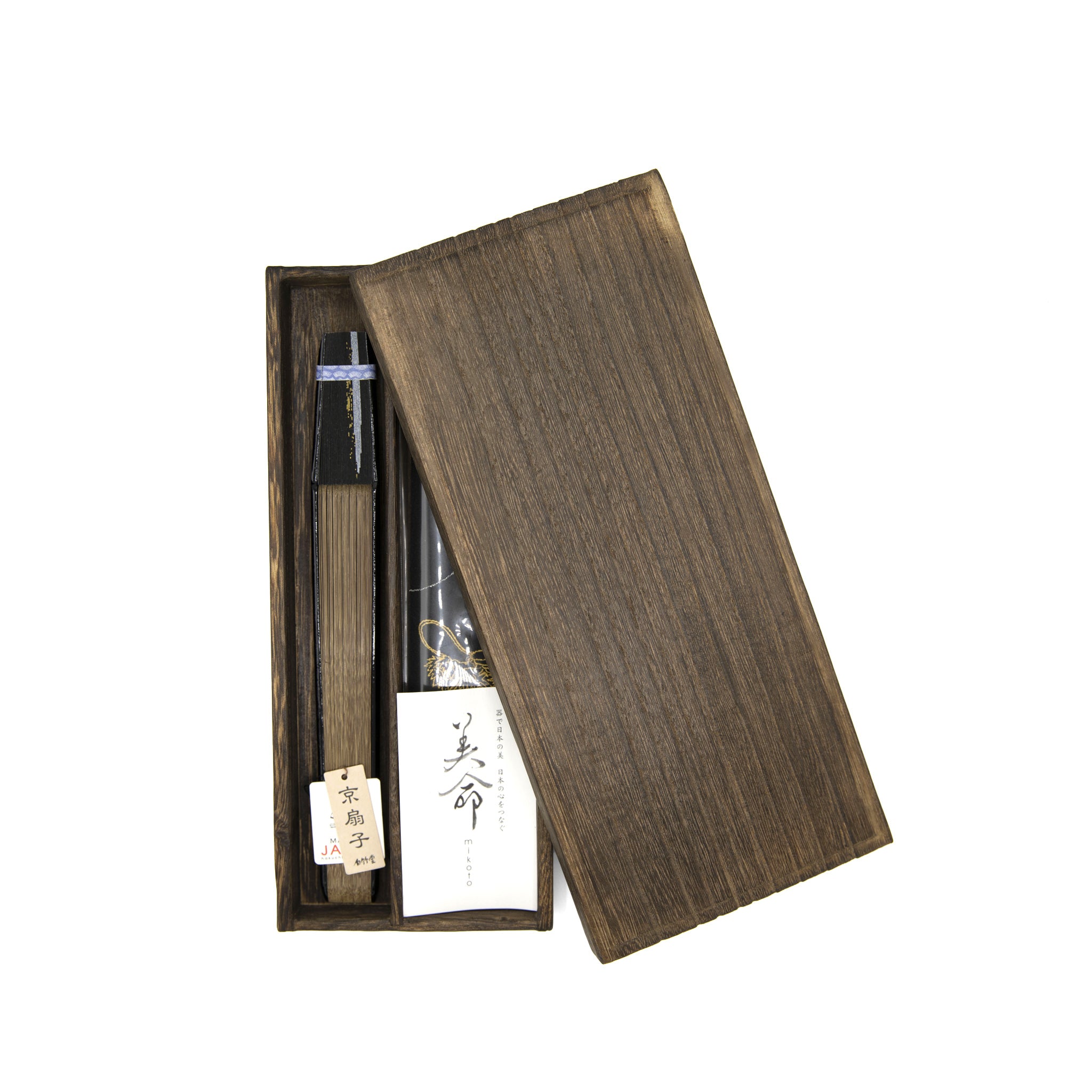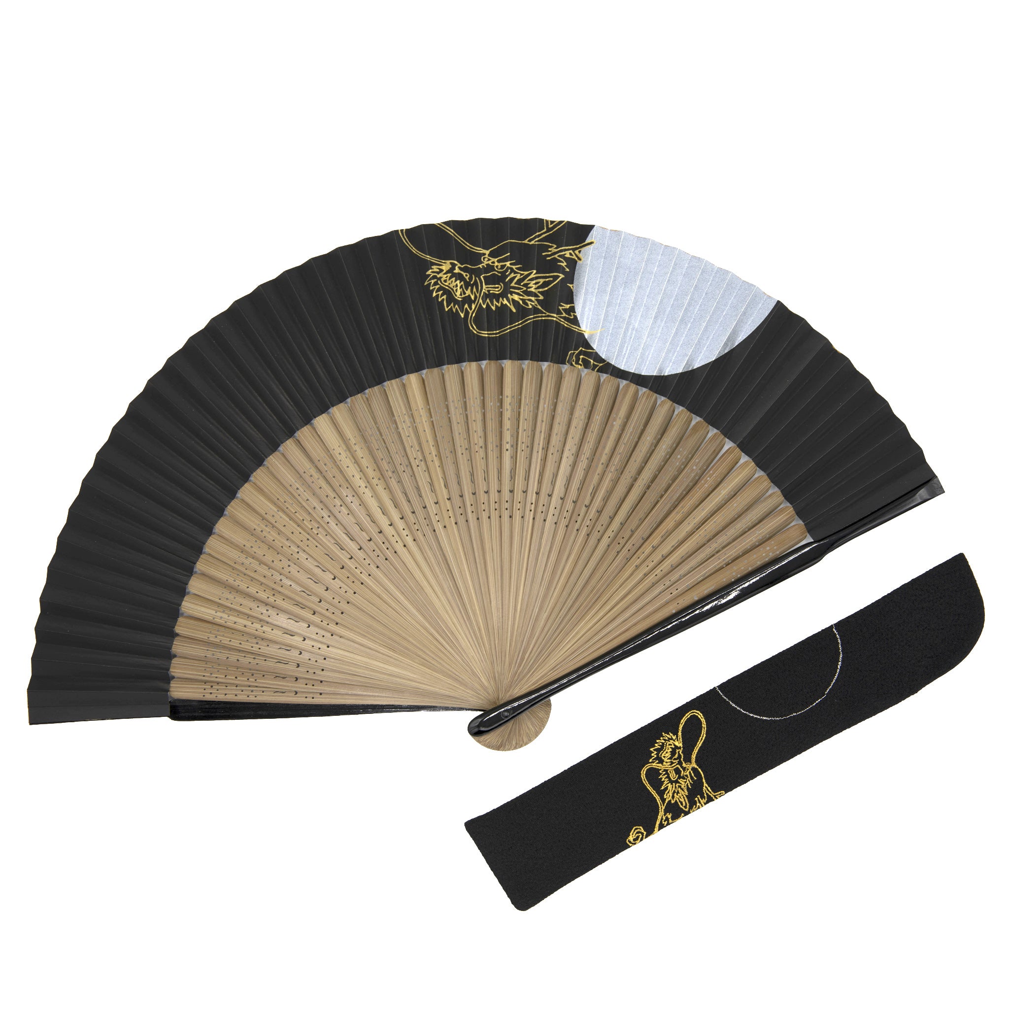 扇子袋は、シックな黒のちりめん生地に扇子と同じモチーフの刺繍入り。