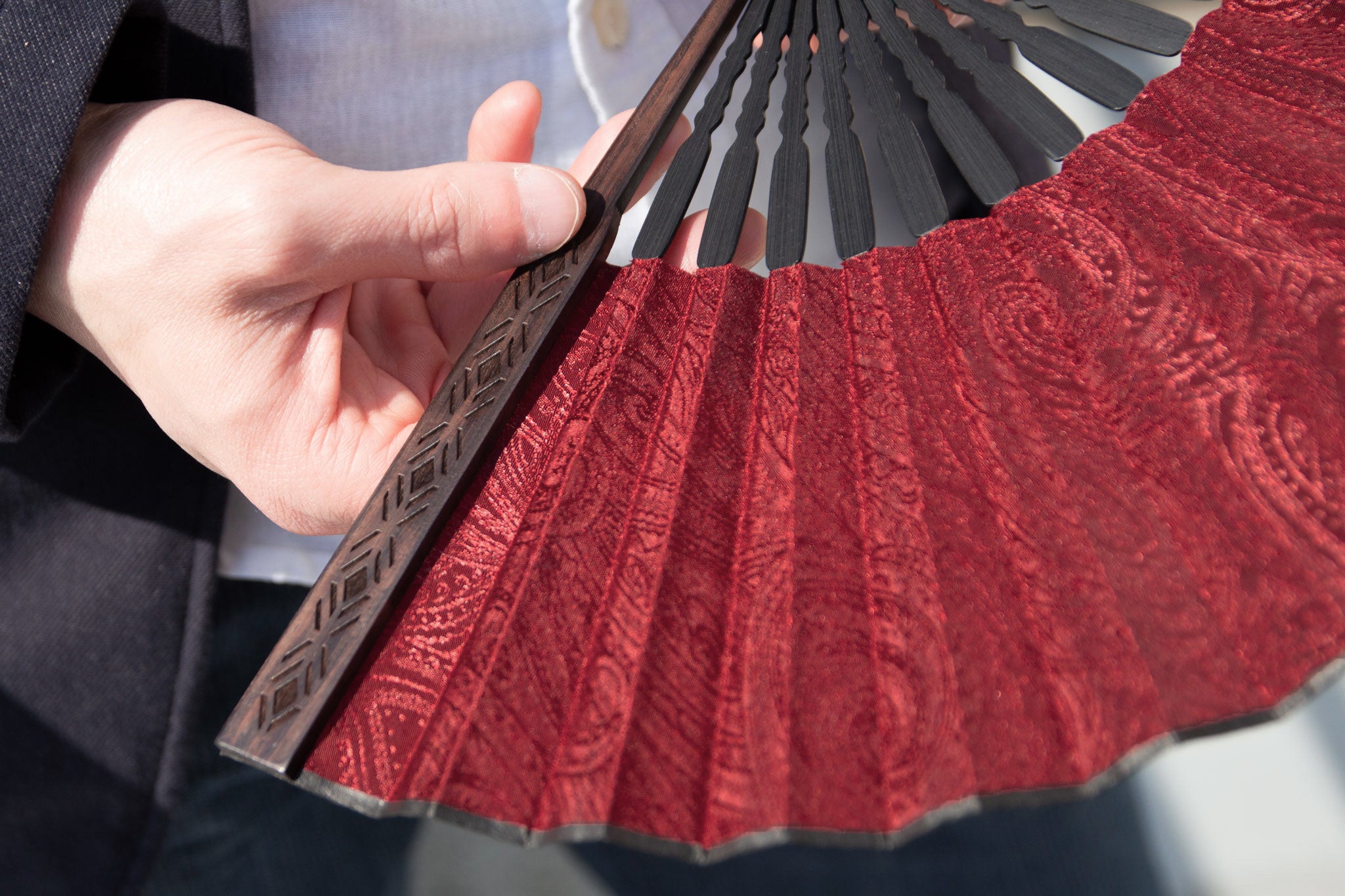 扇面には、ペイズリー柄が織り込まれた光沢感のあるジャガード生地を使用し、深みのある色味が気品漂う逸品です。
