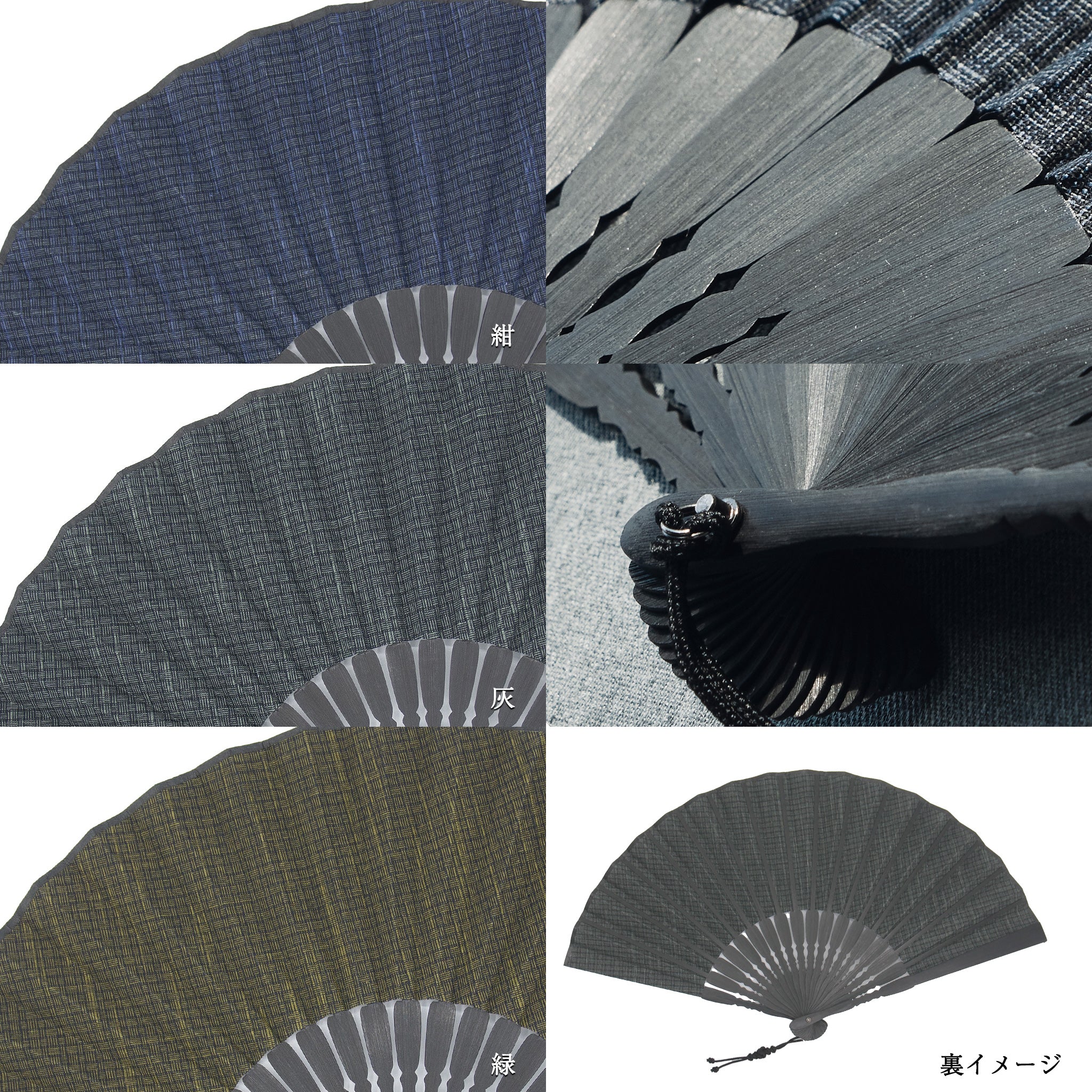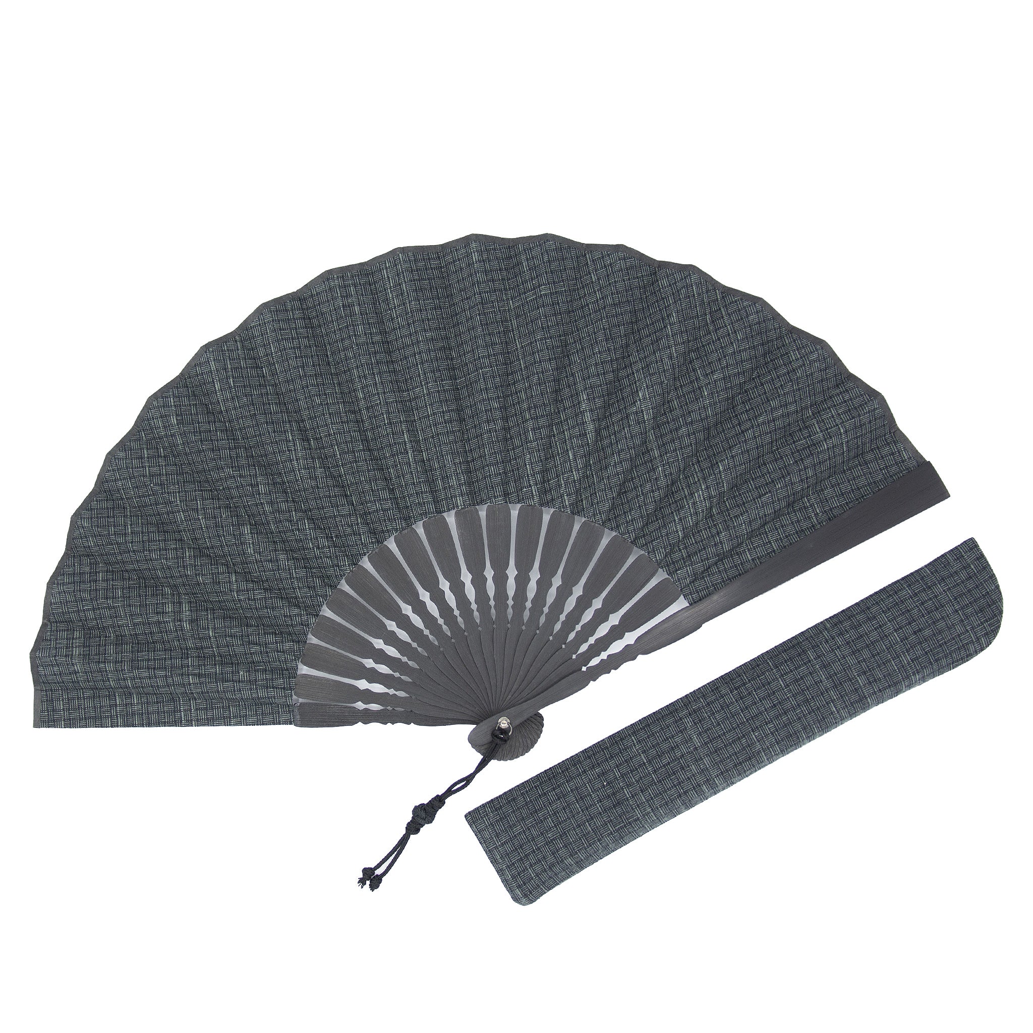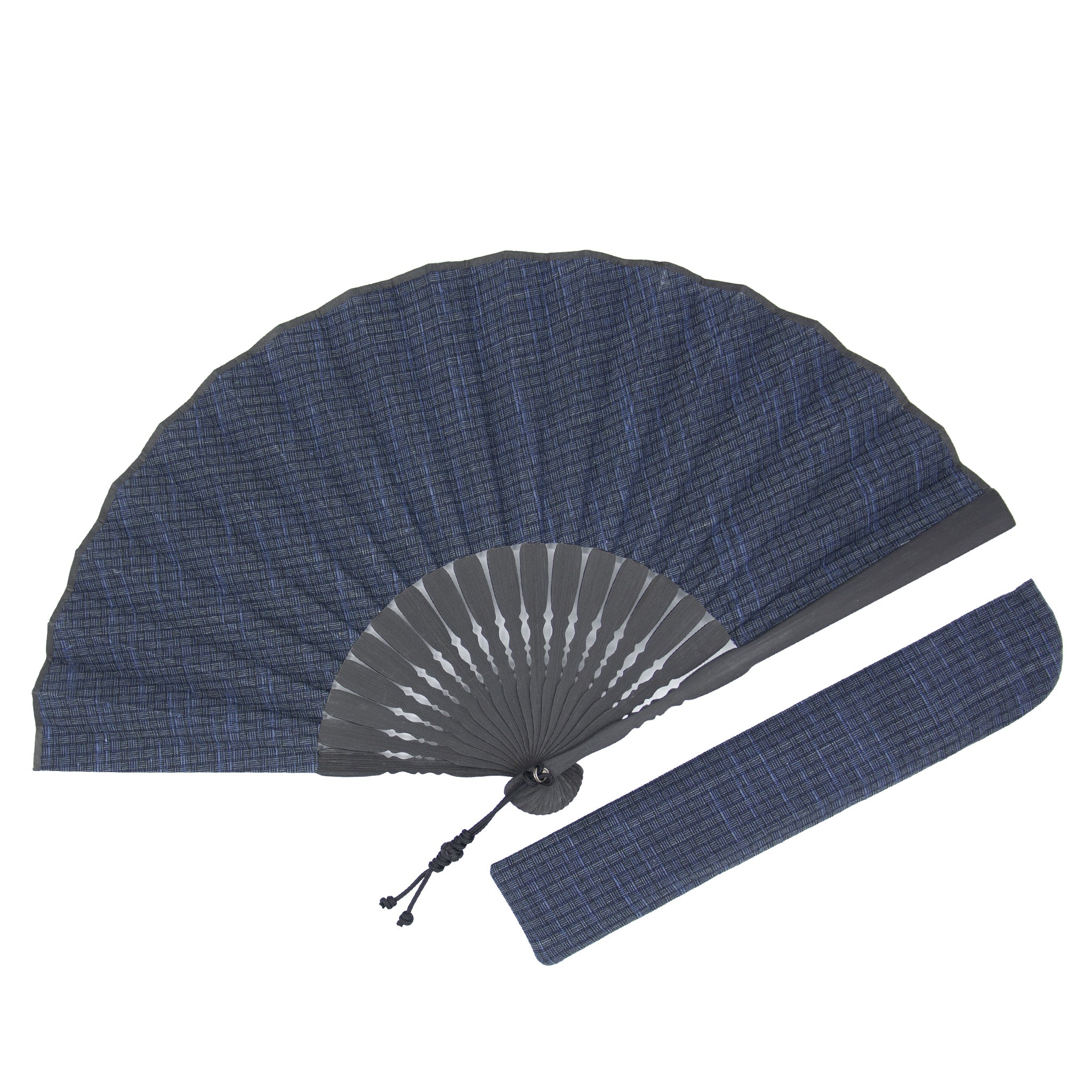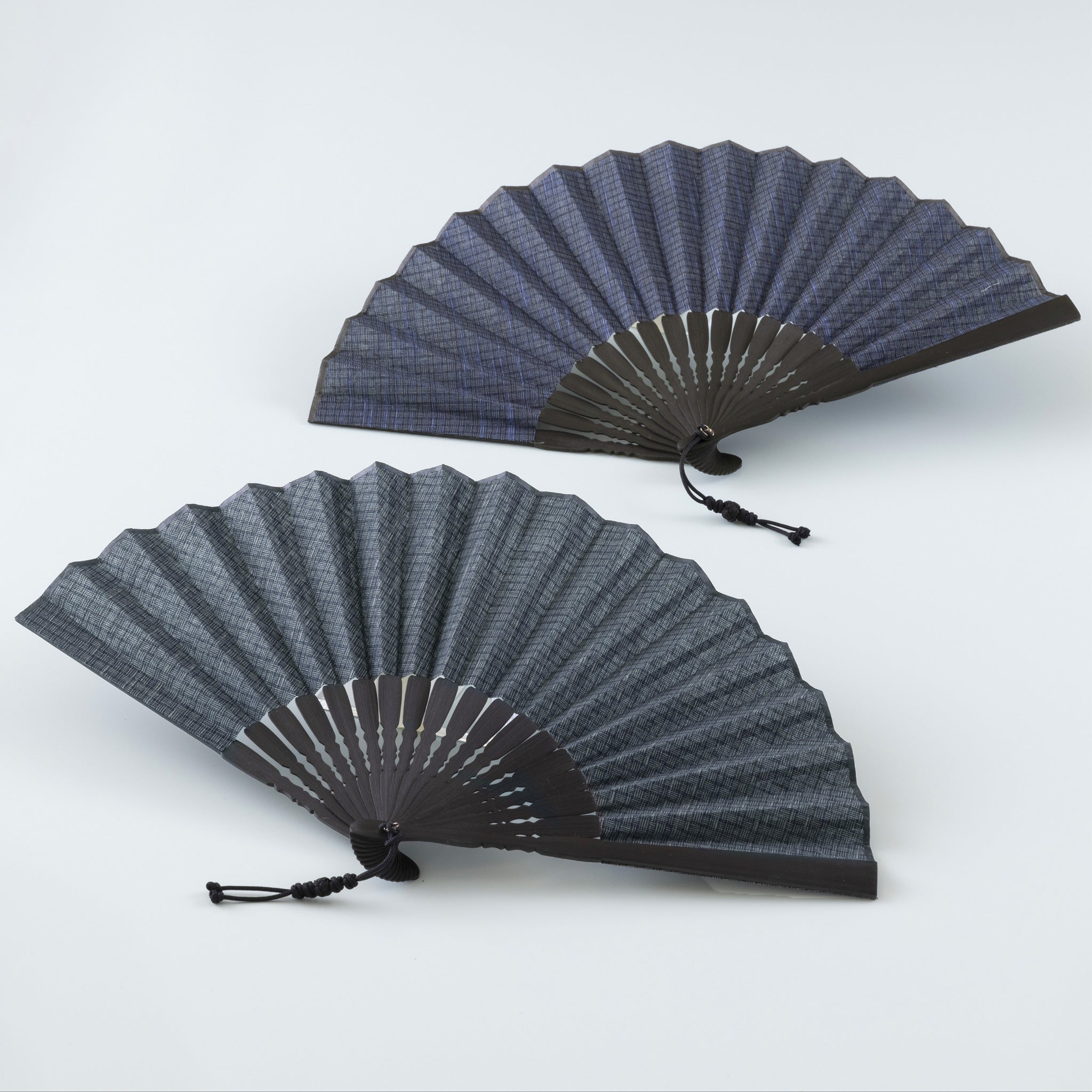 紬絣(つむぎかすり)調の生地と太めの扇骨を組み合わせた、シンプルながらも重厚感ある扇子。