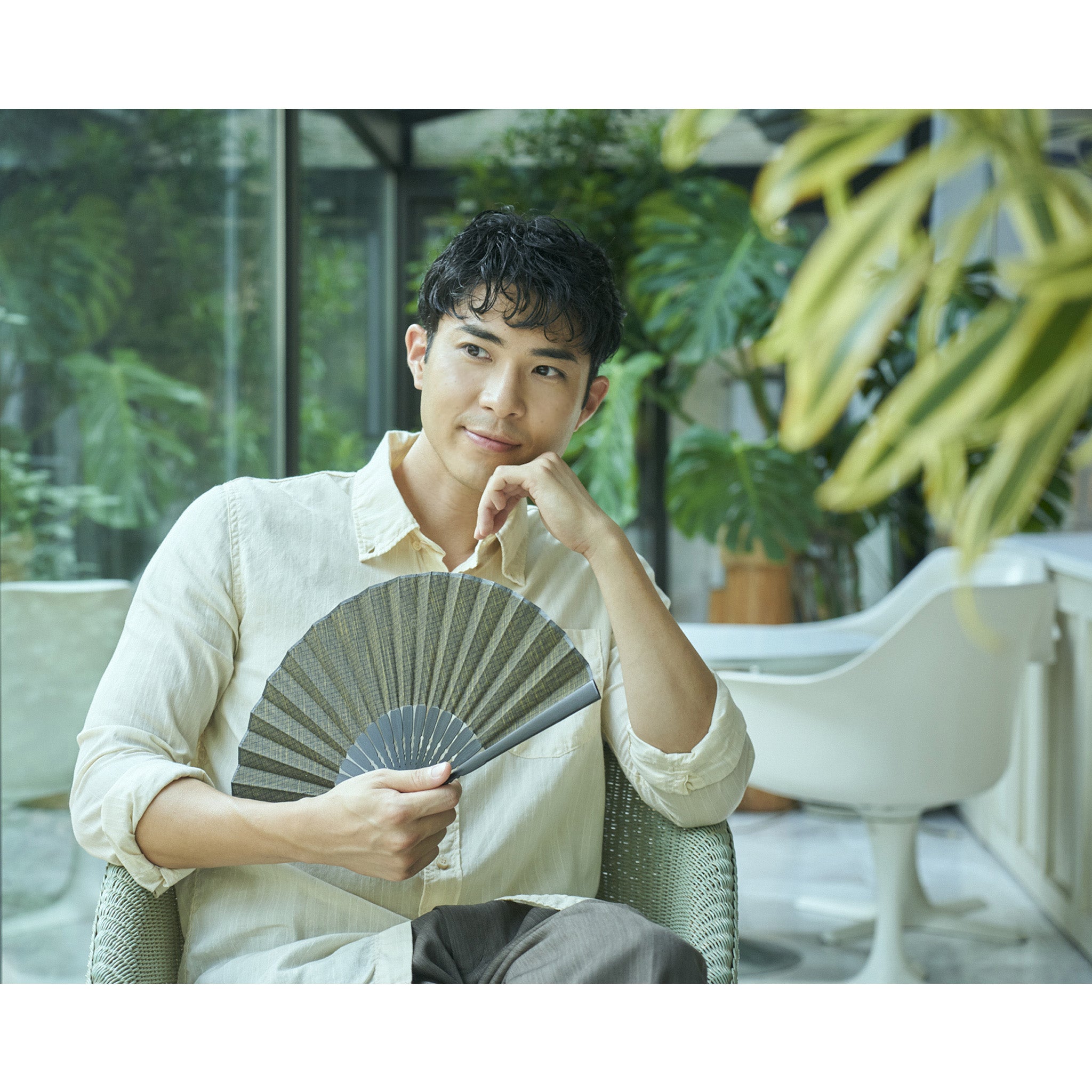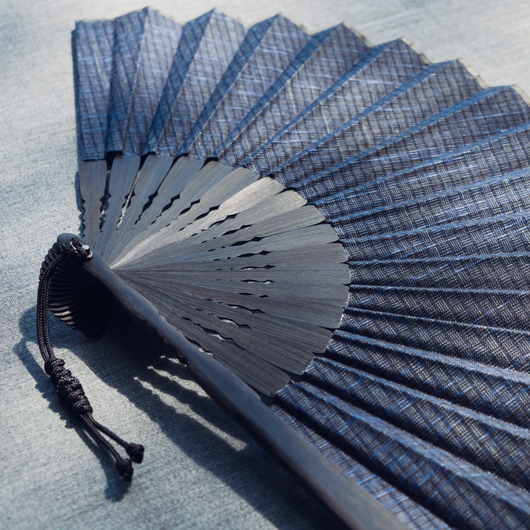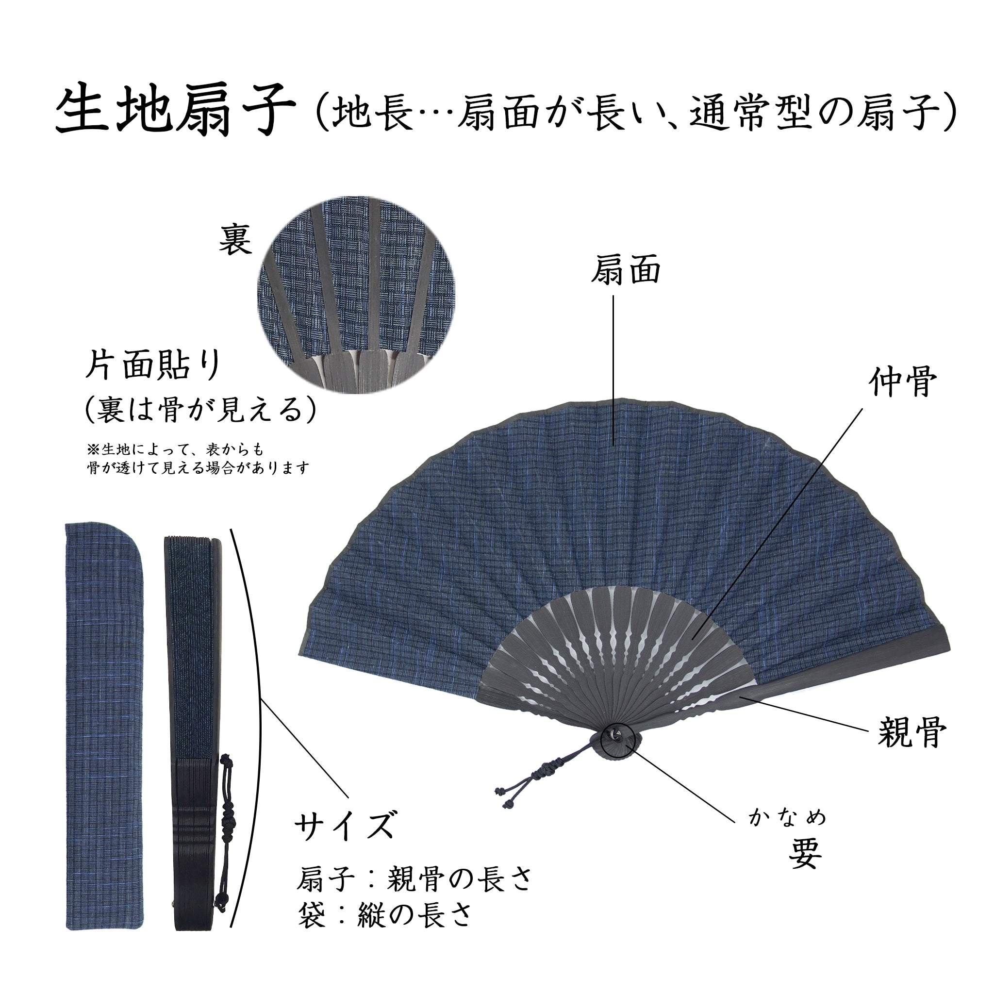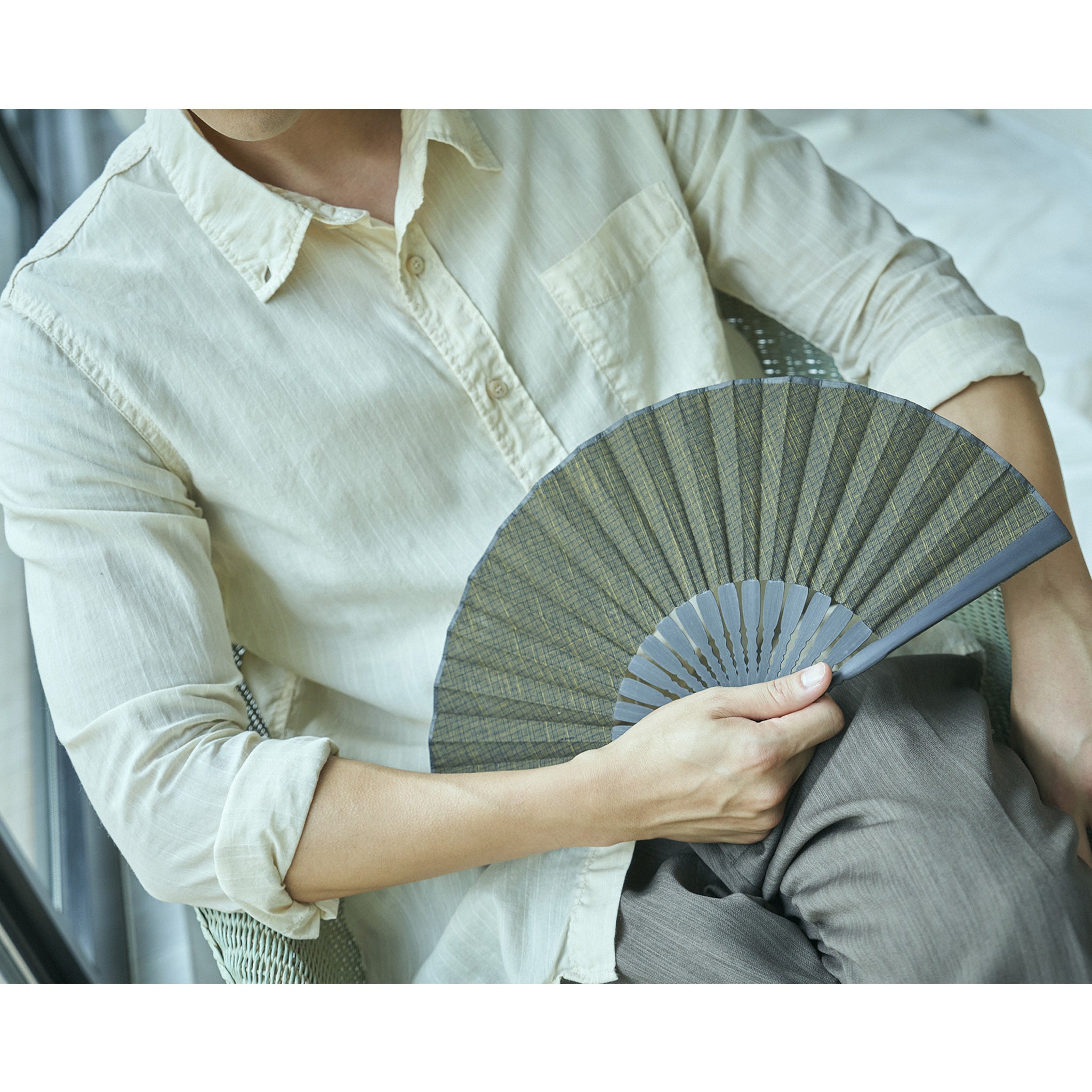 紬絣(つむぎかすり)調の生地と太めの扇骨を組み合わせた、シンプルながらも重厚感ある扇子。