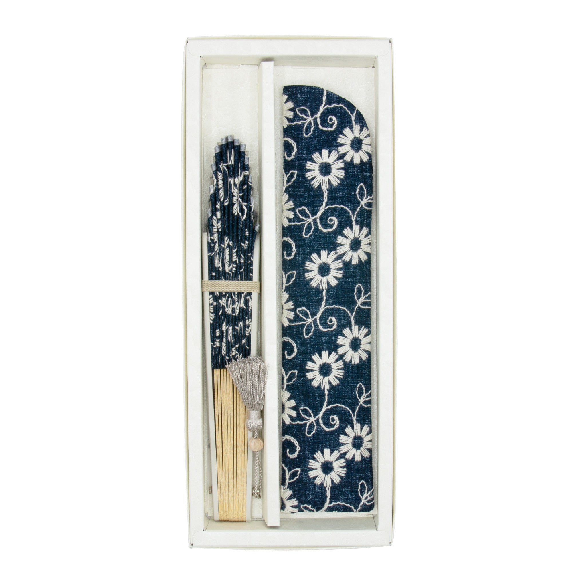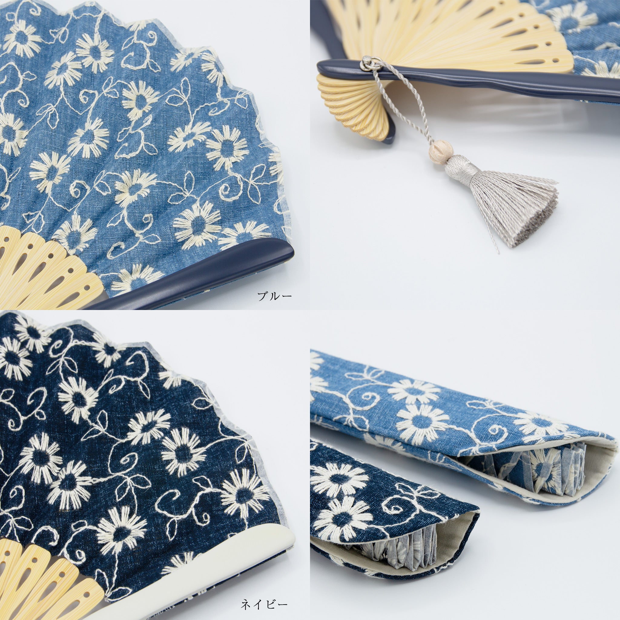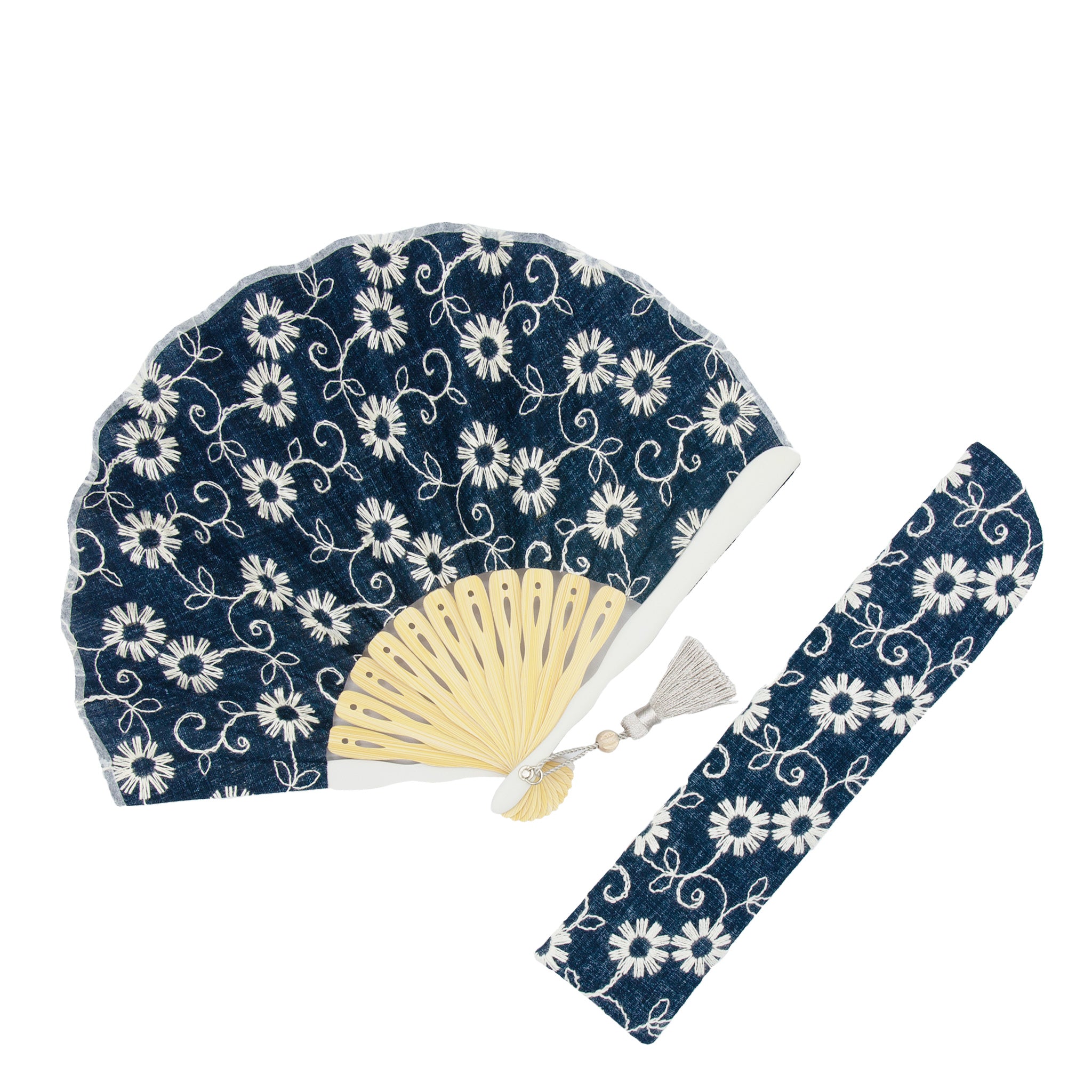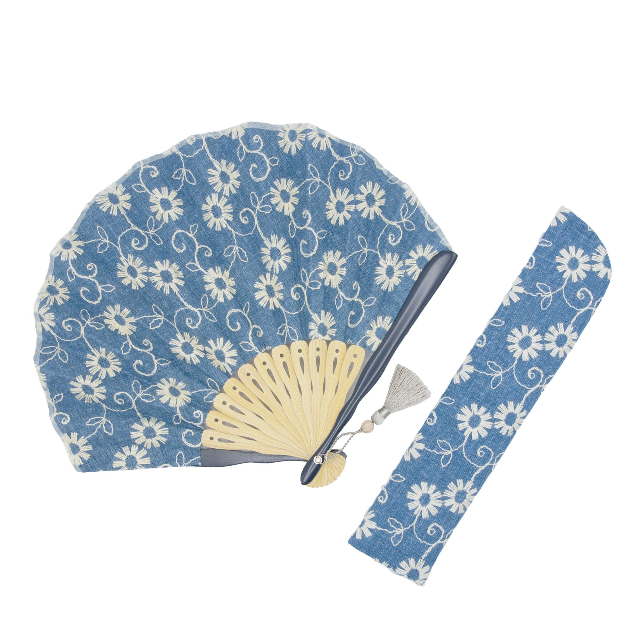 デニム風の生地に花柄刺繍が目を惹くコットンレースのモダン扇子。扇面に合わせた落ち着いた色合いの親骨と相まって、年代問わずファッションに取り入れやすい扇子です。