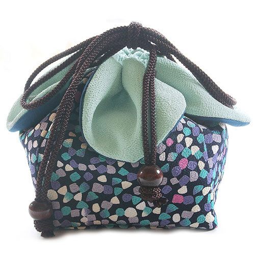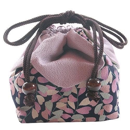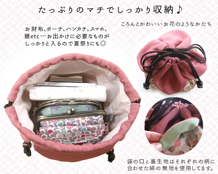浴衣や着物にぴったりな花巾着です。ちりめん生地を使用した大人かわいく上品なデザイン。がまぐちやポーチ、スマホなど必要なものをまとめて入れてお出かけしませんか?