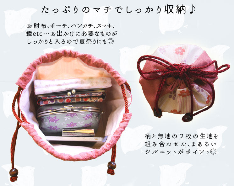浴衣や着物にぴったりな丸巾着です。ちりめん生地を使用した大人かわいく上品なデザイン。がまぐちやポーチ、スマホなど必要なものをまとめて入れてお出かけしませんか?