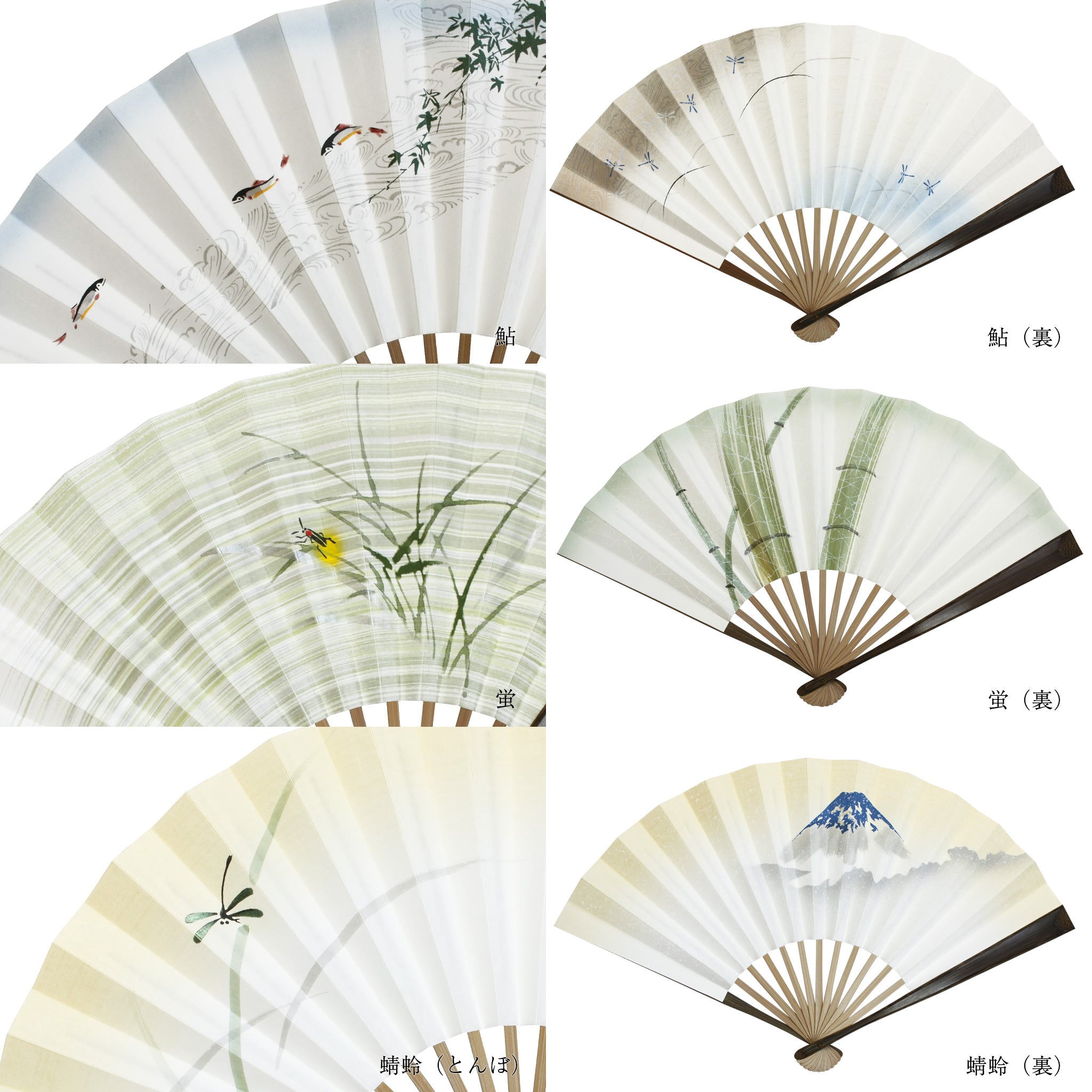 鮎の裏面には蜻蛉、蛍の裏面には竹、蜻蛉の裏面には富士山が描かれています。