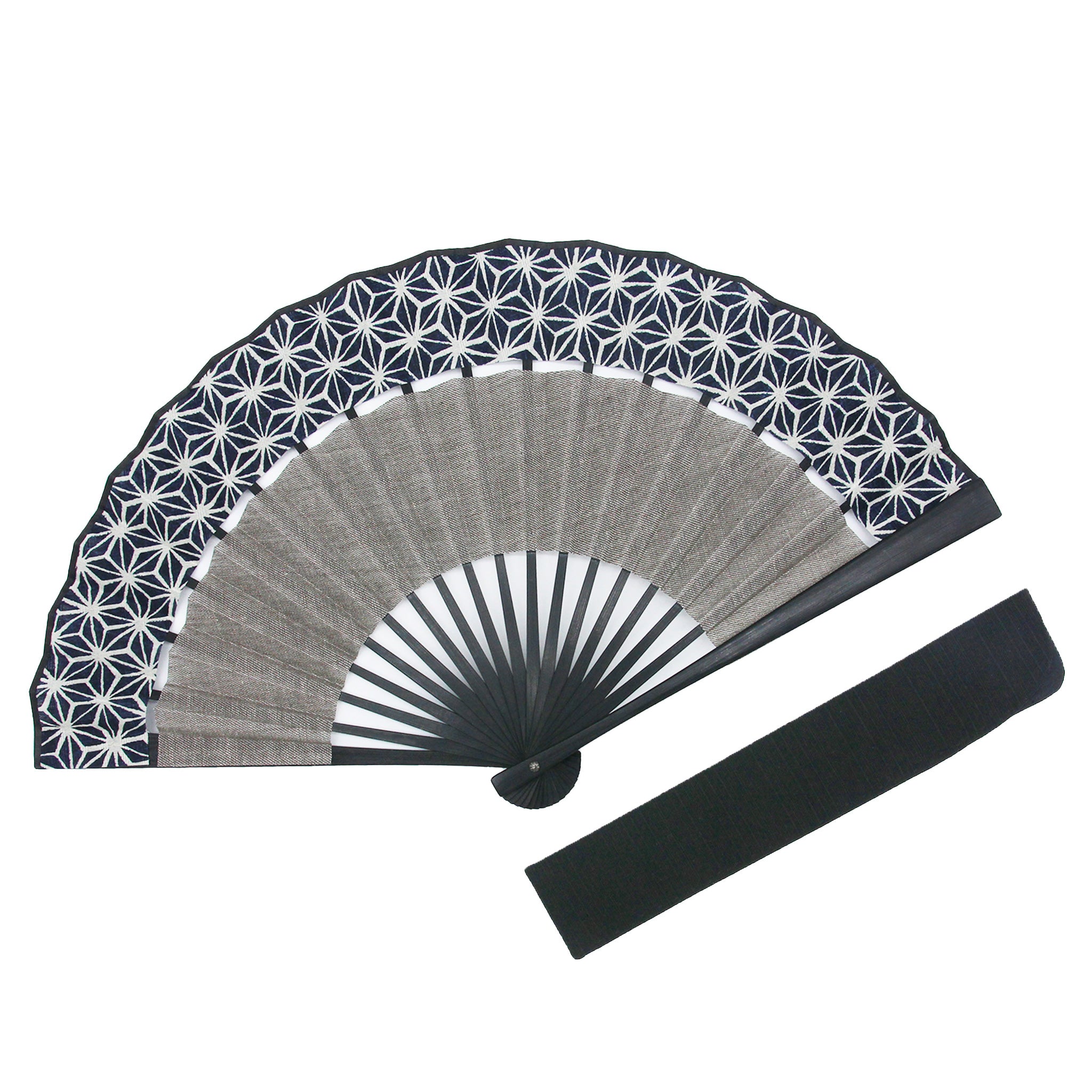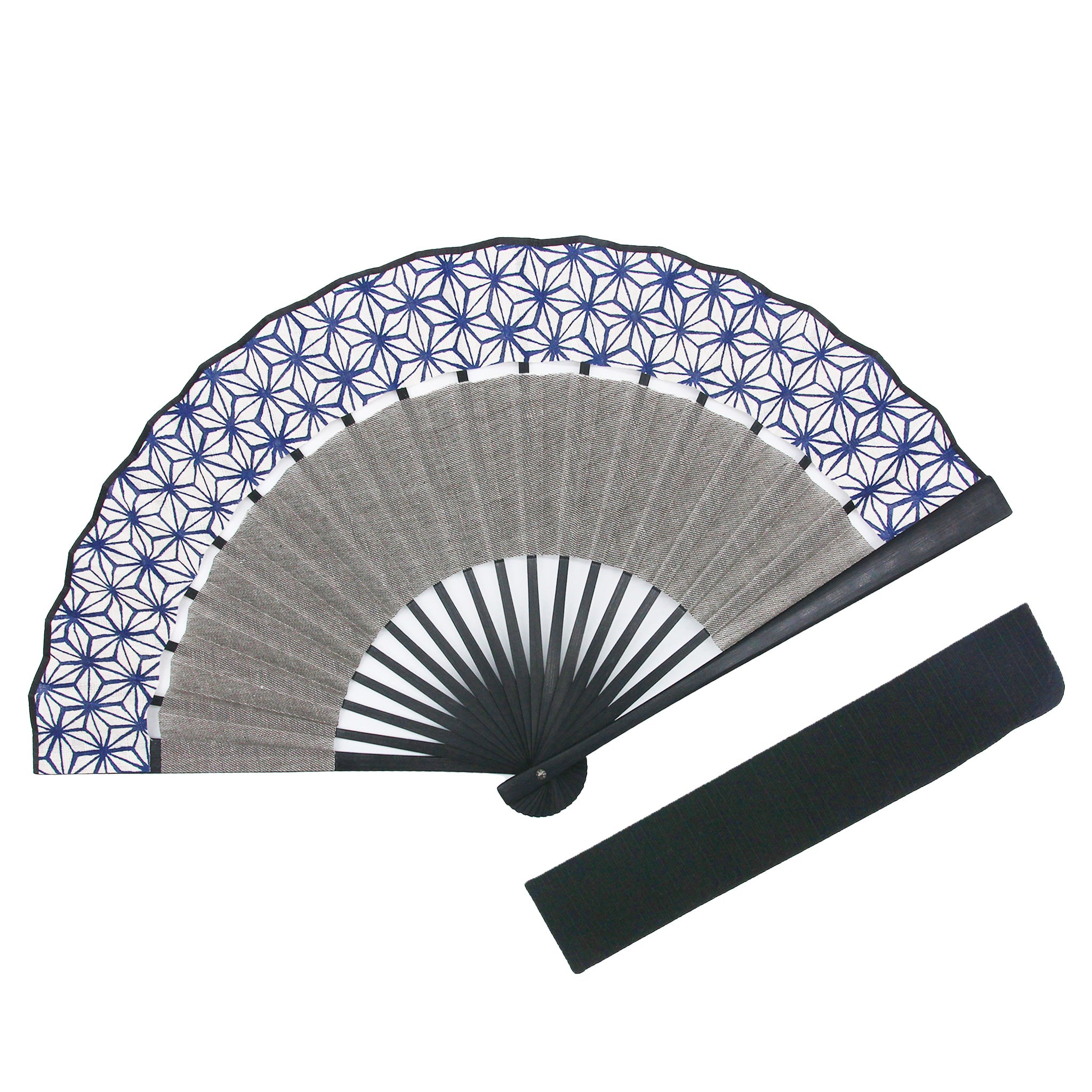 麻の葉模様の上段と、シンプルなグレー生地の下段に分かれた扇面が印象的。