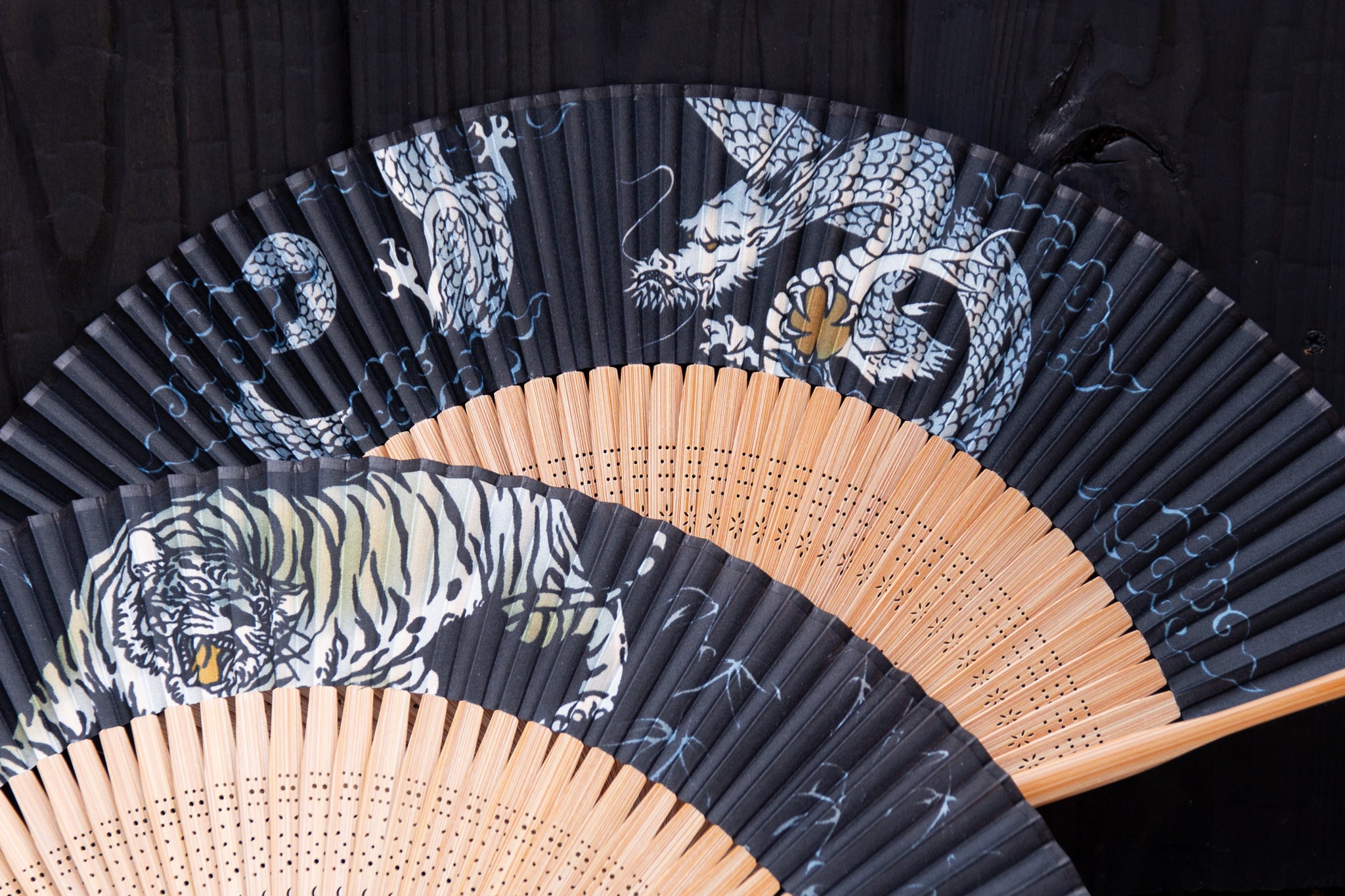 扇面に迫力ある姿の虎と龍がそれぞれあしらわれた、唐木の扇骨を用いた短地型の扇子。