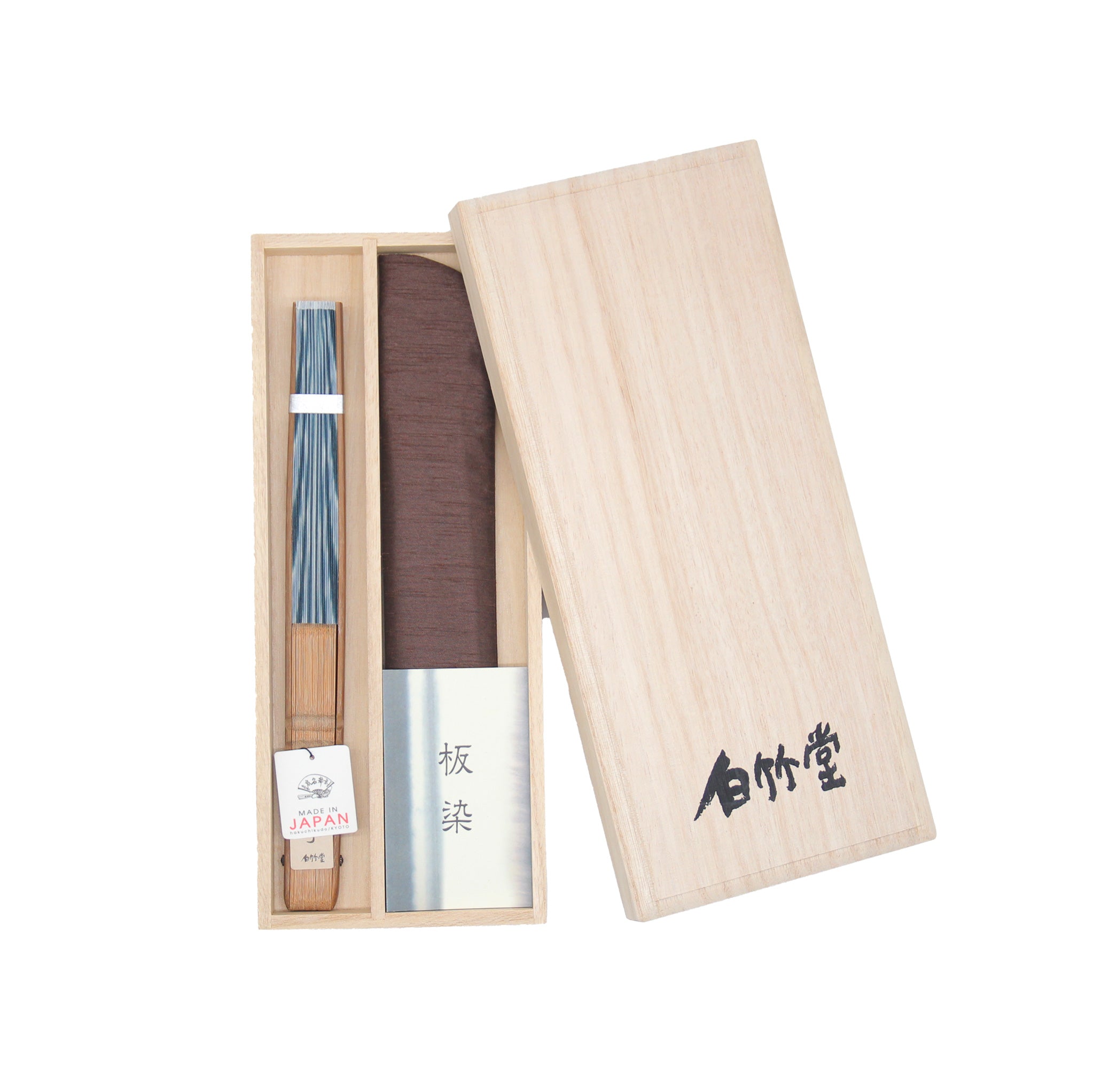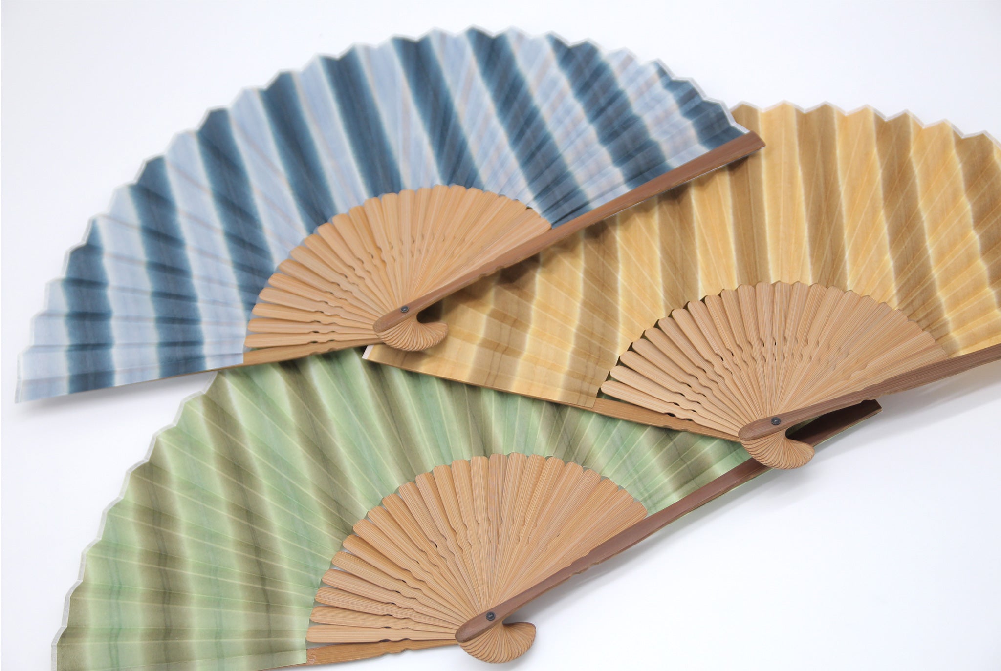 阿波和紙を折りたたみ、板を挟んで辺や角を染め上げる「板締め絞り」と呼ばれる染色技法を用いた京扇子。