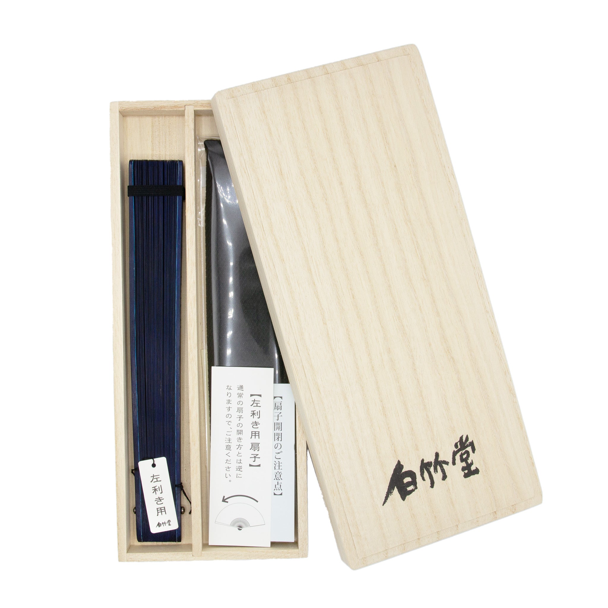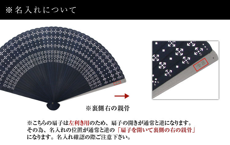 こちらは左利きの方が使いやすいよう、扇子の開く向きが通常とは逆となっております。開閉時にはご注意ください。