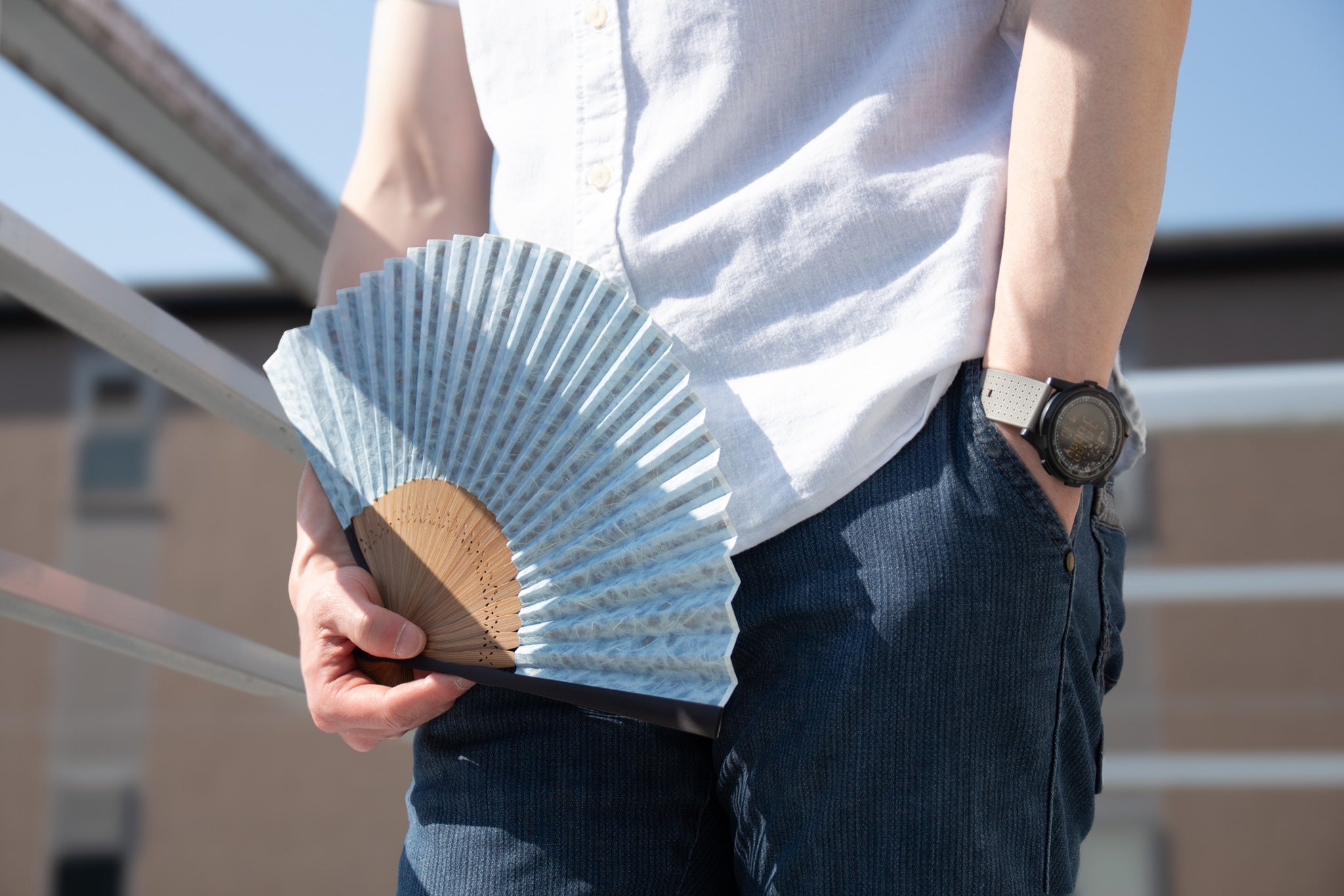 裏面にはシルクを貼り合わせており、落水和紙特有の涼し気な透け感を出しながらも、強度と風量を上げています。