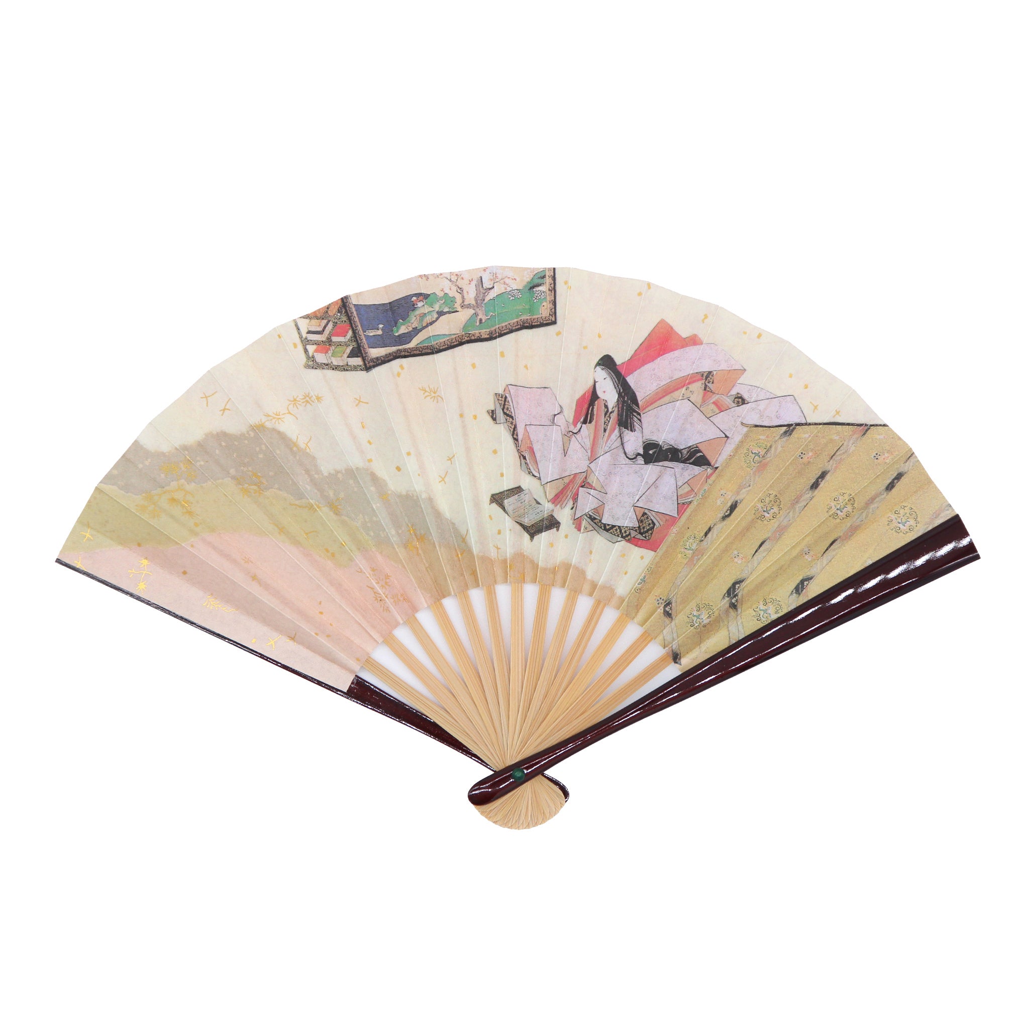 狩野探幽の歌仙絵をモチーフにして十二単姿で写本を紐解く女房を継ぎ紙に描き優雅な新年扇子に仕立てました。