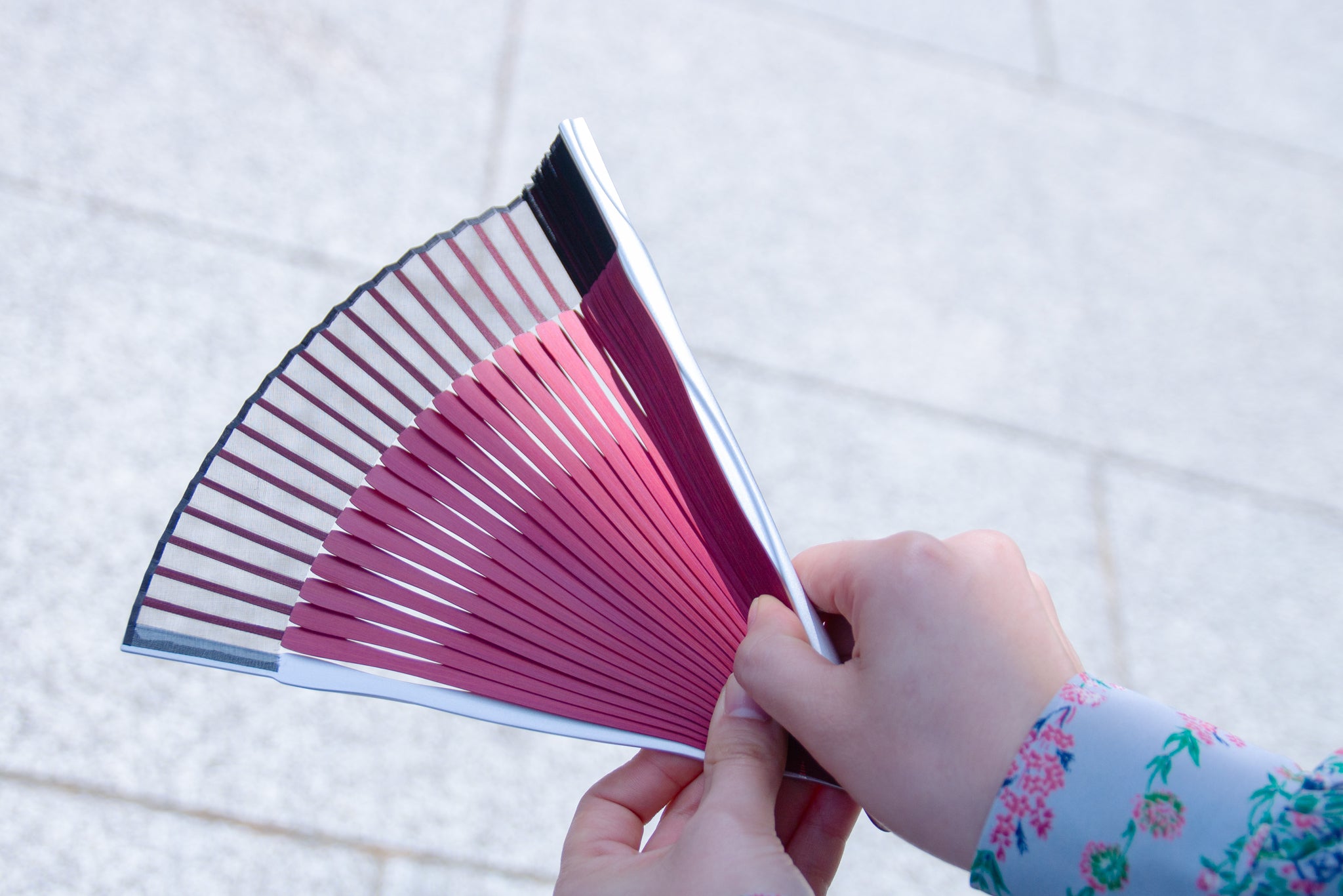 シルク生地の扇面の上品さとマロン染めの風合いは、開いた時の洗練さのみならず、扇子を閉じた時の質感のコントラストもお楽しみいただけます。