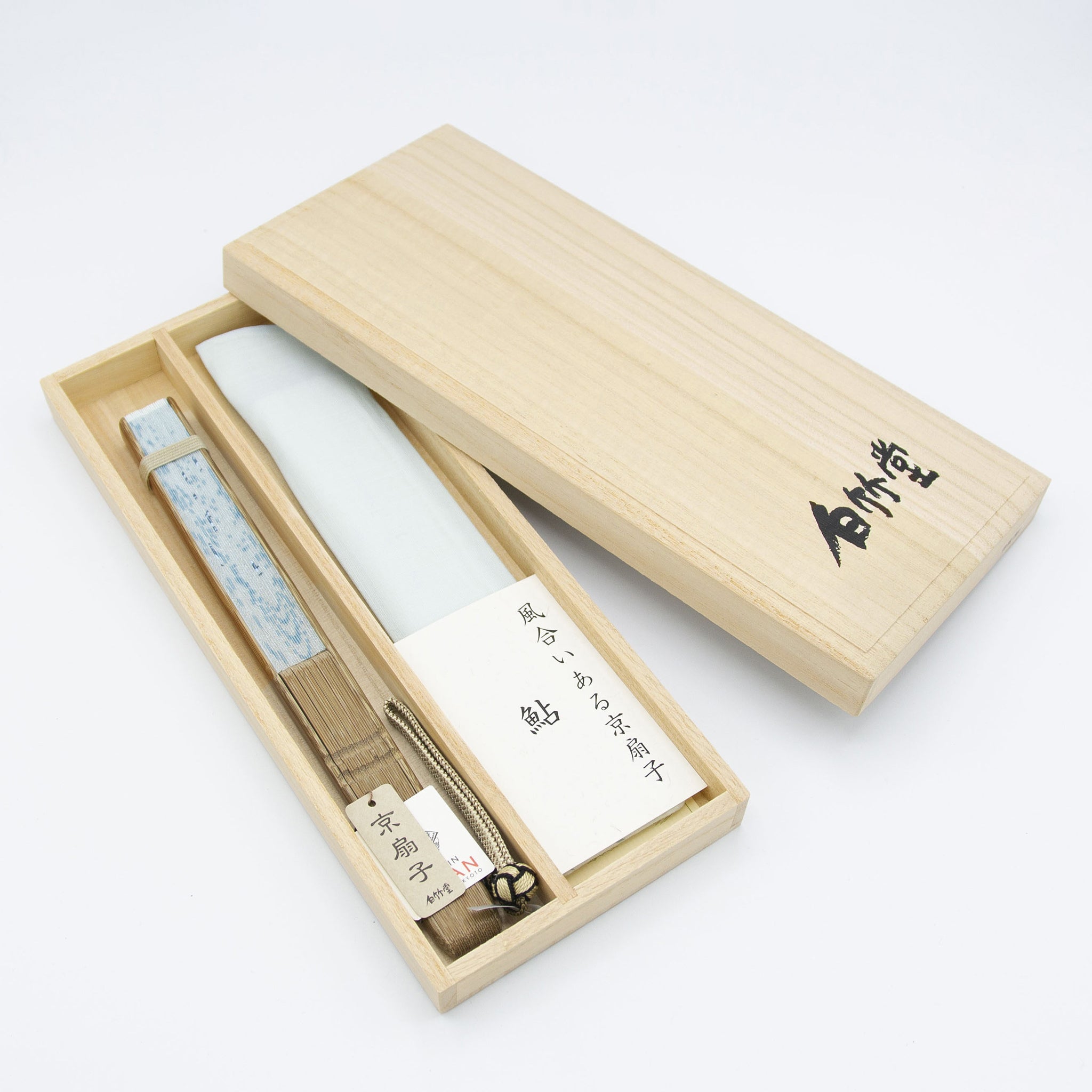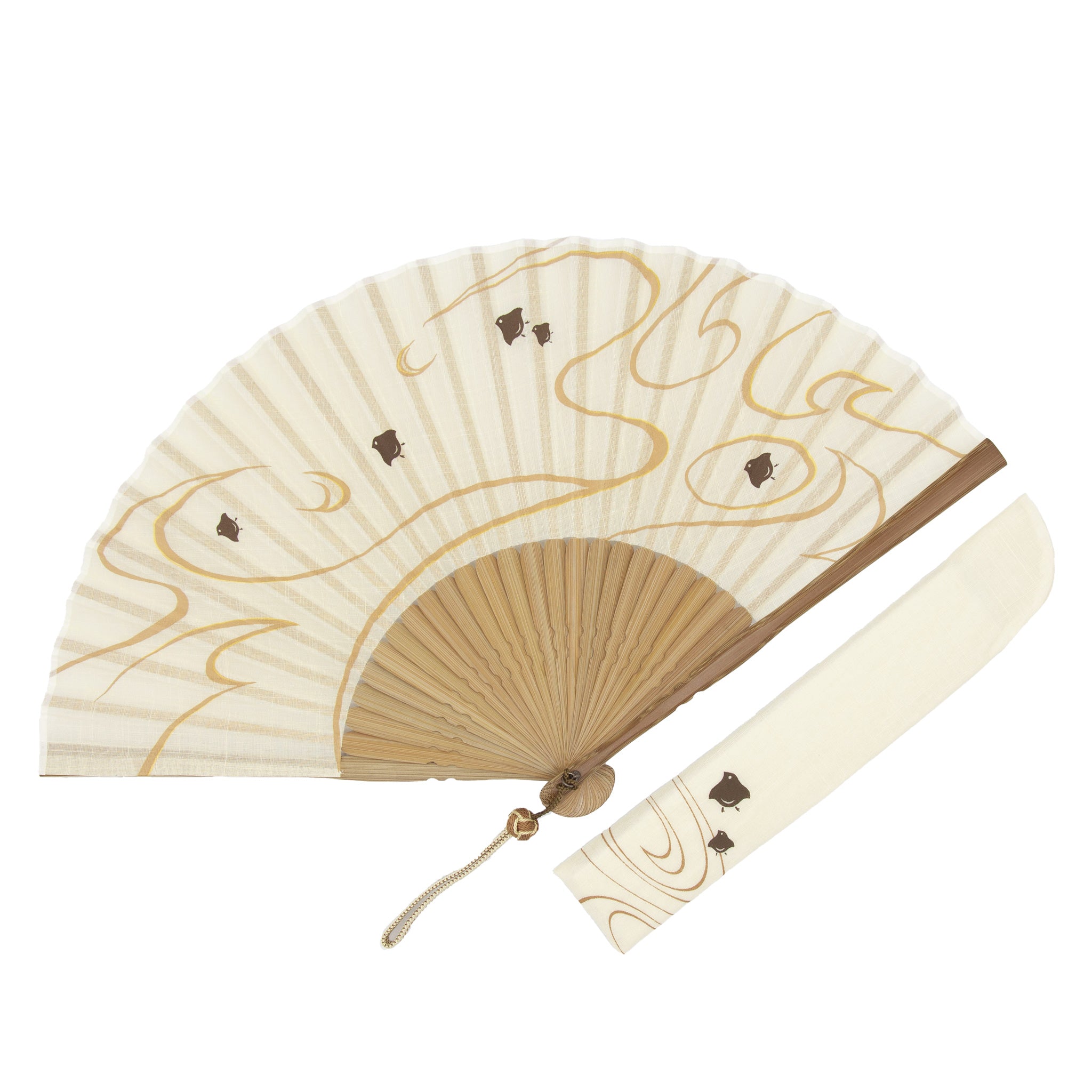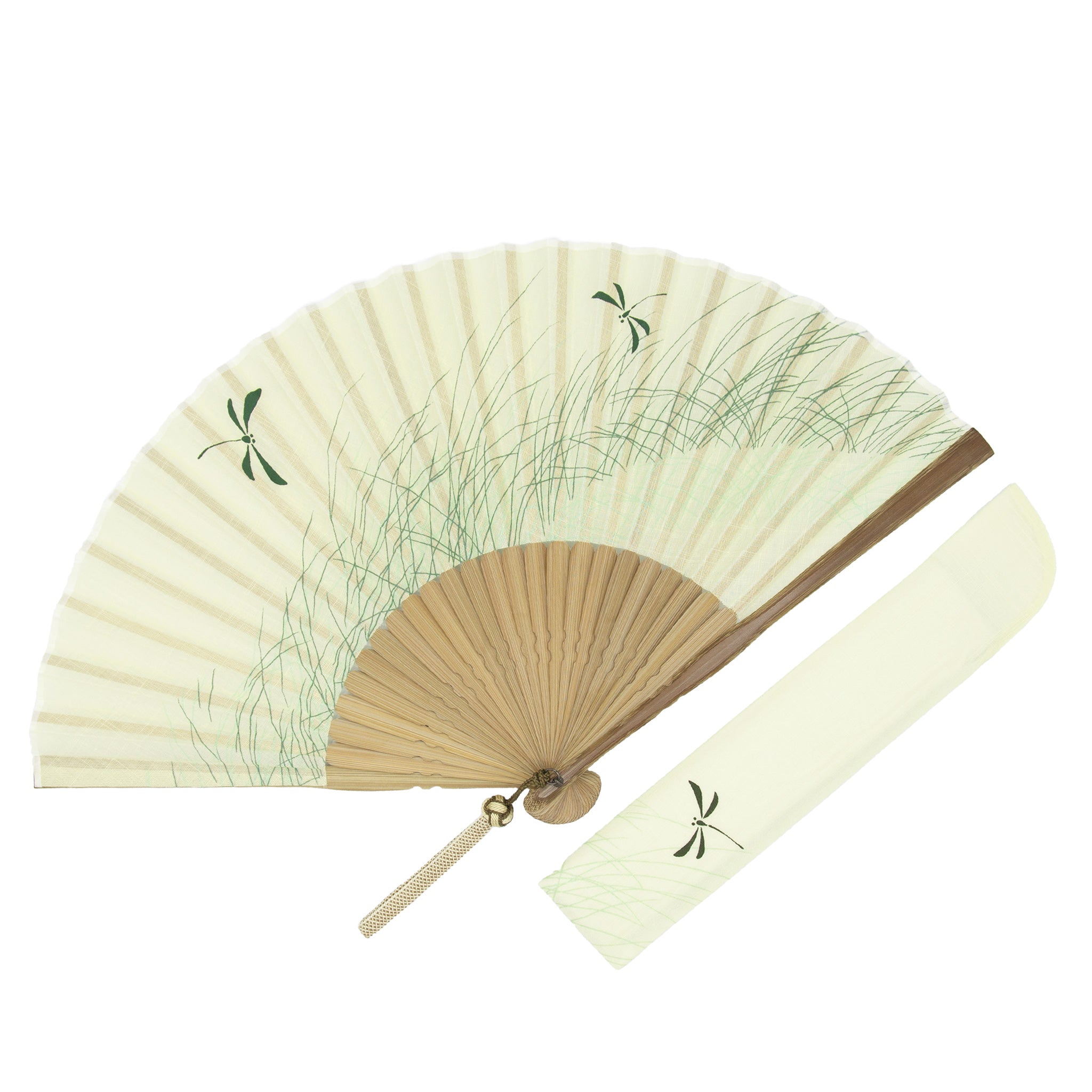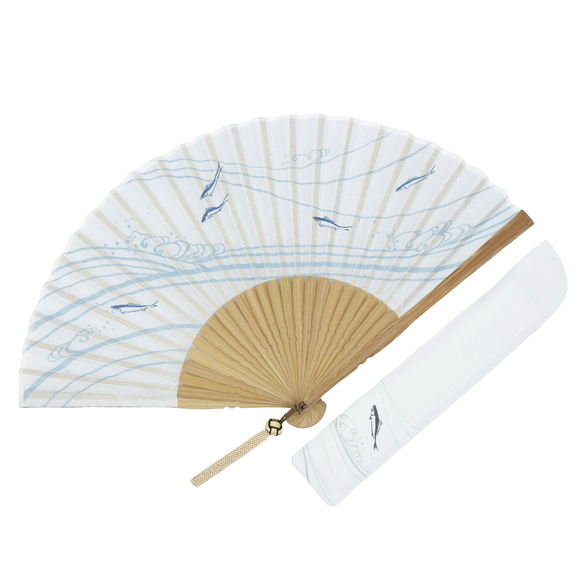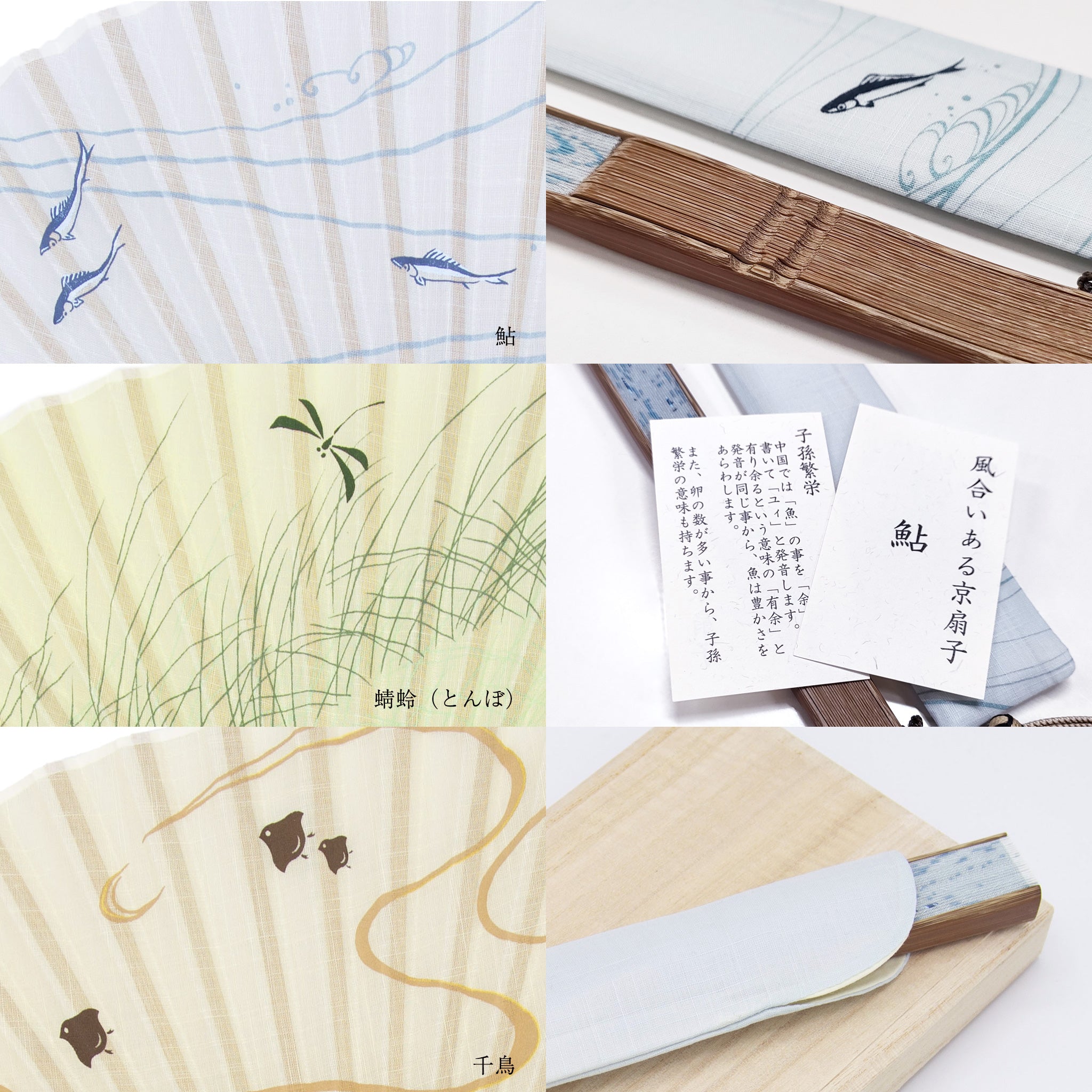 扇面は涼感のある綿麻生地に、縁起物である「鮎」「蜻蛉」「千鳥」がやわらかく描かれています。手持ち部分には正絹の京くみひものアクセサリー付き。