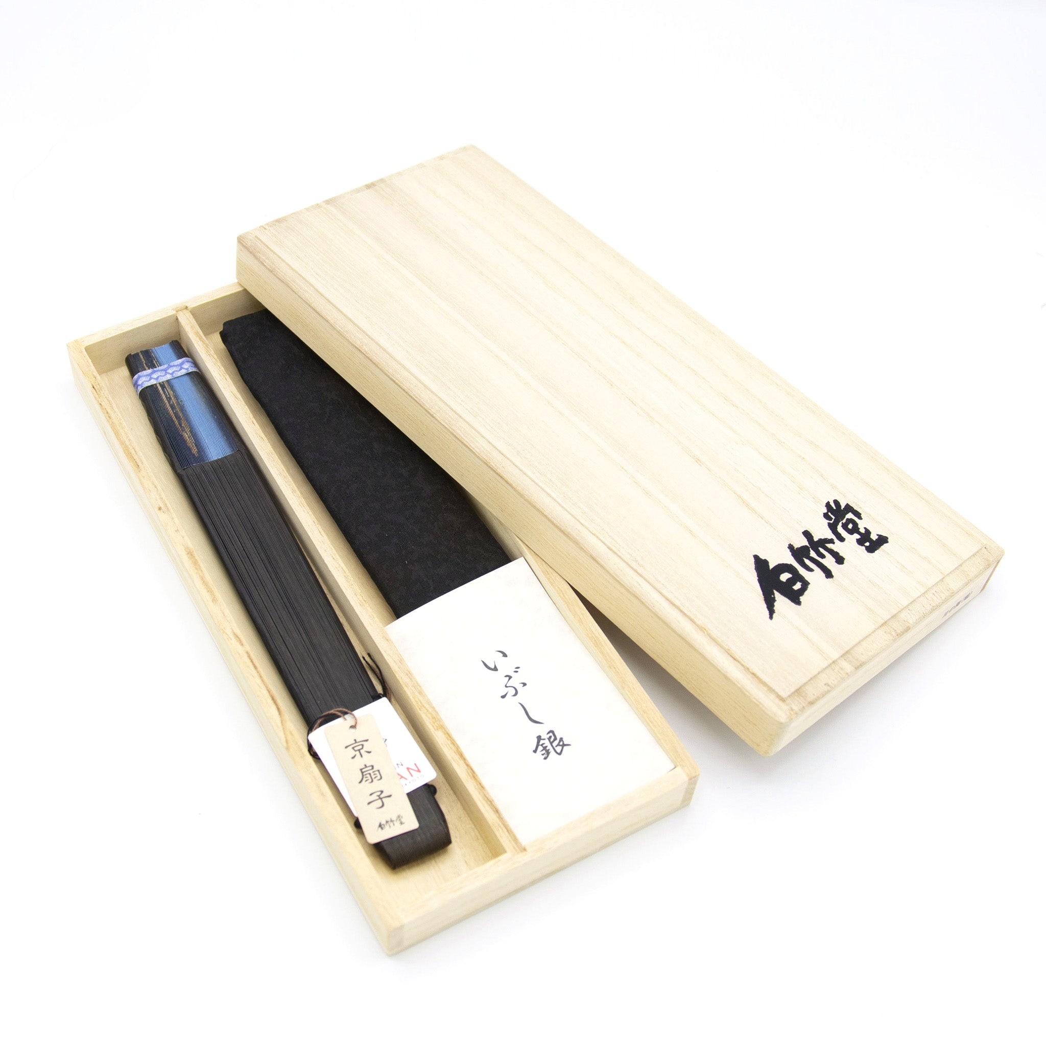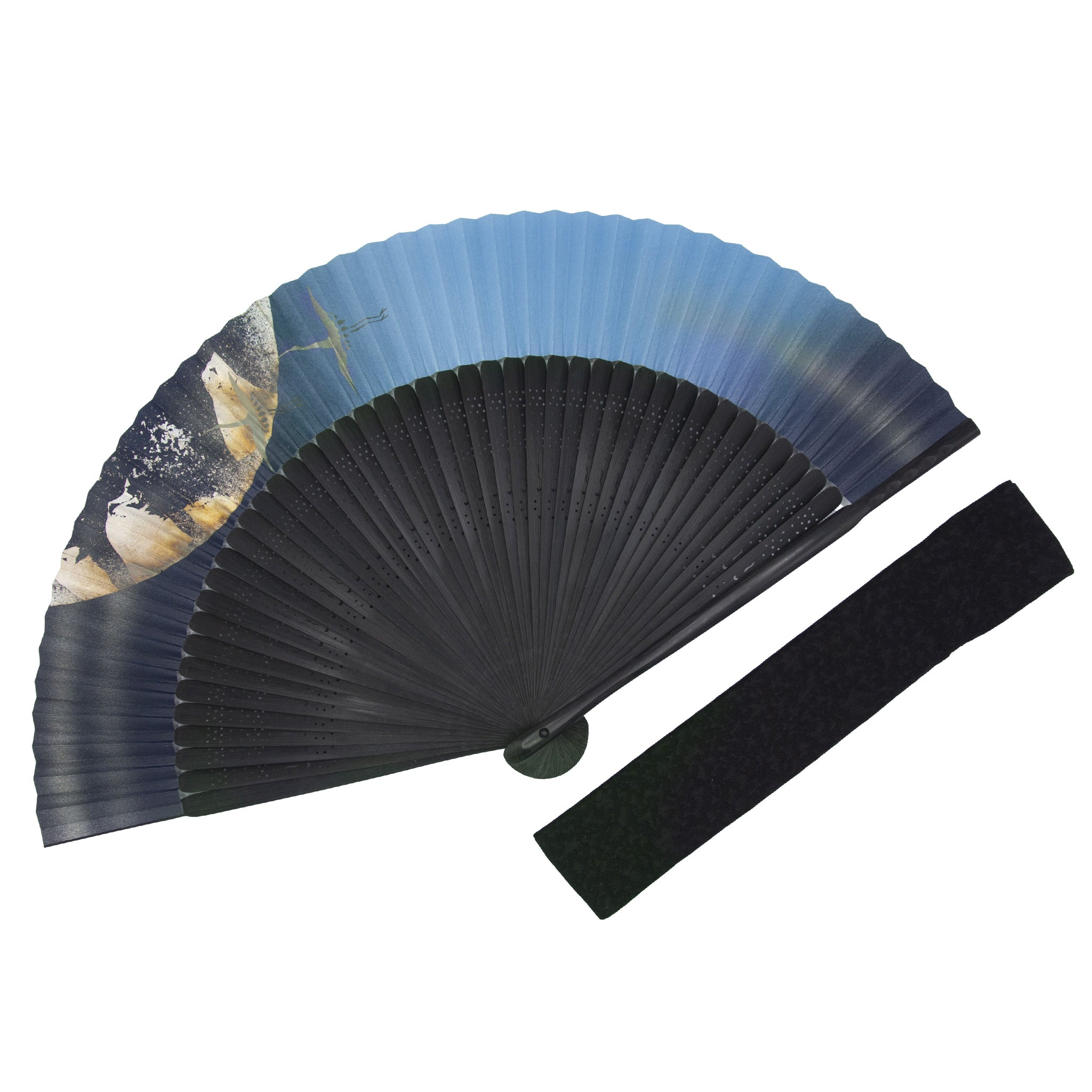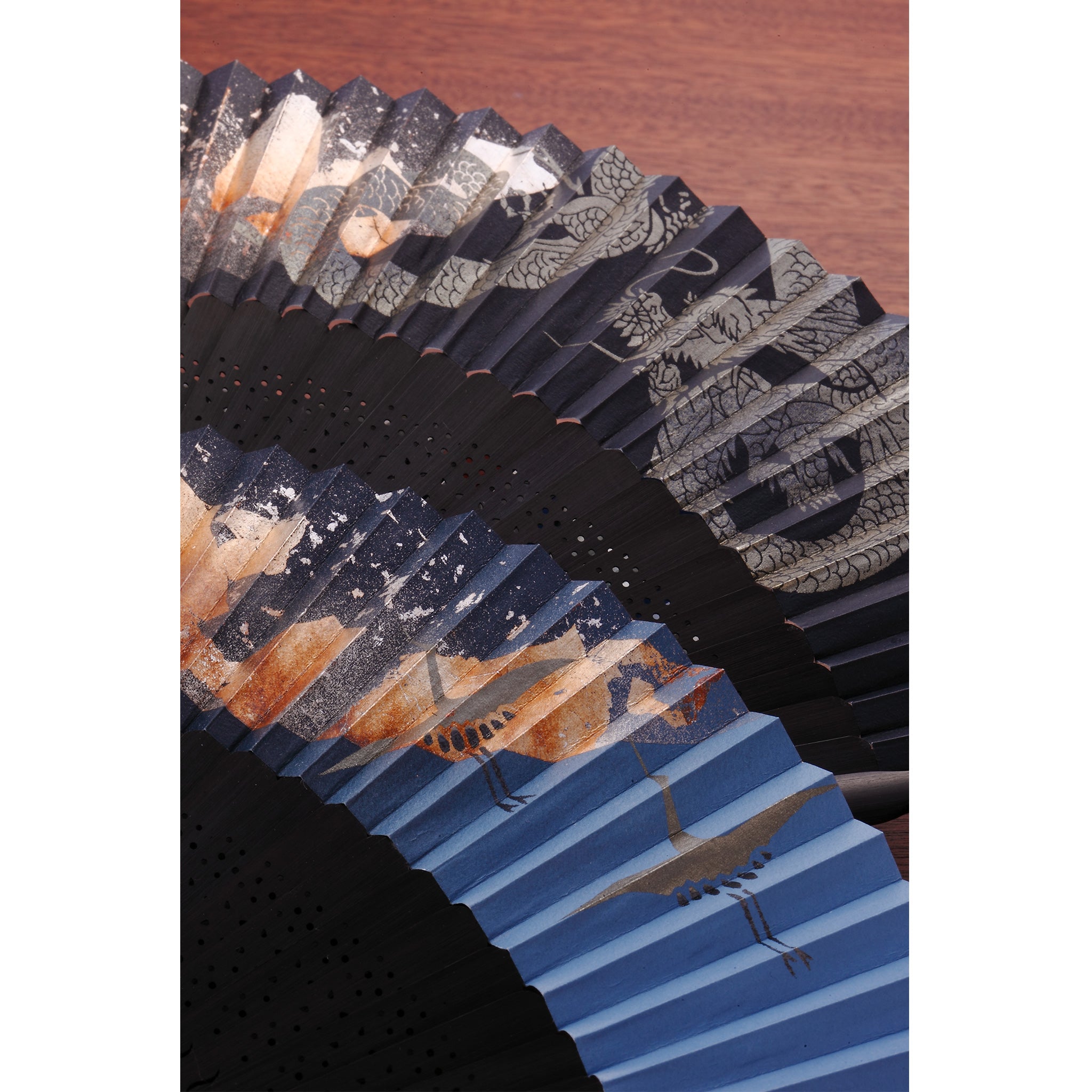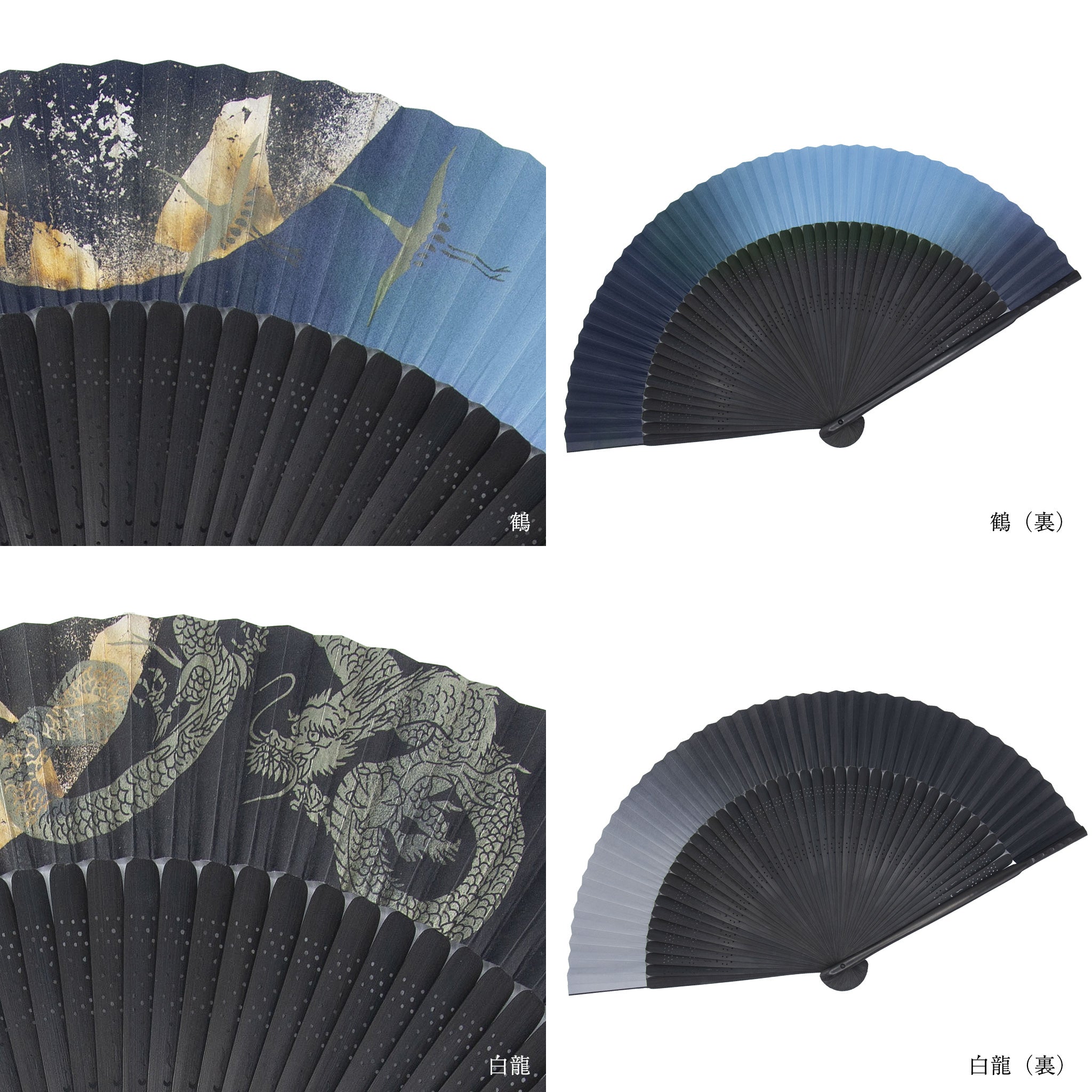銀箔を硫黄でいぶす「いぶし銀」という技法で、大きく月を表現し、その上に箔で「鶴」「龍」の姿を描いた京扇子。裏面のシンプルなグラデーションもまた美しいです。