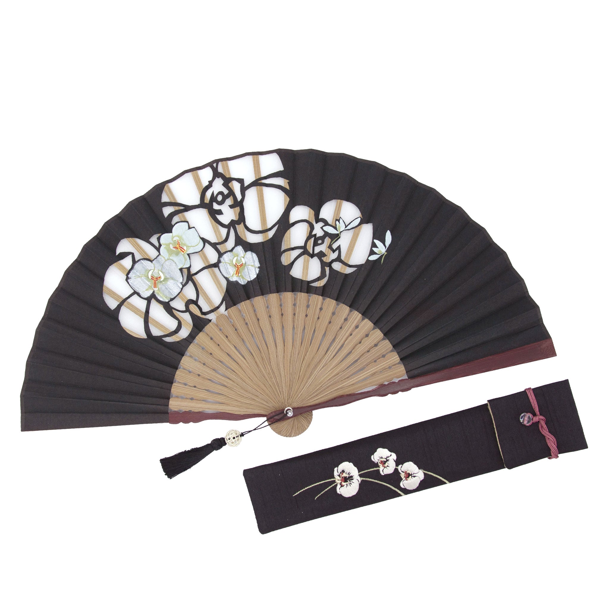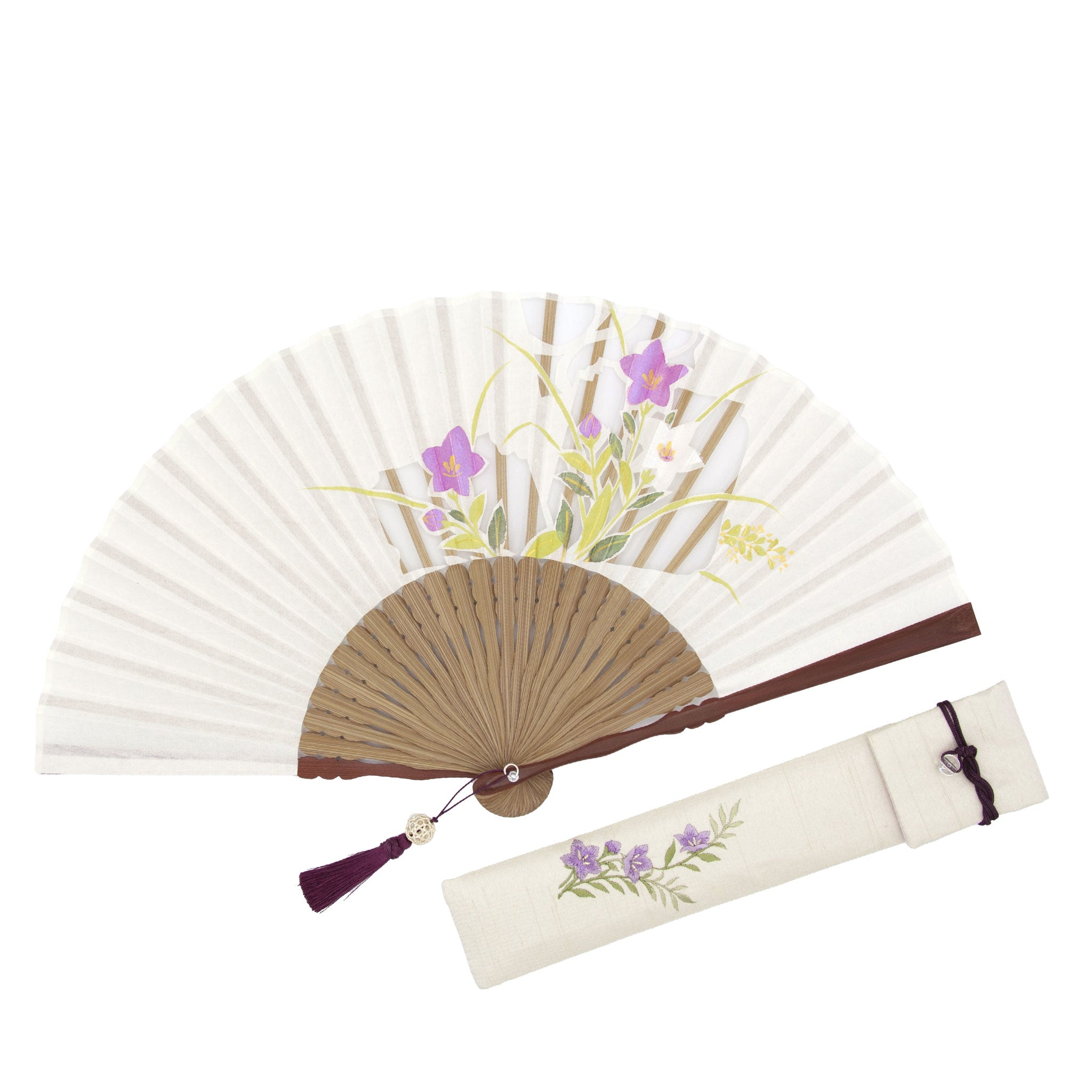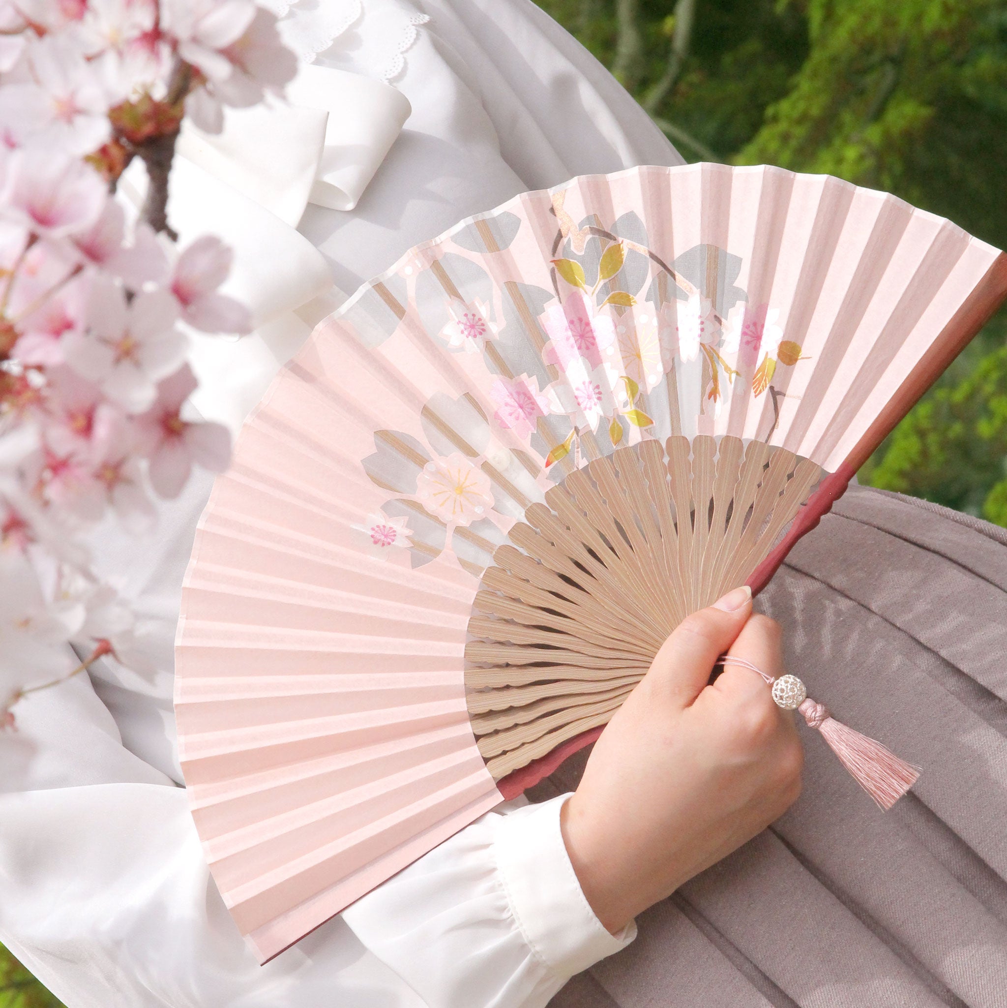 大きく切り出された花の切り絵に重ねるように、同じ花が絵付けされた京扇子。絵付けされた花は、ほんのりとしたパールの輝きが華やかで瑞々しく咲き誇ります。扇面のデザインに合わせたタッセルがしなやかに手元で揺れることで、さらに上品な印象に。