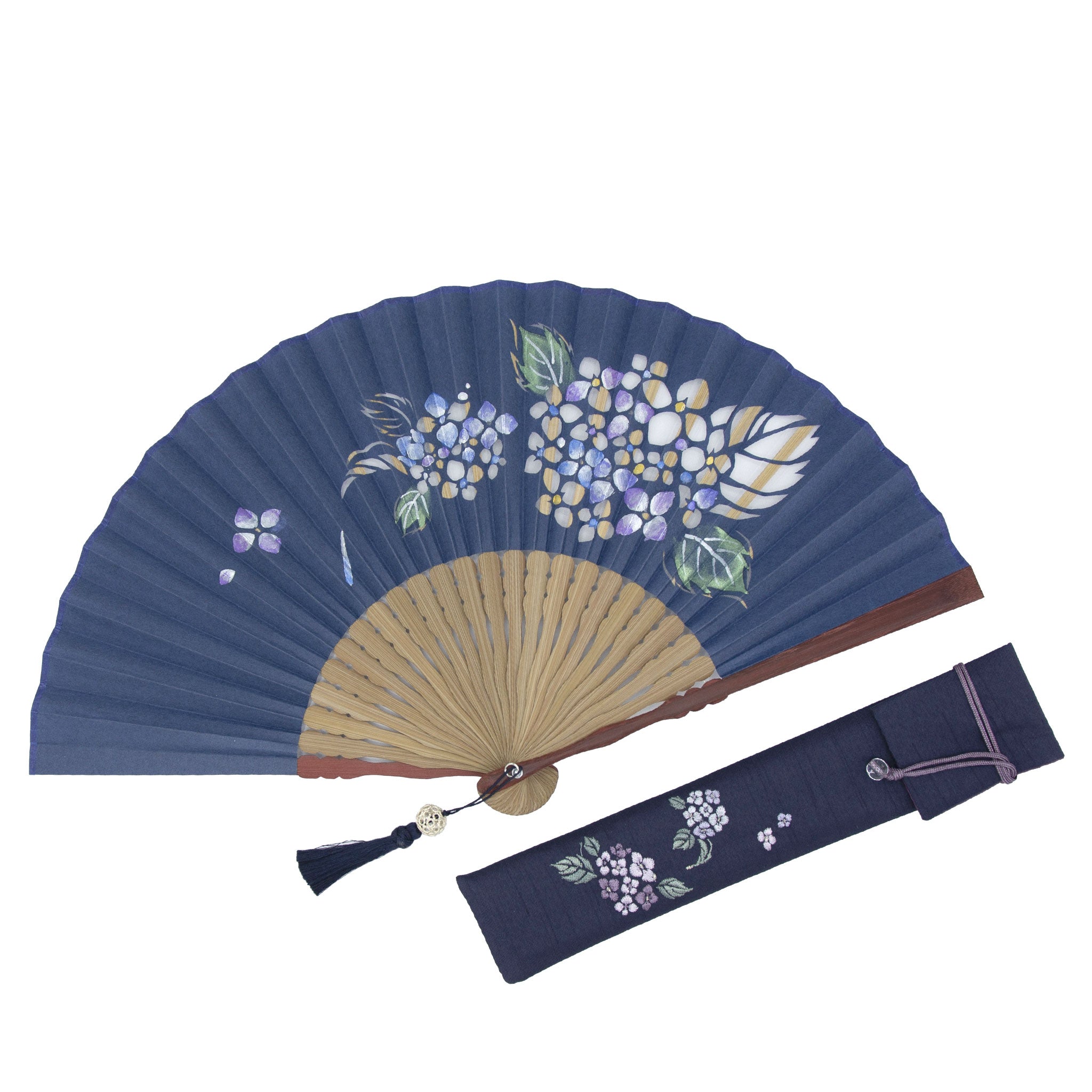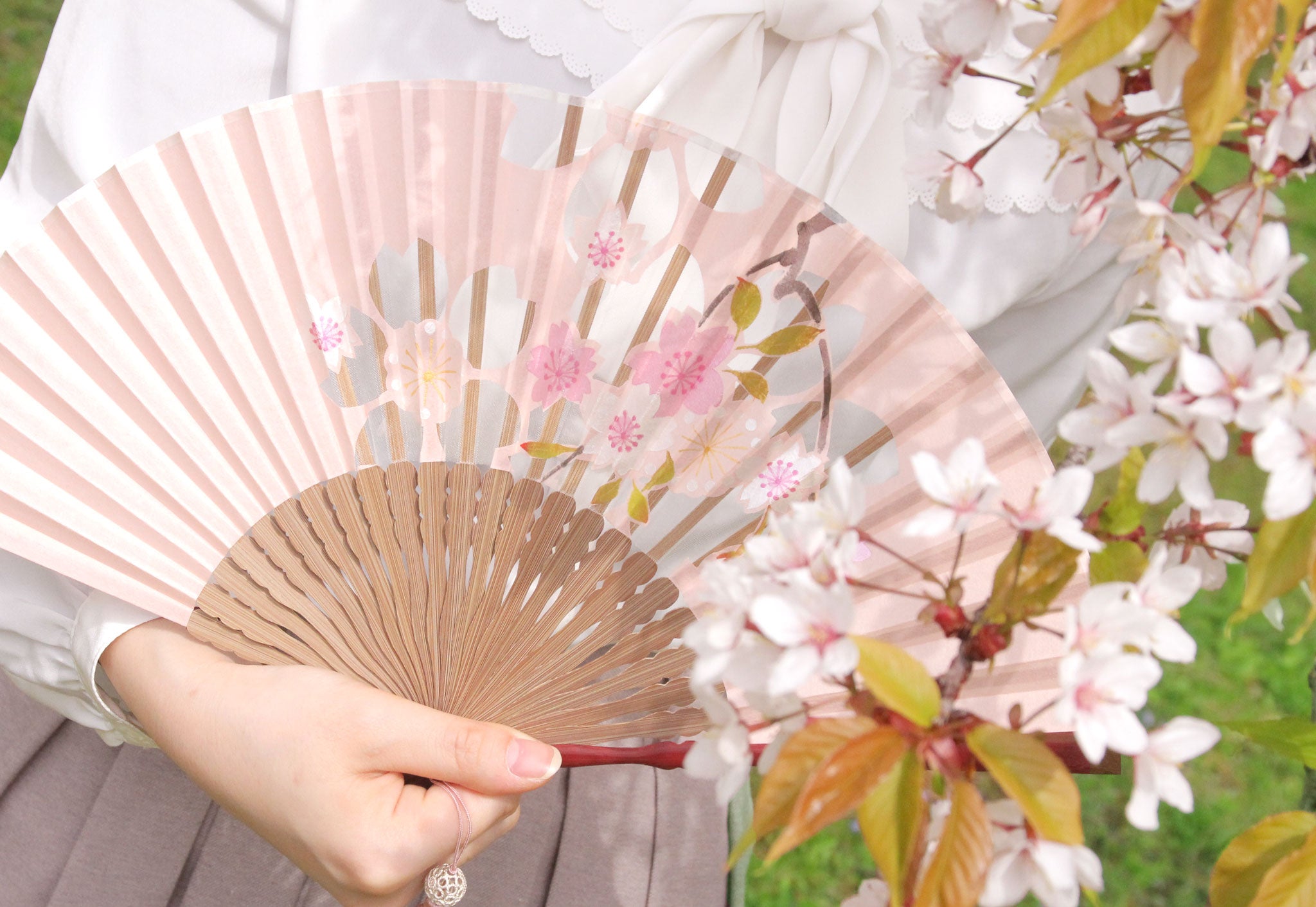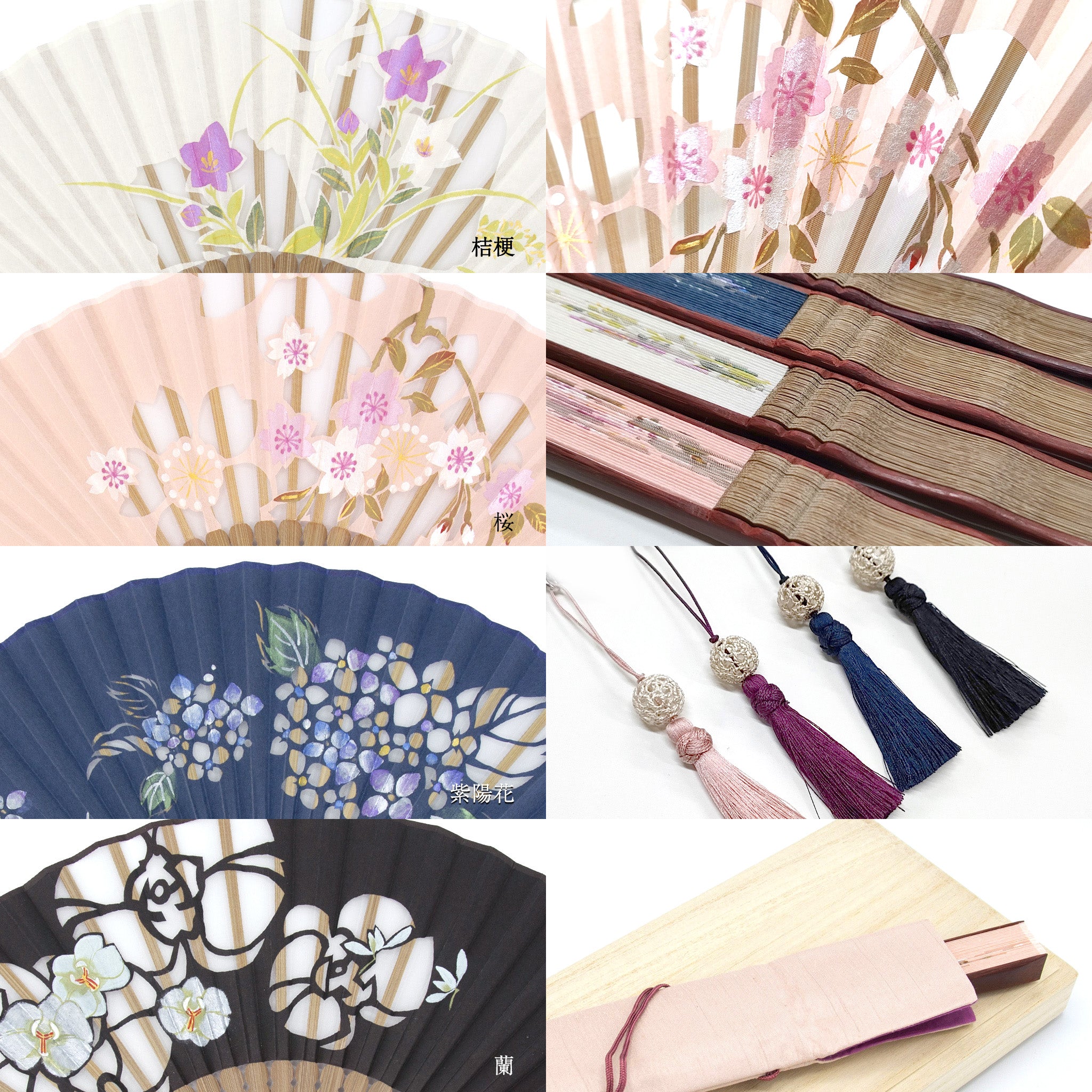 大きく切り出された花の切り絵に重ねるように、同じ花が絵付けされた京扇子。絵付けされた花は、ほんのりとしたパールの輝きが華やかで瑞々しく咲き誇ります。扇面のデザインに合わせたタッセルがしなやかに手元で揺れることで、さらに上品な印象に。