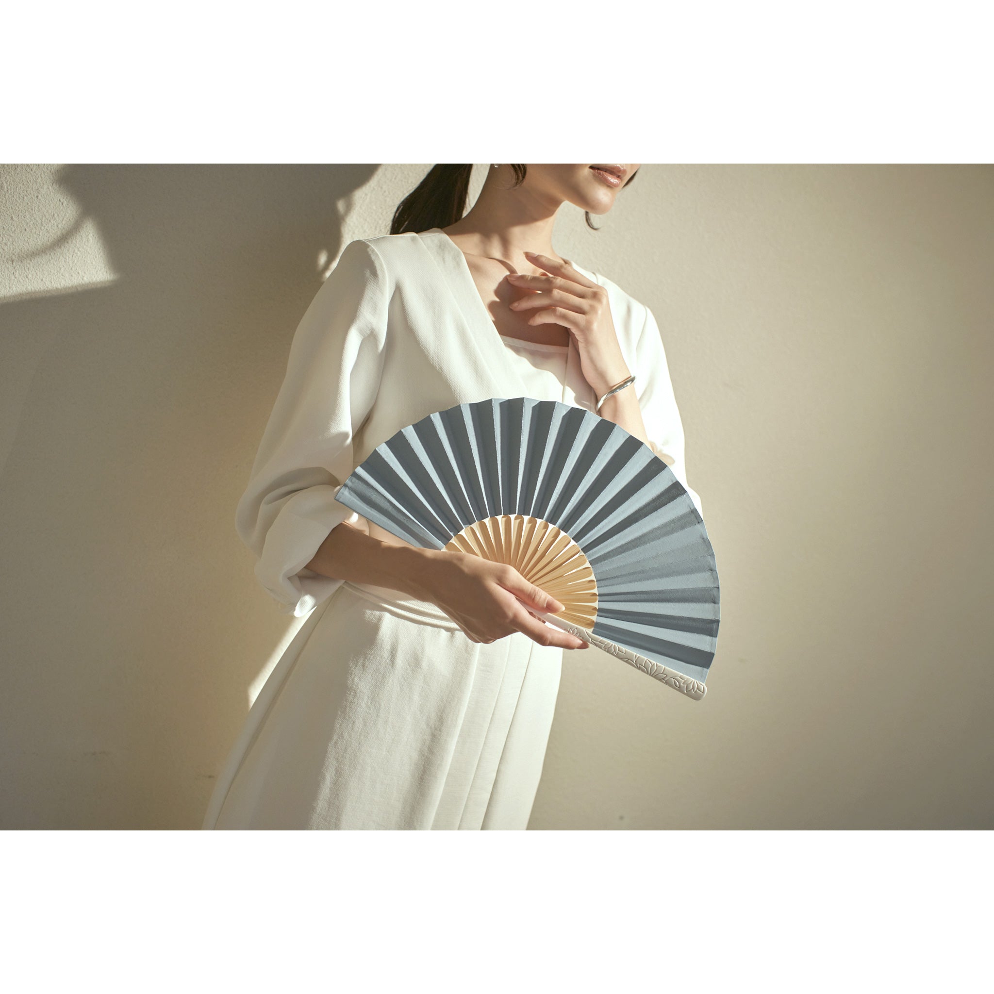 扇面は触り心地良い柔らかな馬革を使用。経年で変化する風合いをお楽しみいただけます。ホワイトの親骨には、フラワーレリーフを施し上品さと高級感をアップ。