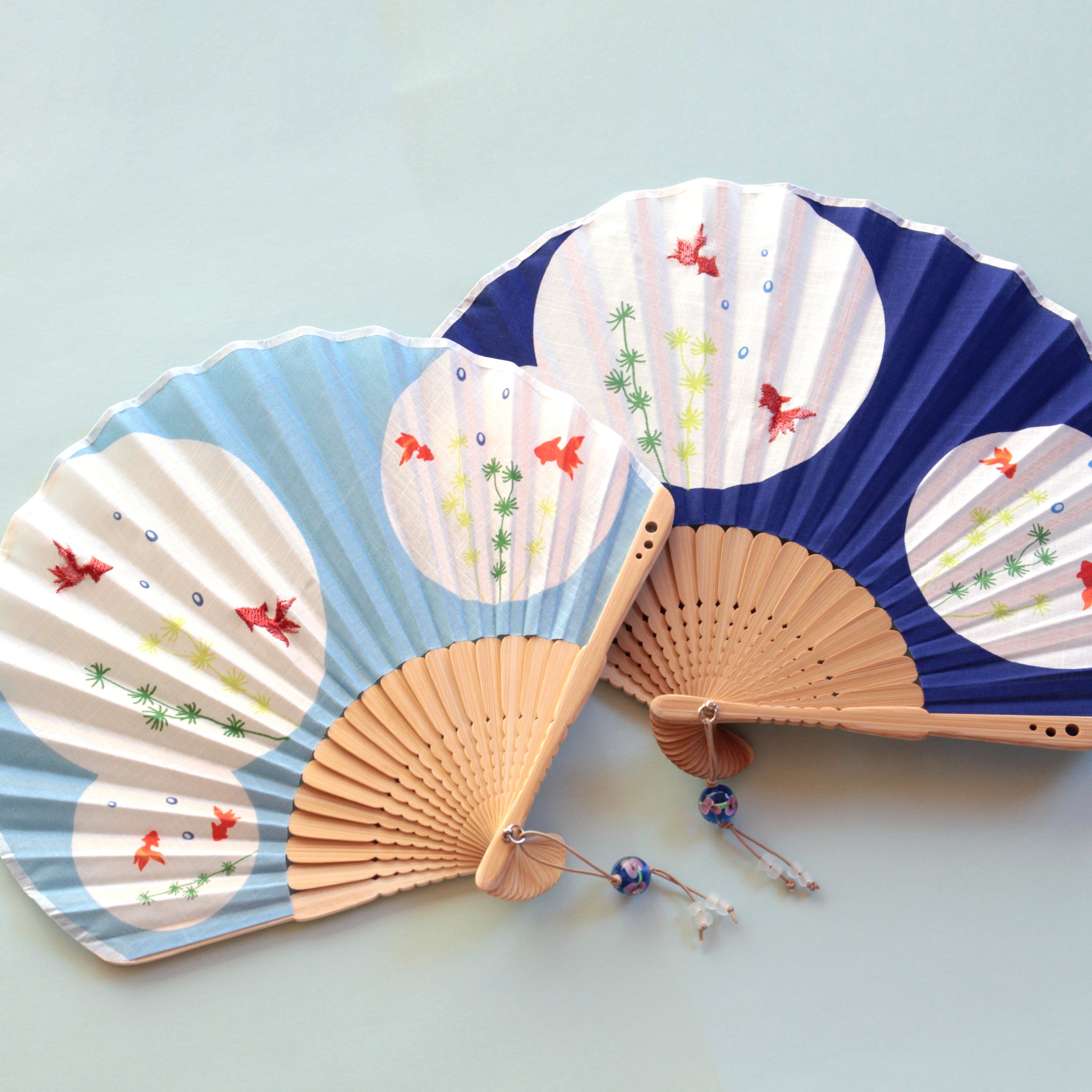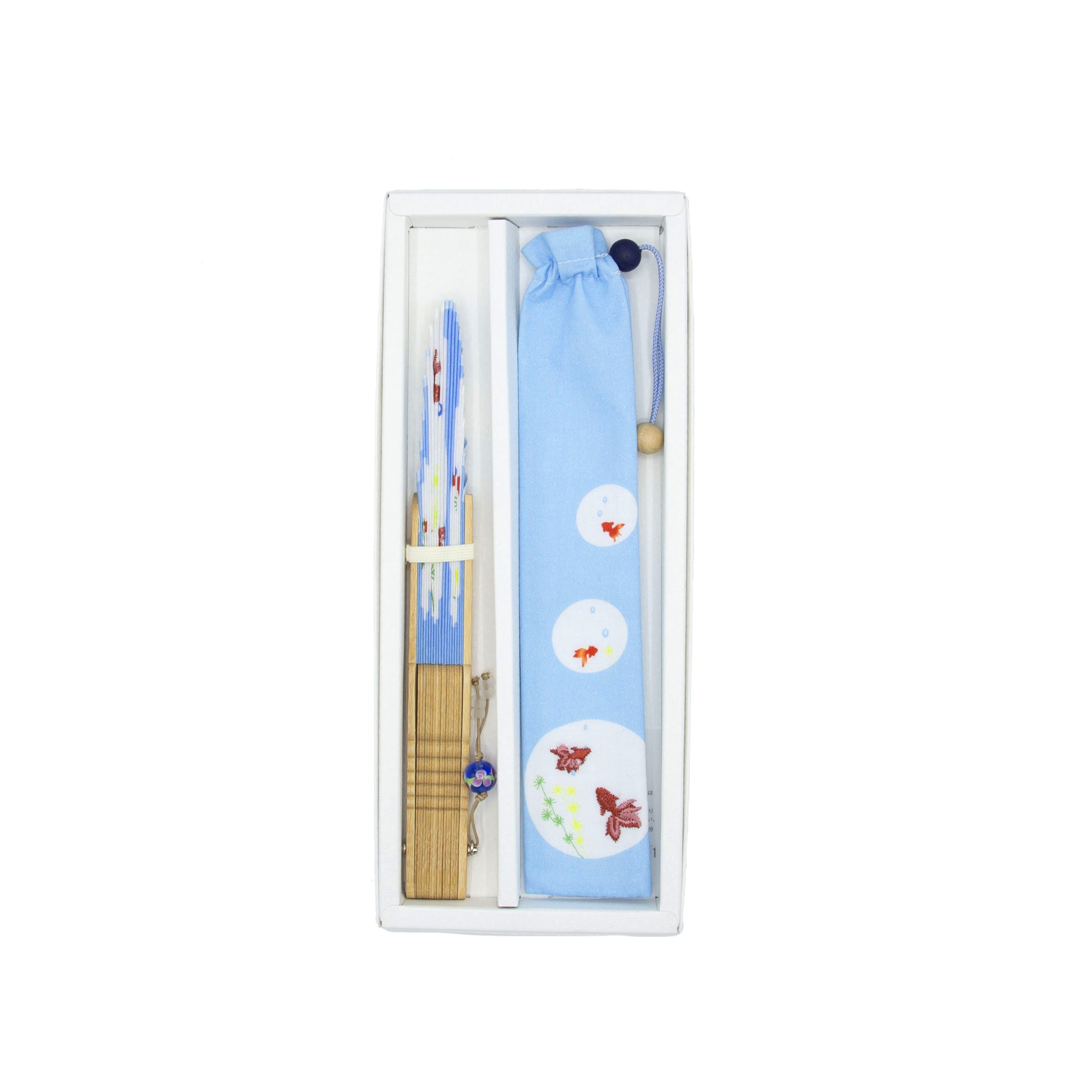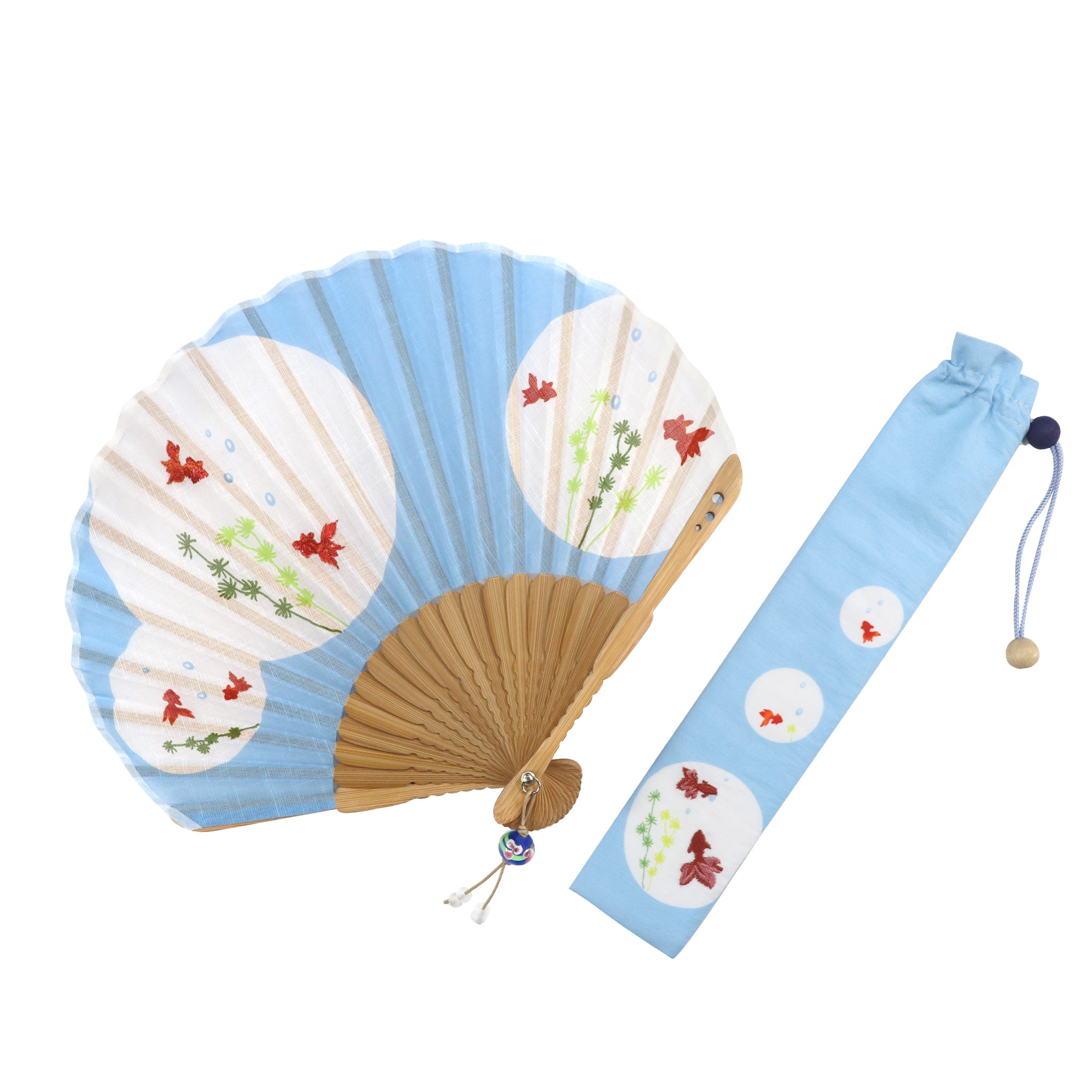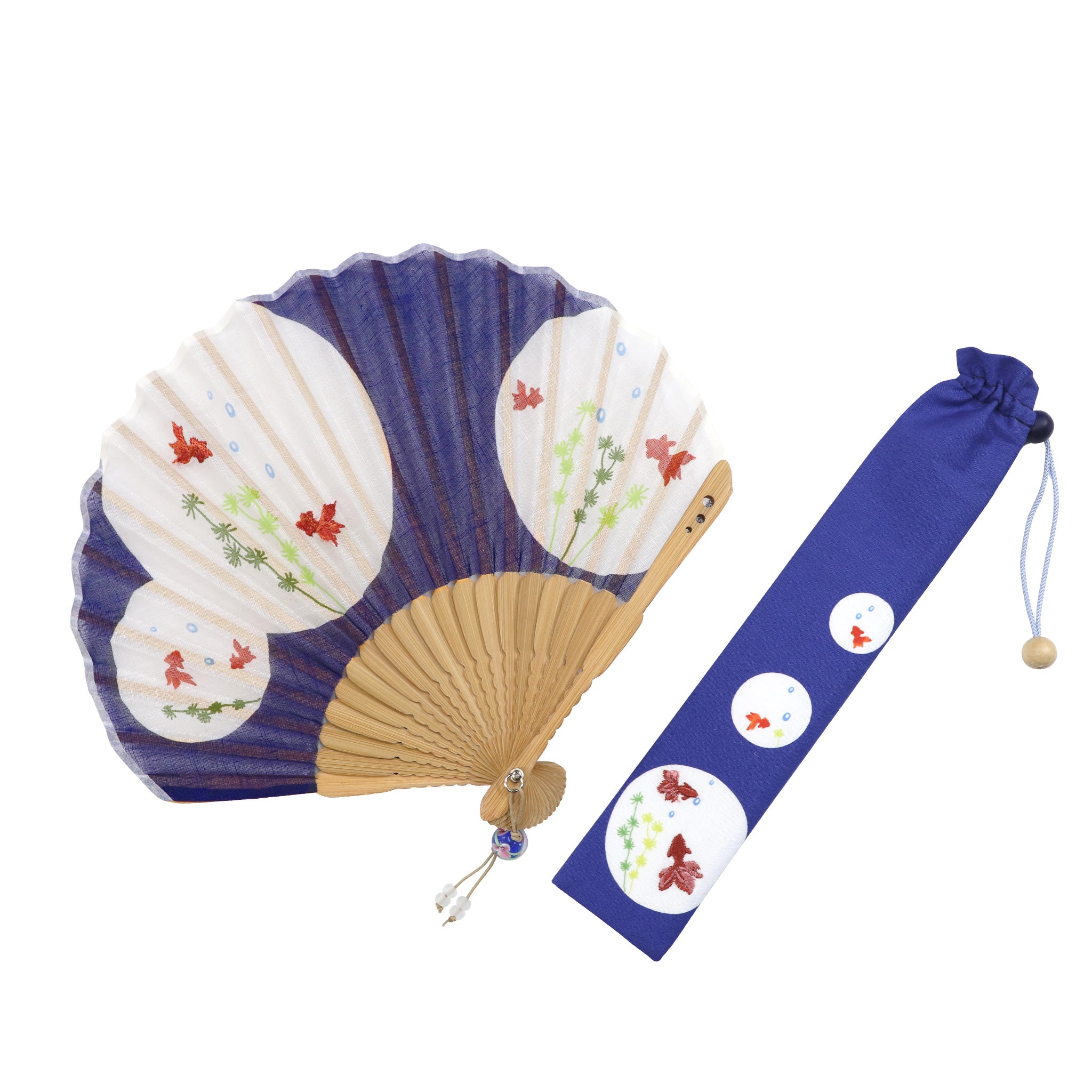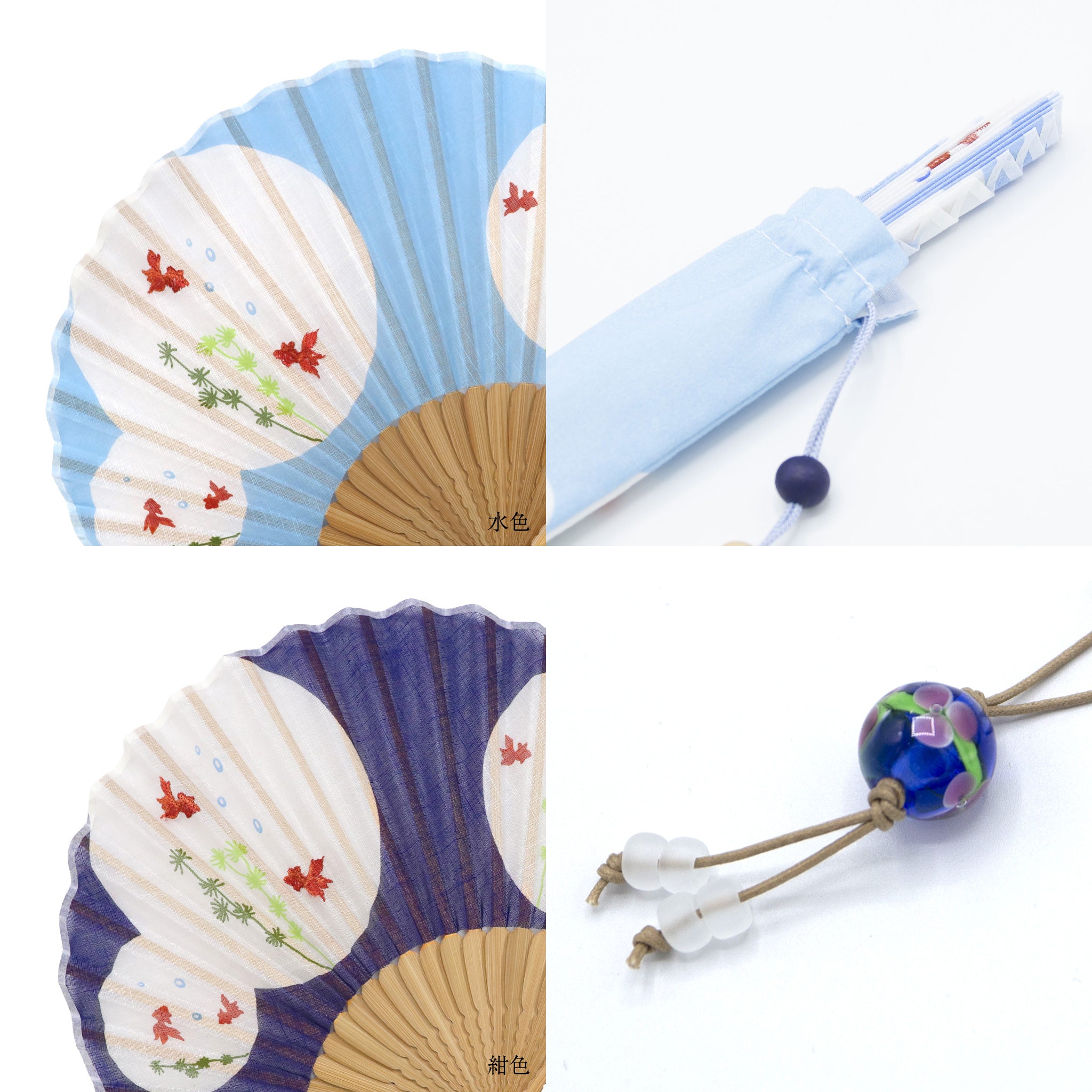 金魚鉢をイメージした巾着型の扇子袋と、トンボ玉とビーズを組み合わせたチャーム付き。