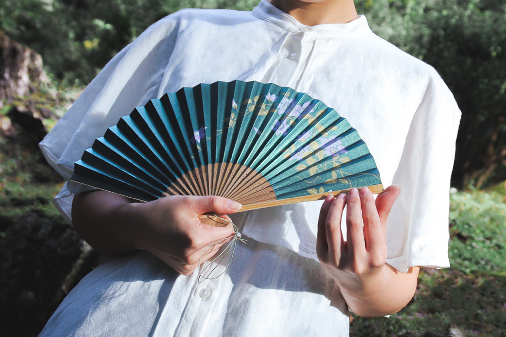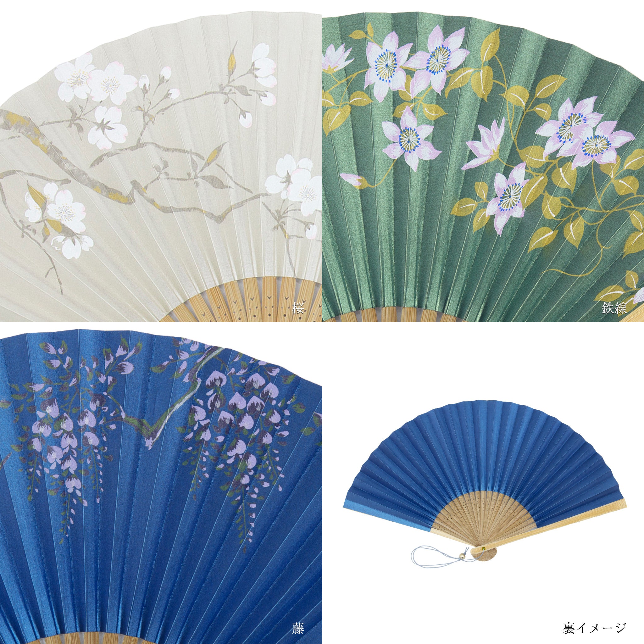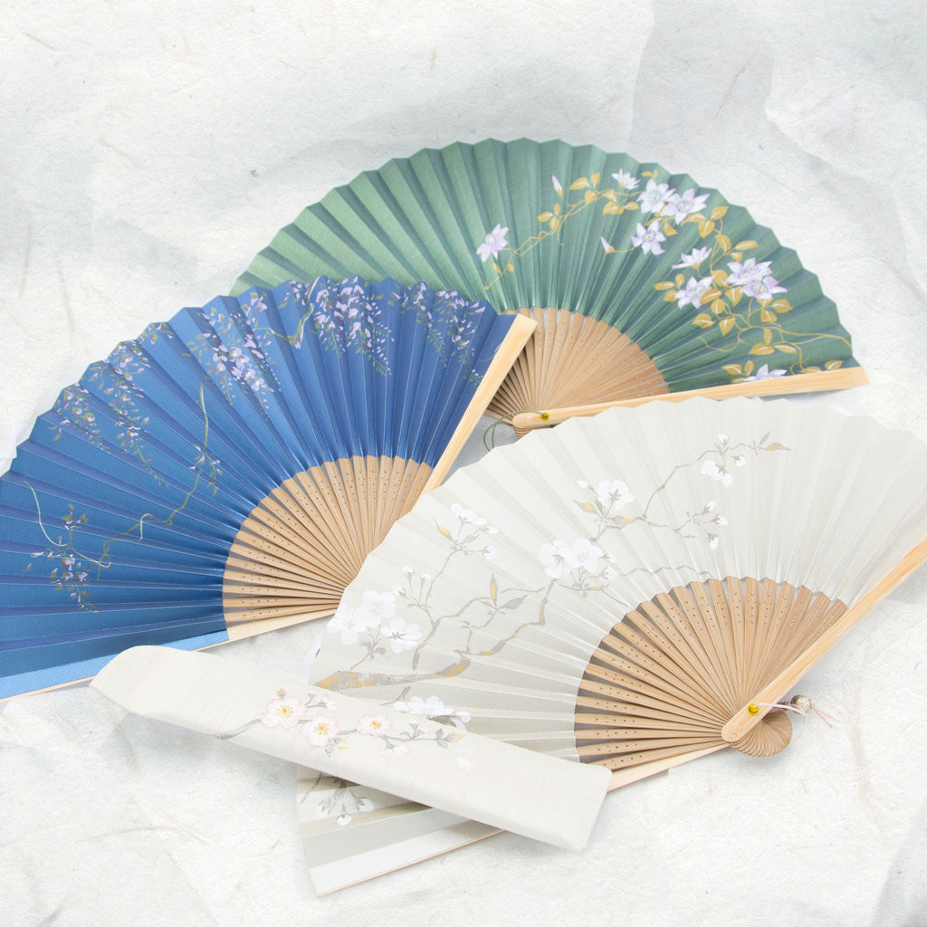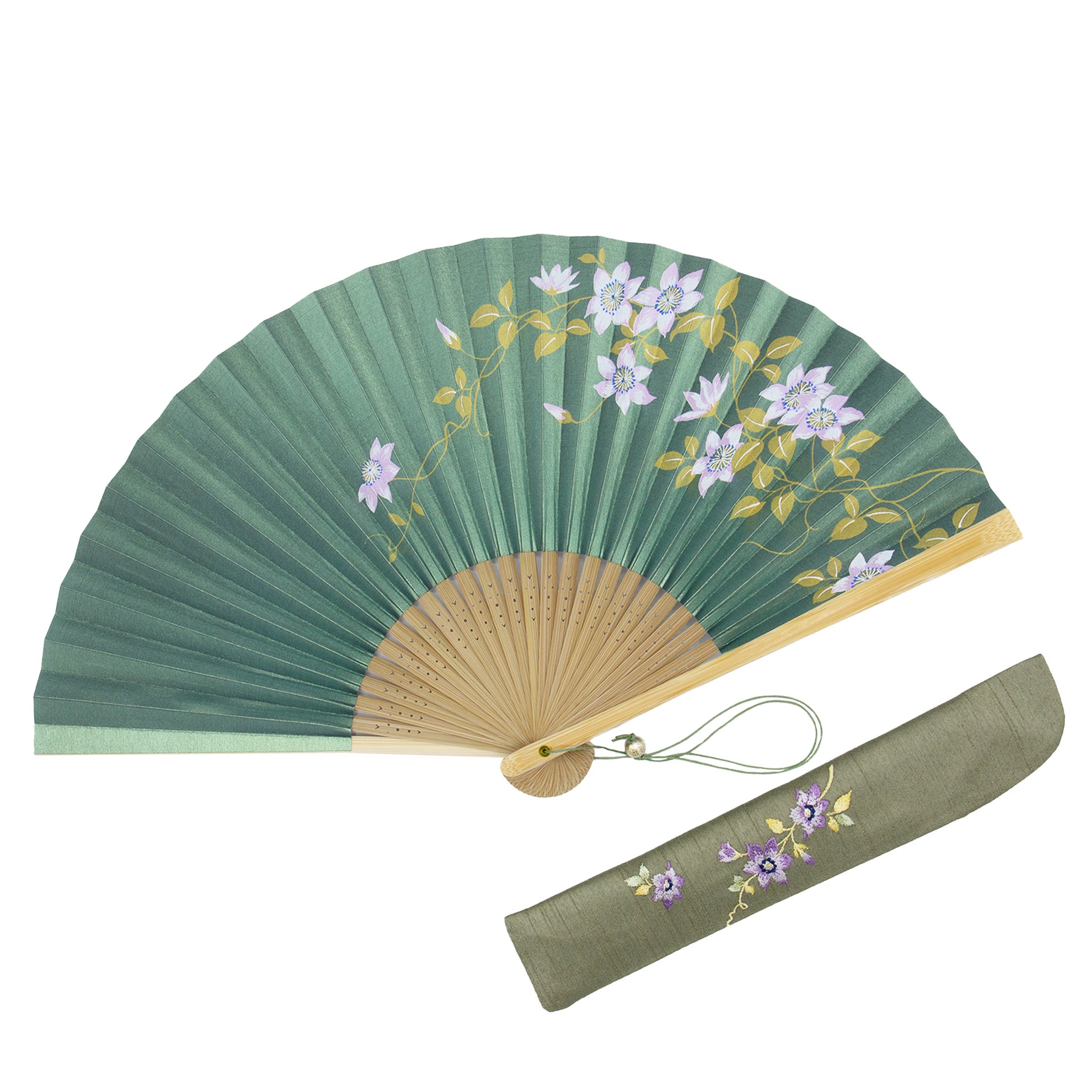 光沢のあるパール引きされた扇面に、深く落ち着いた色合いの草花が美しい京扇子。