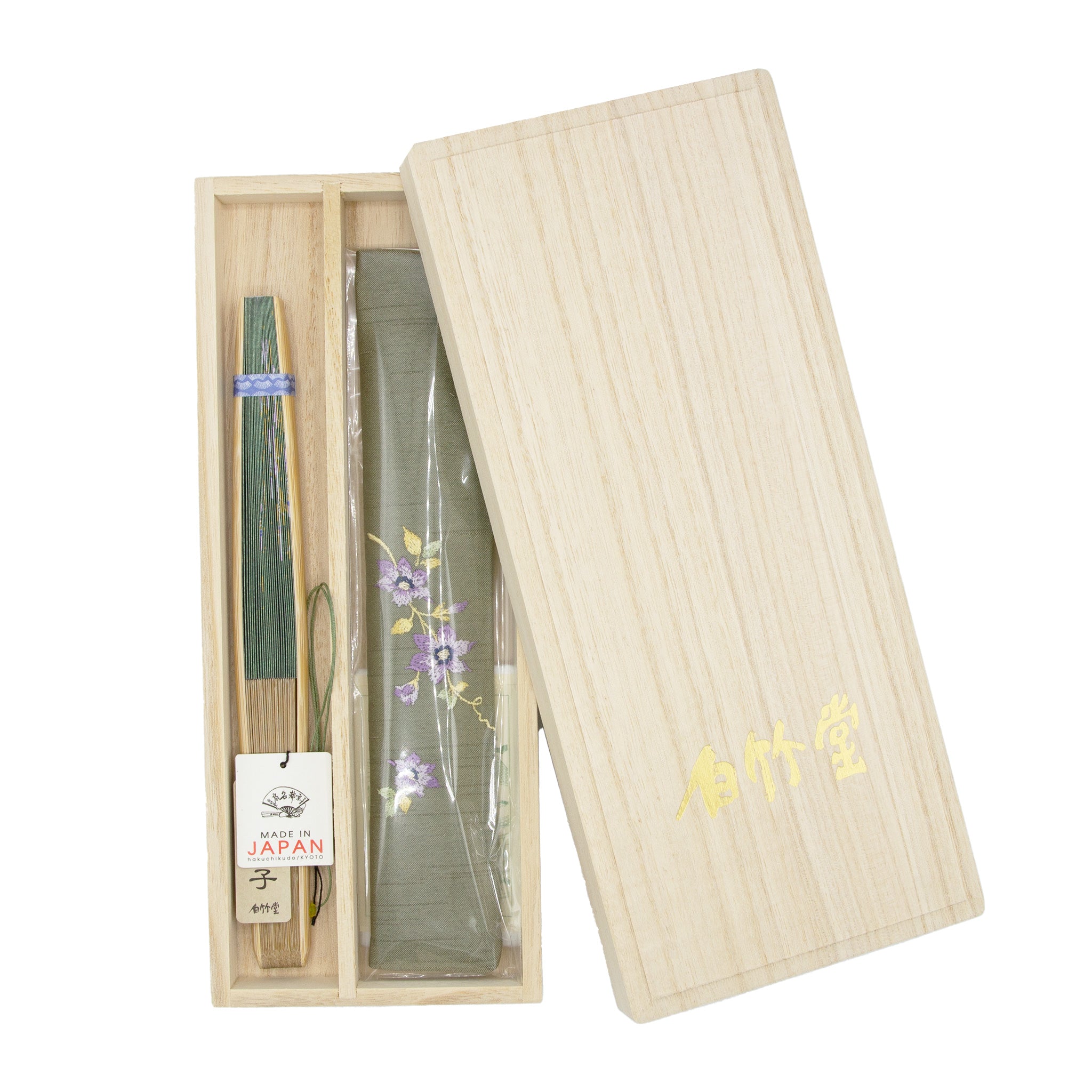 扇面と同じモチーフを刺繍したセットの扇子袋には、ポイントで金糸・銀糸を使用。