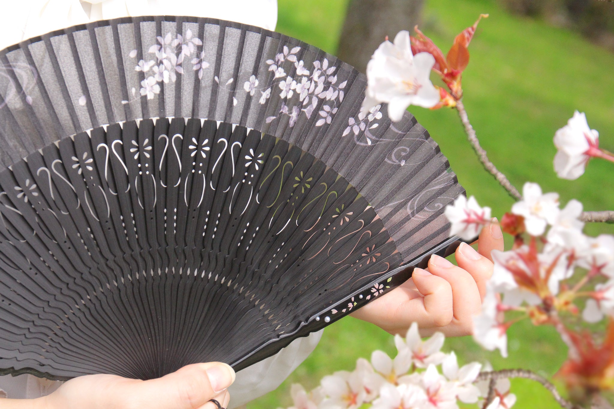 親骨に半球パールと花のペイントを施し、花々が持つ繊細な美しさを表現。