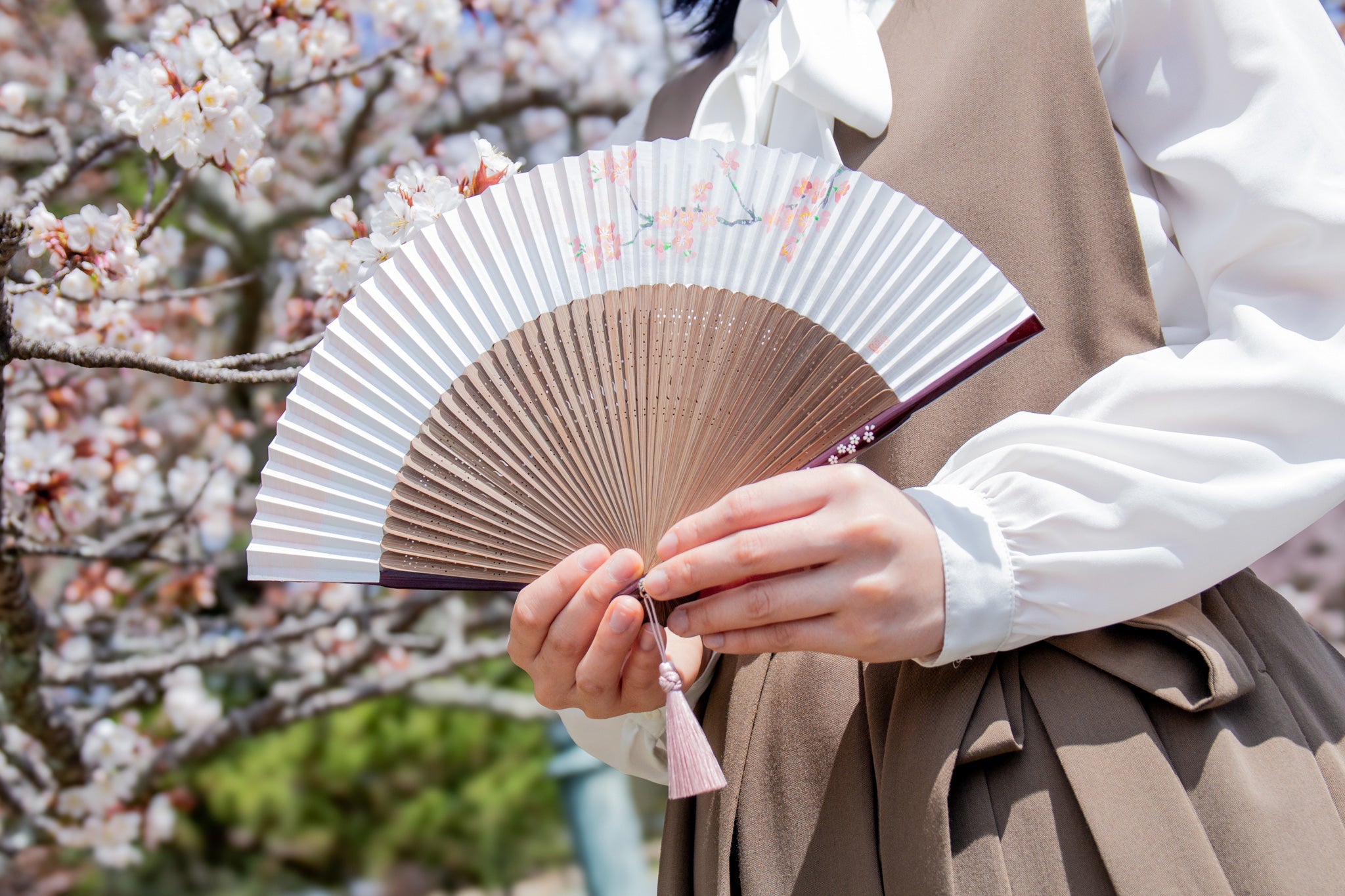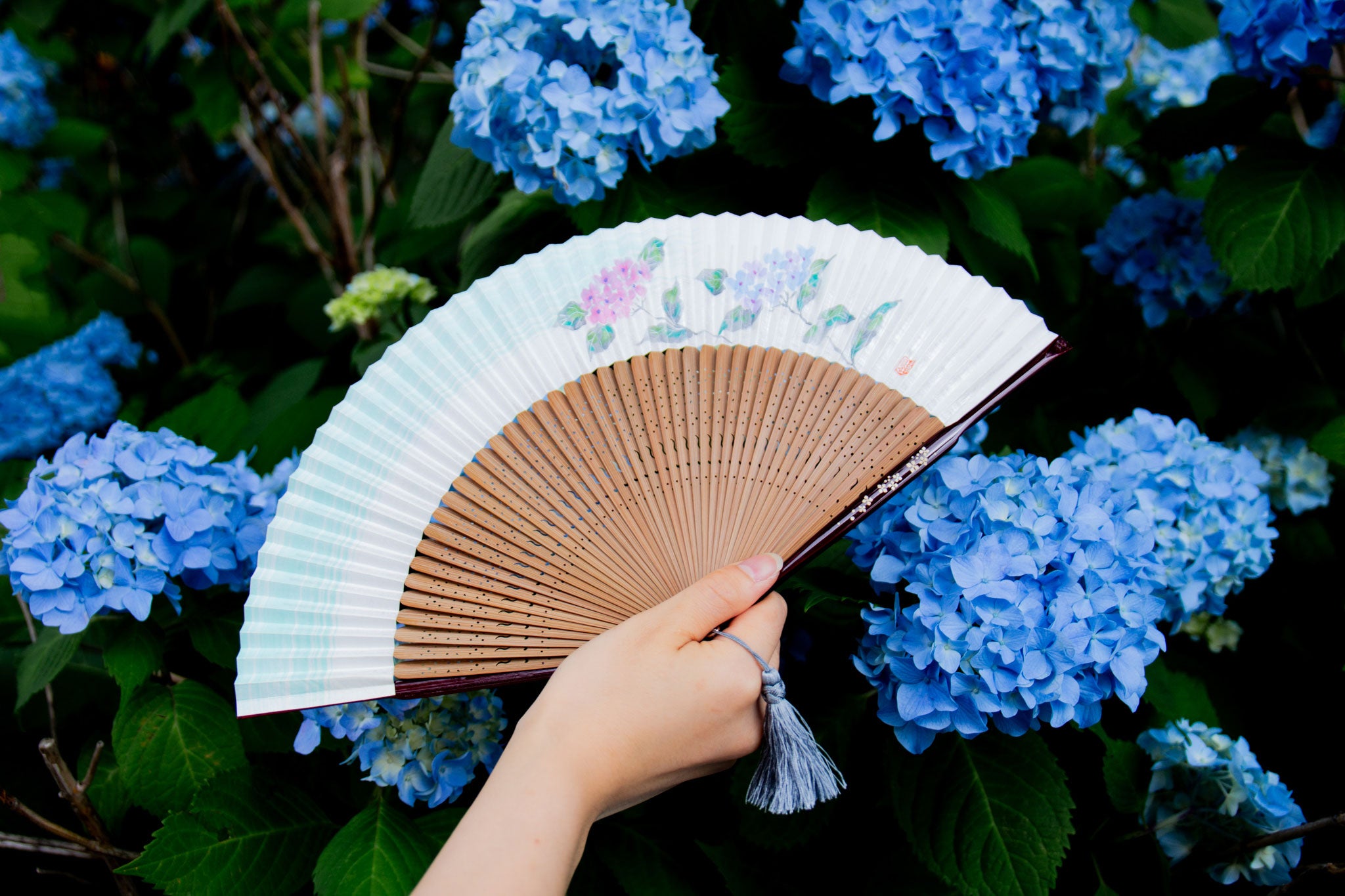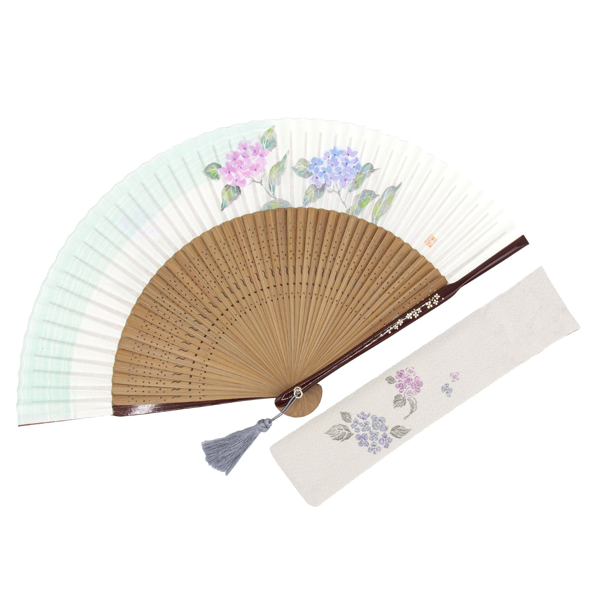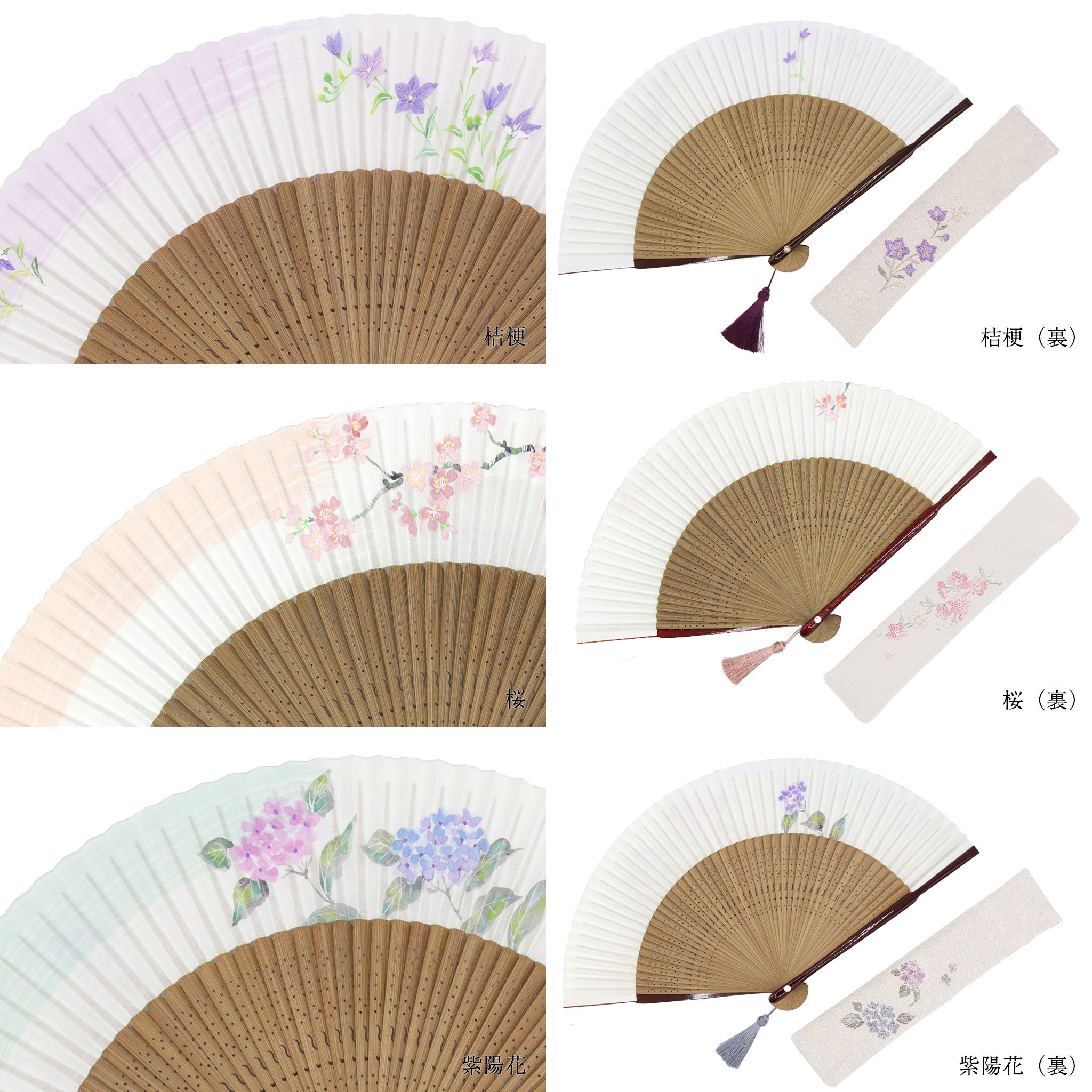 扇面の花は、京都の伝統工芸士である高島孝風氏が一つひとつ手描きで描いたもの。手描きの絵付けならではの色彩豊かな濃淡と緻密な線の強弱は、自然の美をやさしく表現しています。