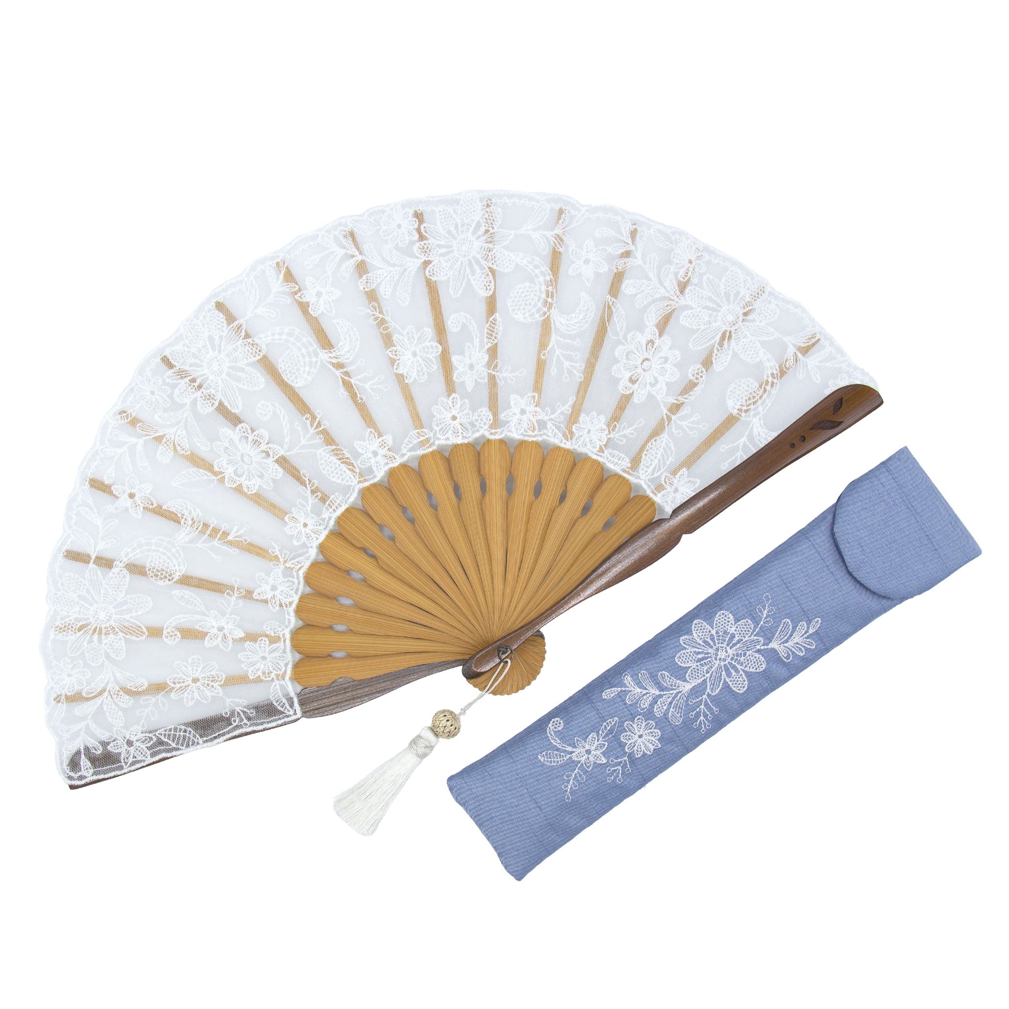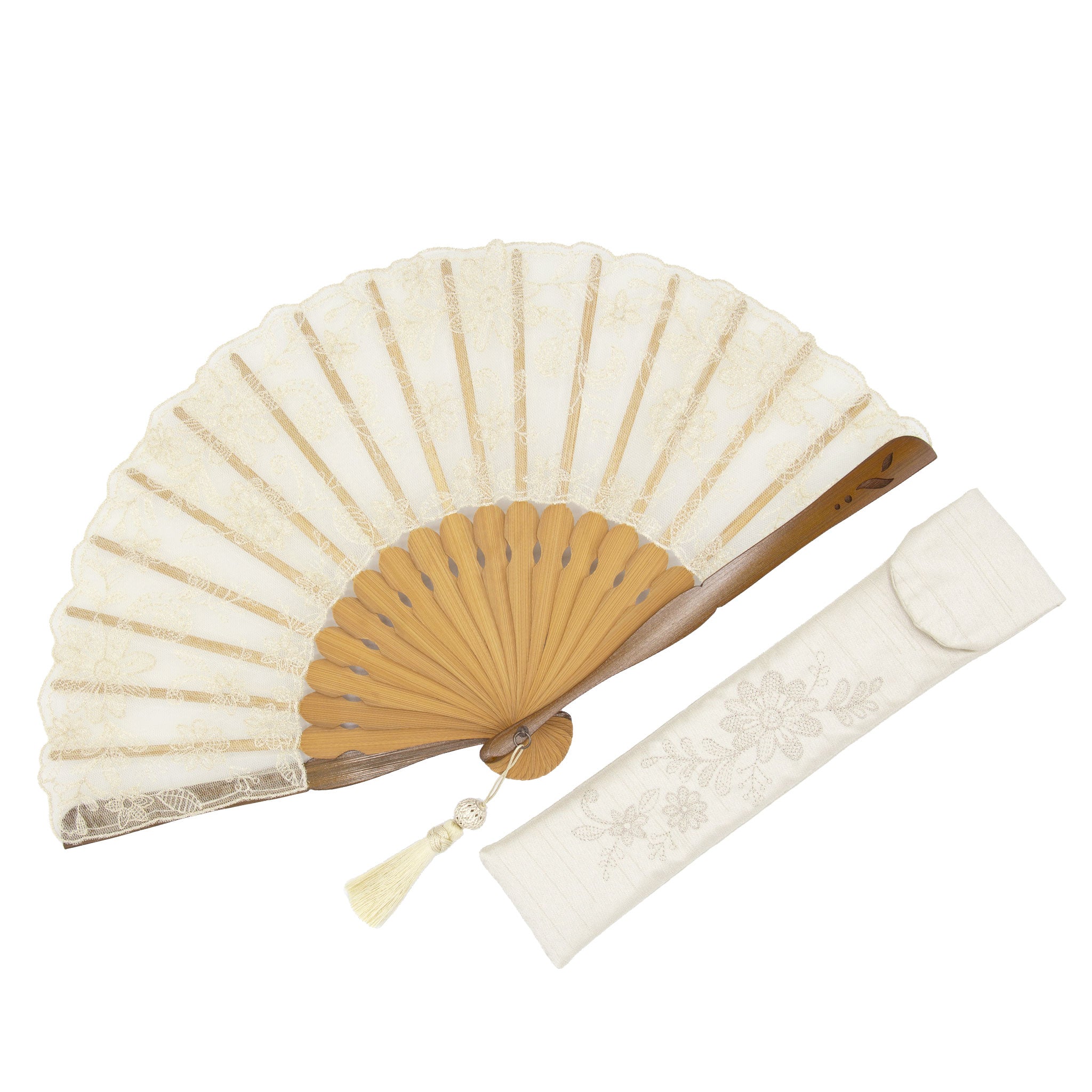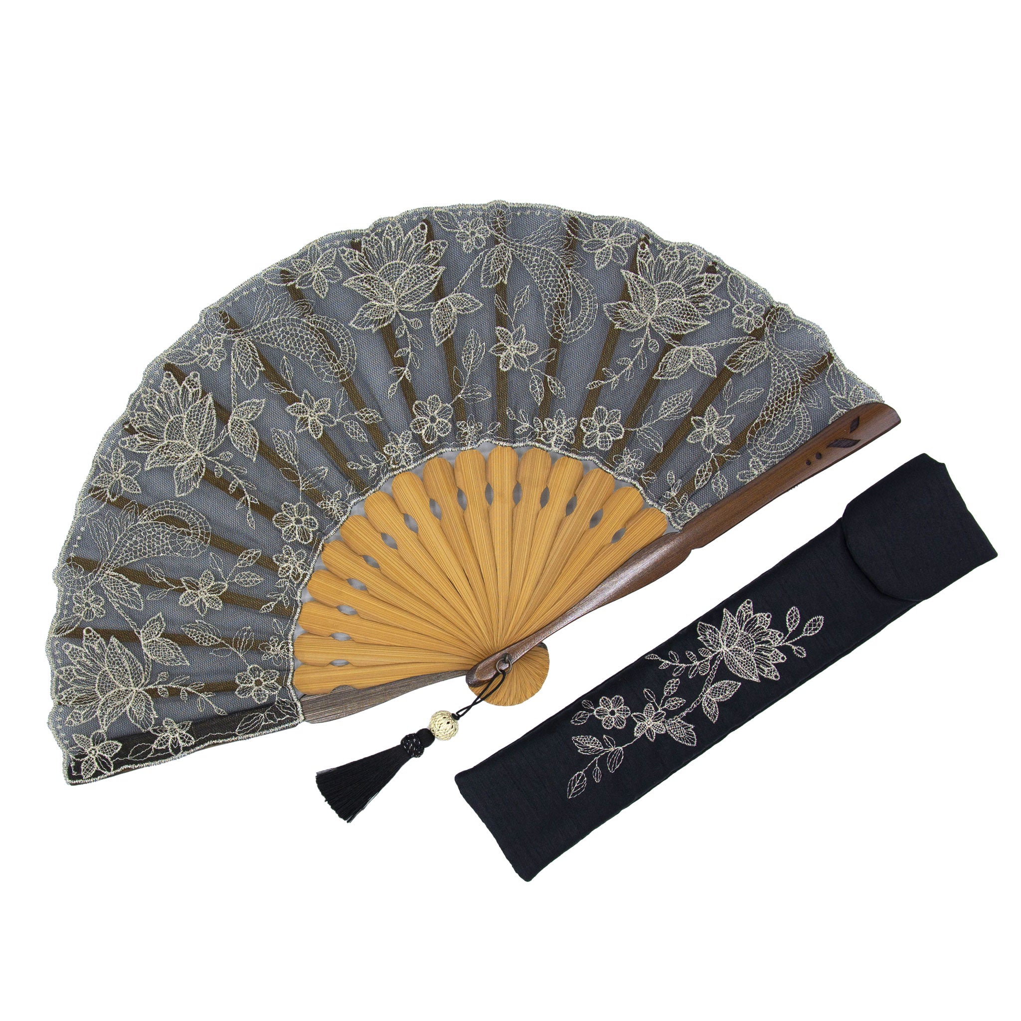 扇面にチュールと薄手のシルクレース生地を貼り合わせ、京都刺繍を施した洋風の京扇子。 繊細で立体的な美しさが映えるデザインです。扇子袋にも扇面と同じ刺繍が施されています。