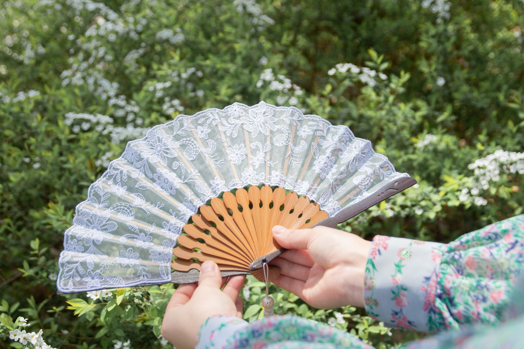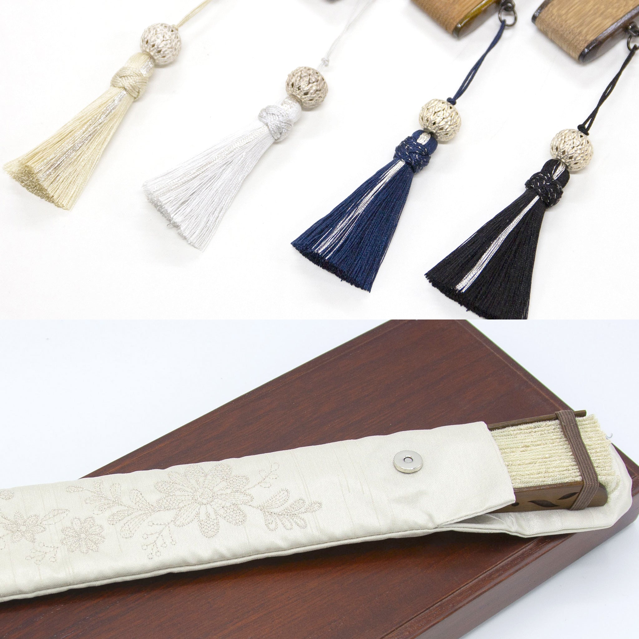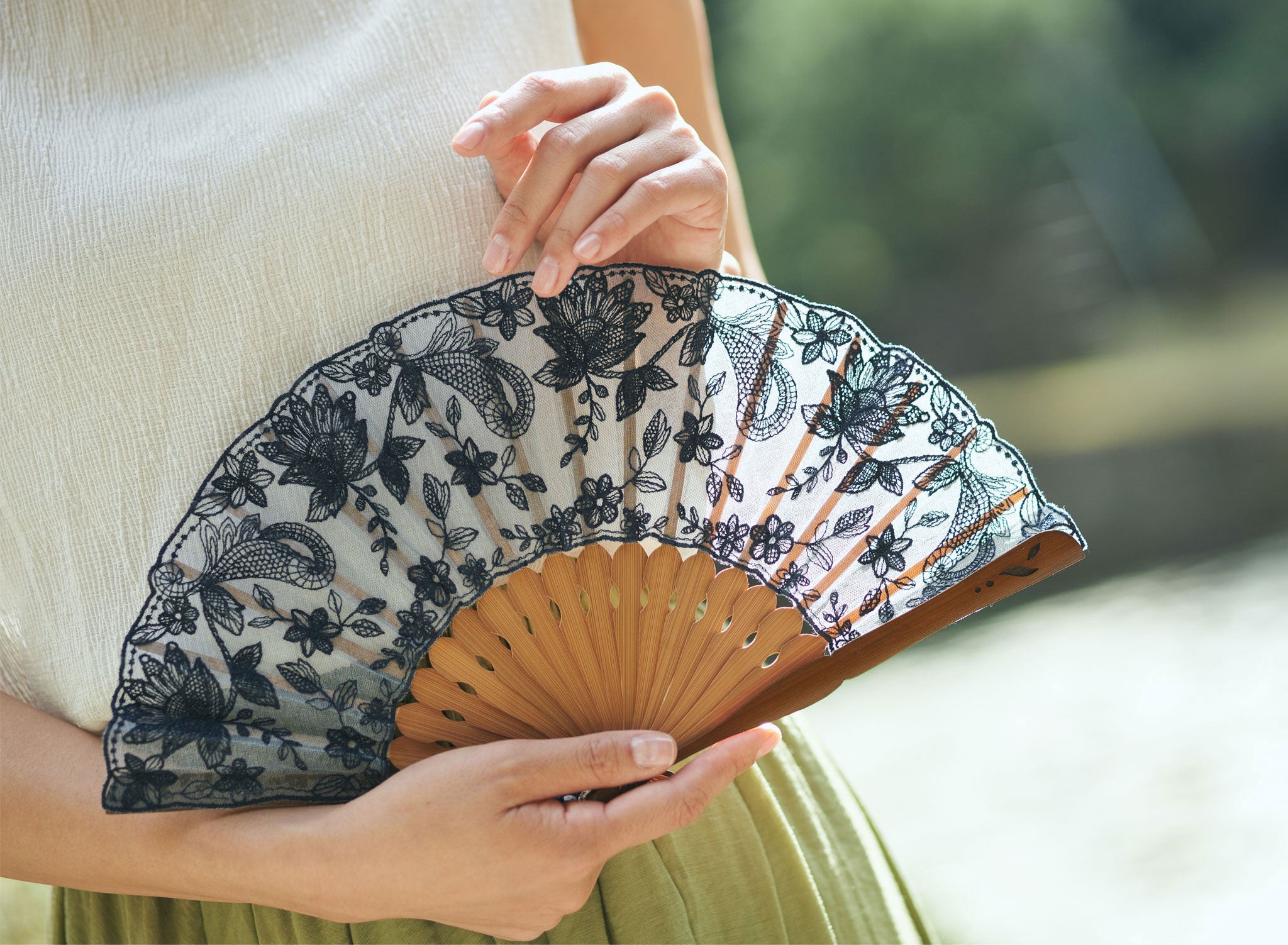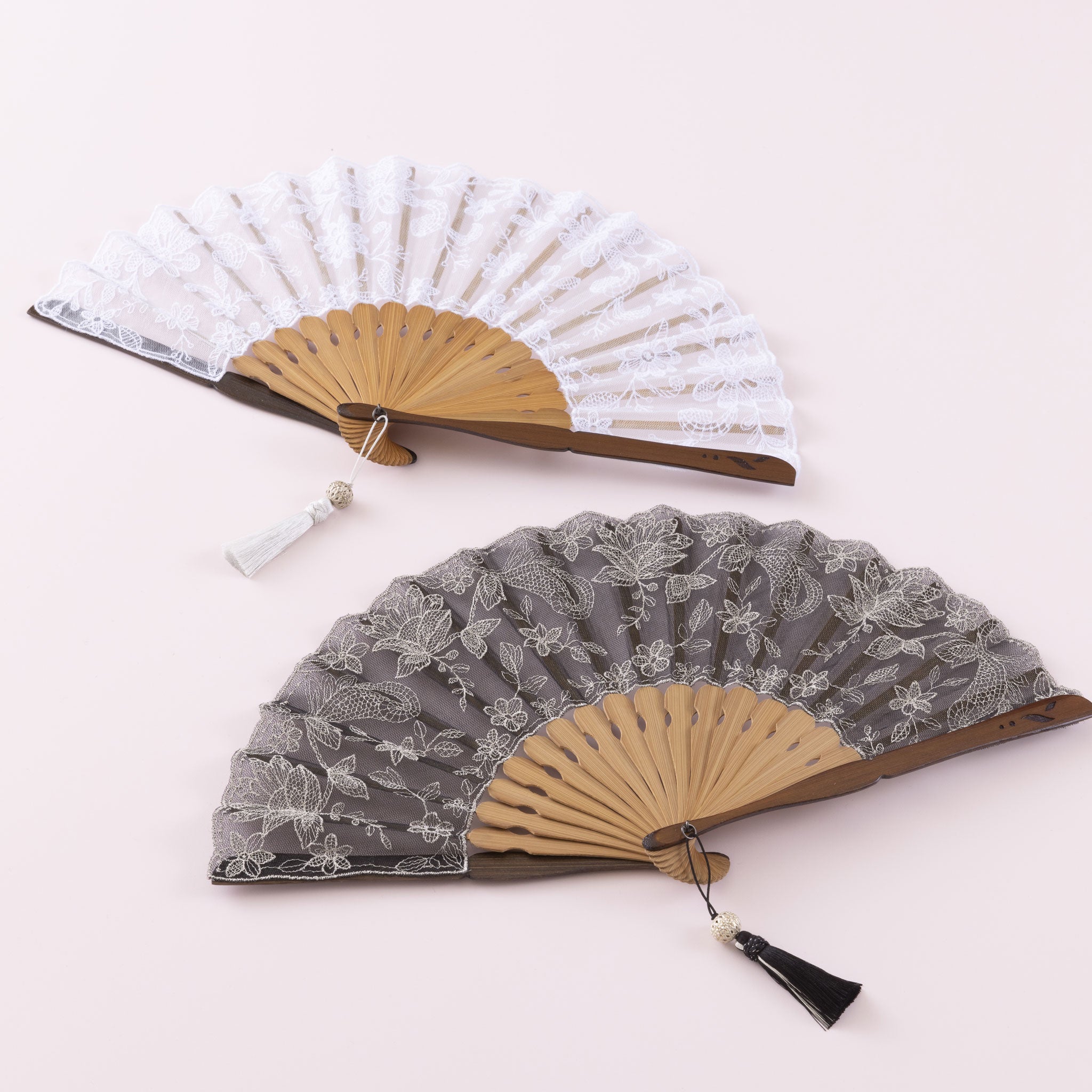 扇面にチュールと薄手のシルクレース生地を貼り合わせ、京都刺繍を施した洋風の京扇子。 繊細で立体的な美しさが映えるデザインです。扇子袋にも扇面と同じ刺繍が施されています。