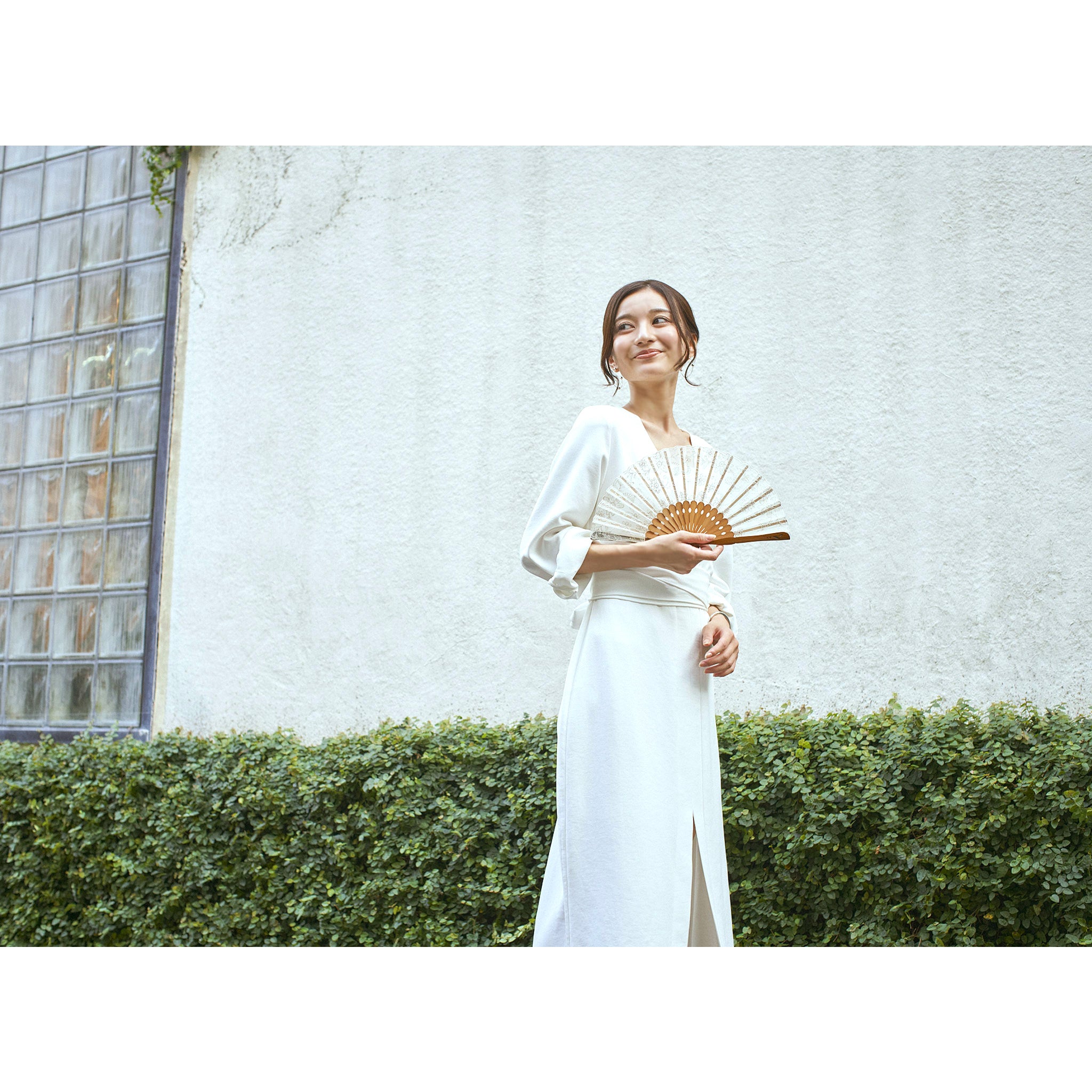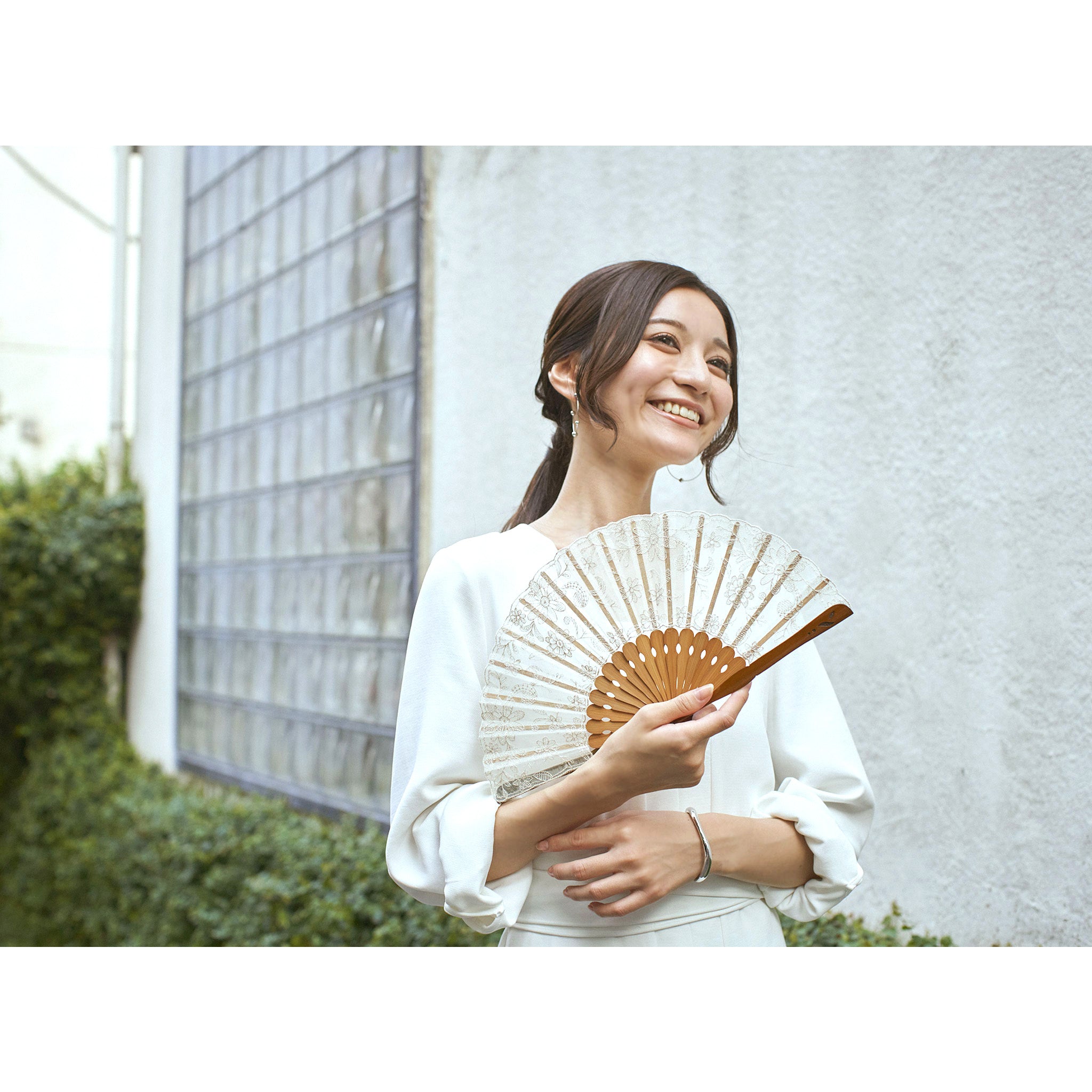 京扇子では白竹堂が初めて採用したともいえるアシンメトリーなナイフ型の親骨を使用。 微粒子のパール紛がきらめき、上品でおしゃれな雰囲気を一層引き立てます。