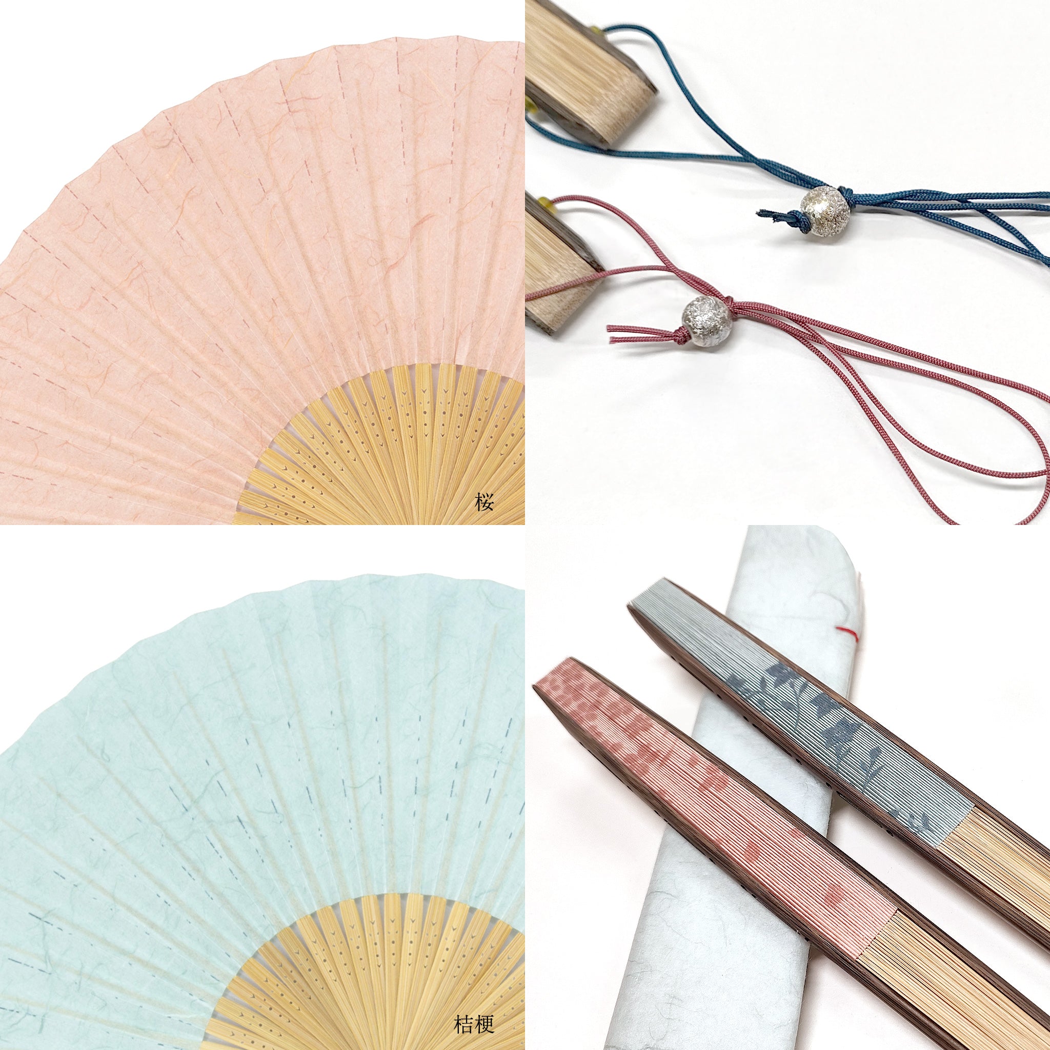 扇子を閉じると、扇子の𦚰に桜・桔梗のそれぞれの花模様が現れます。