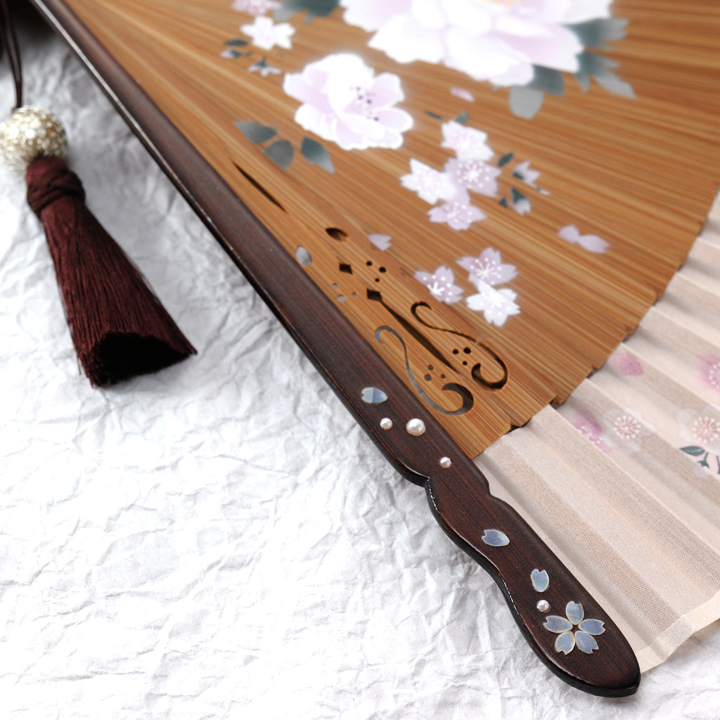 艶やかな塗りの親骨には螺鈿加工の桜の花びらと半球パールが美しく舞います。