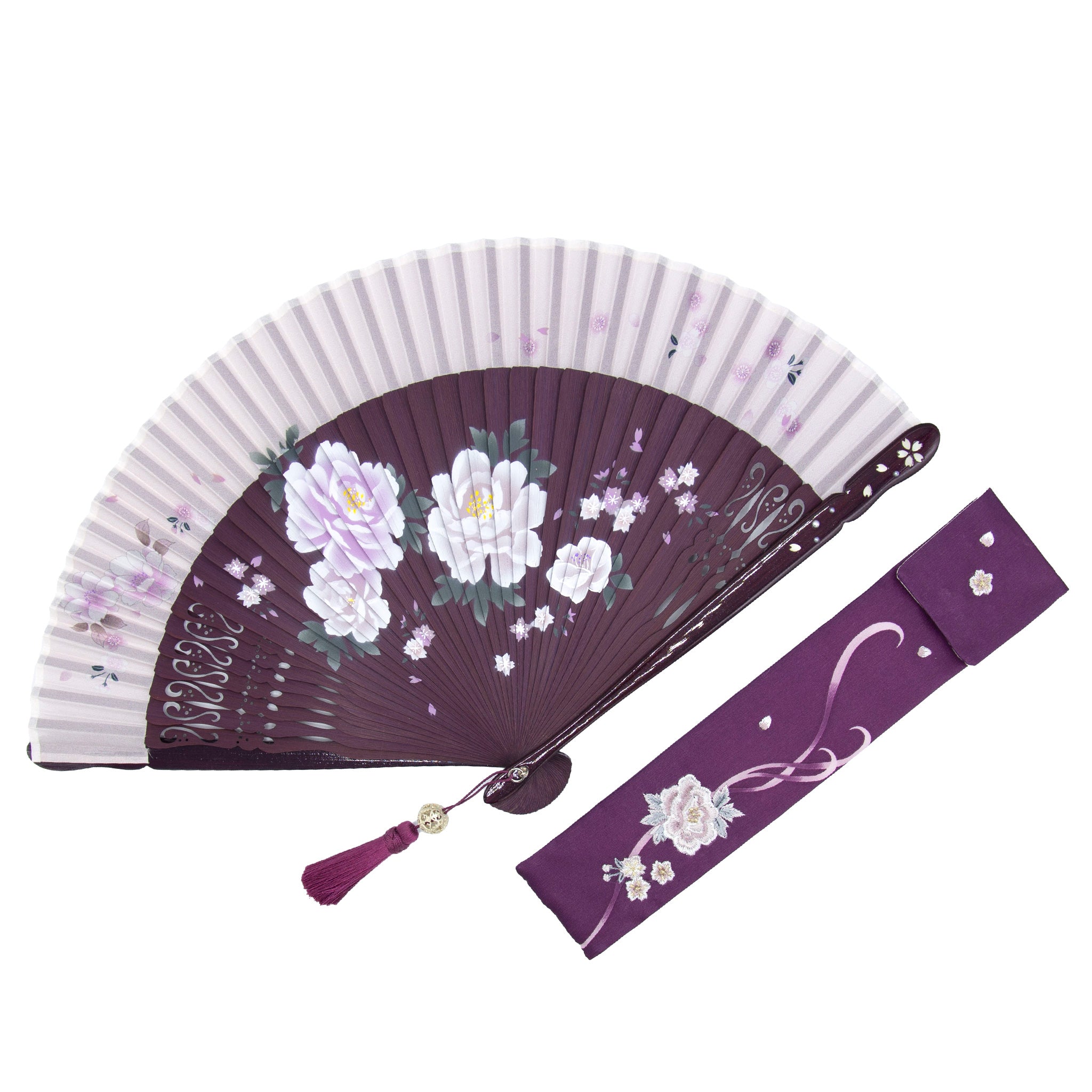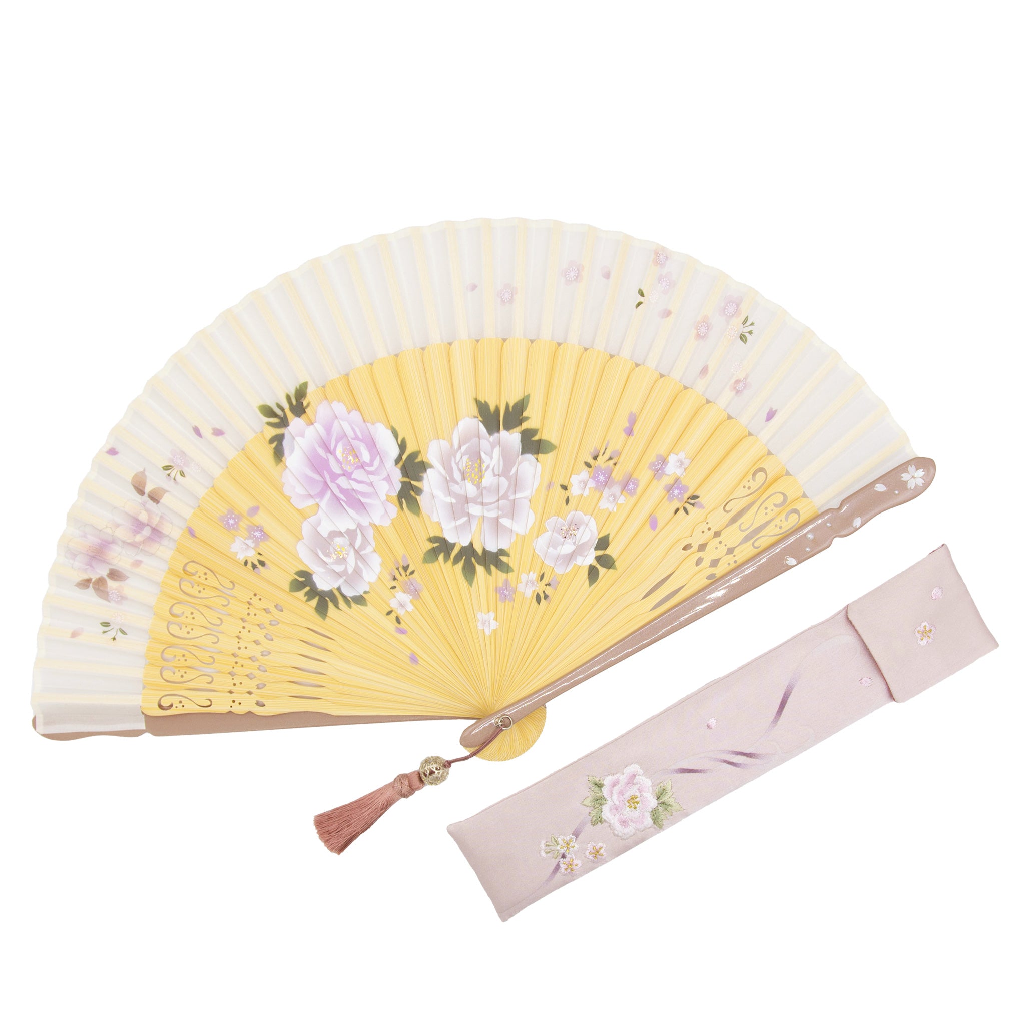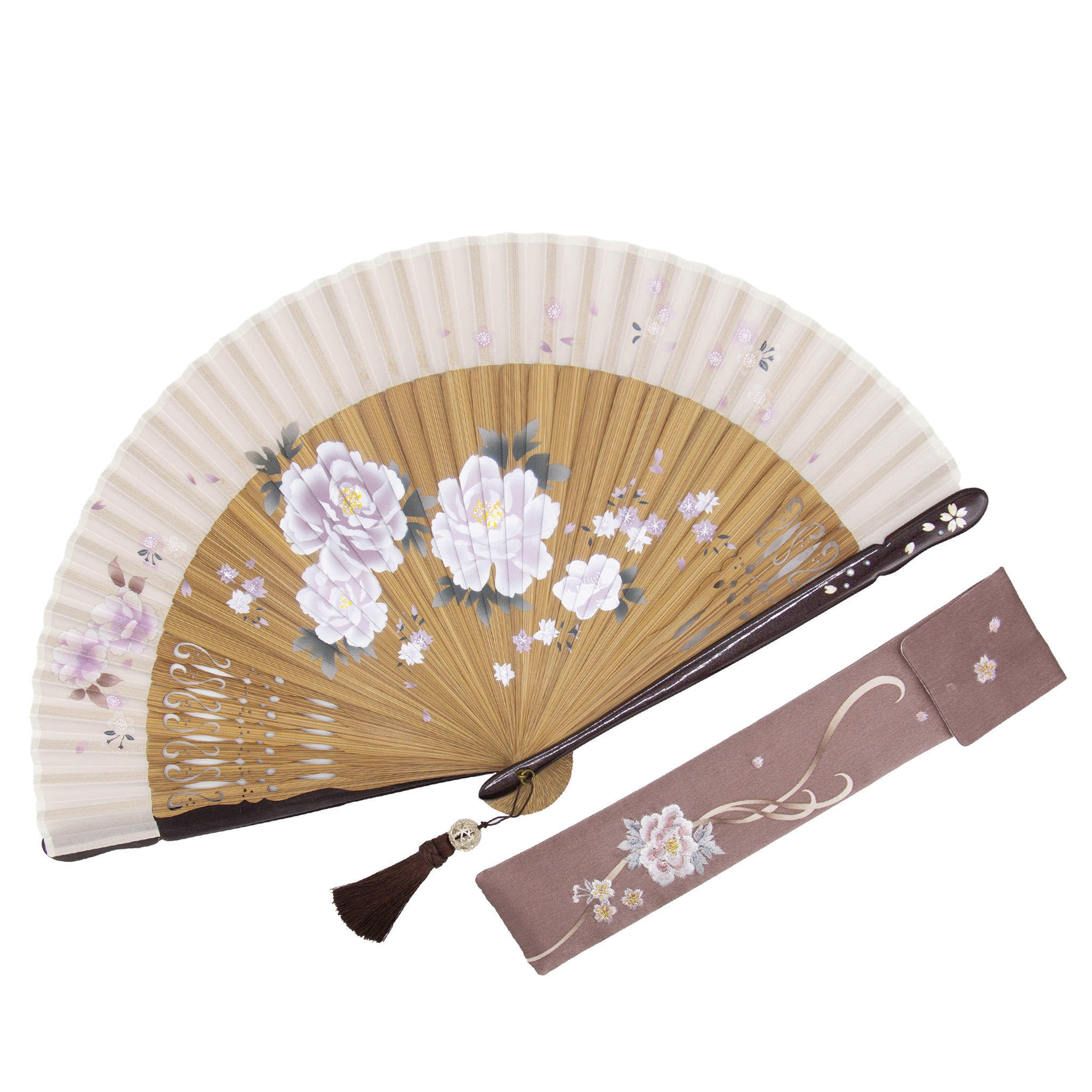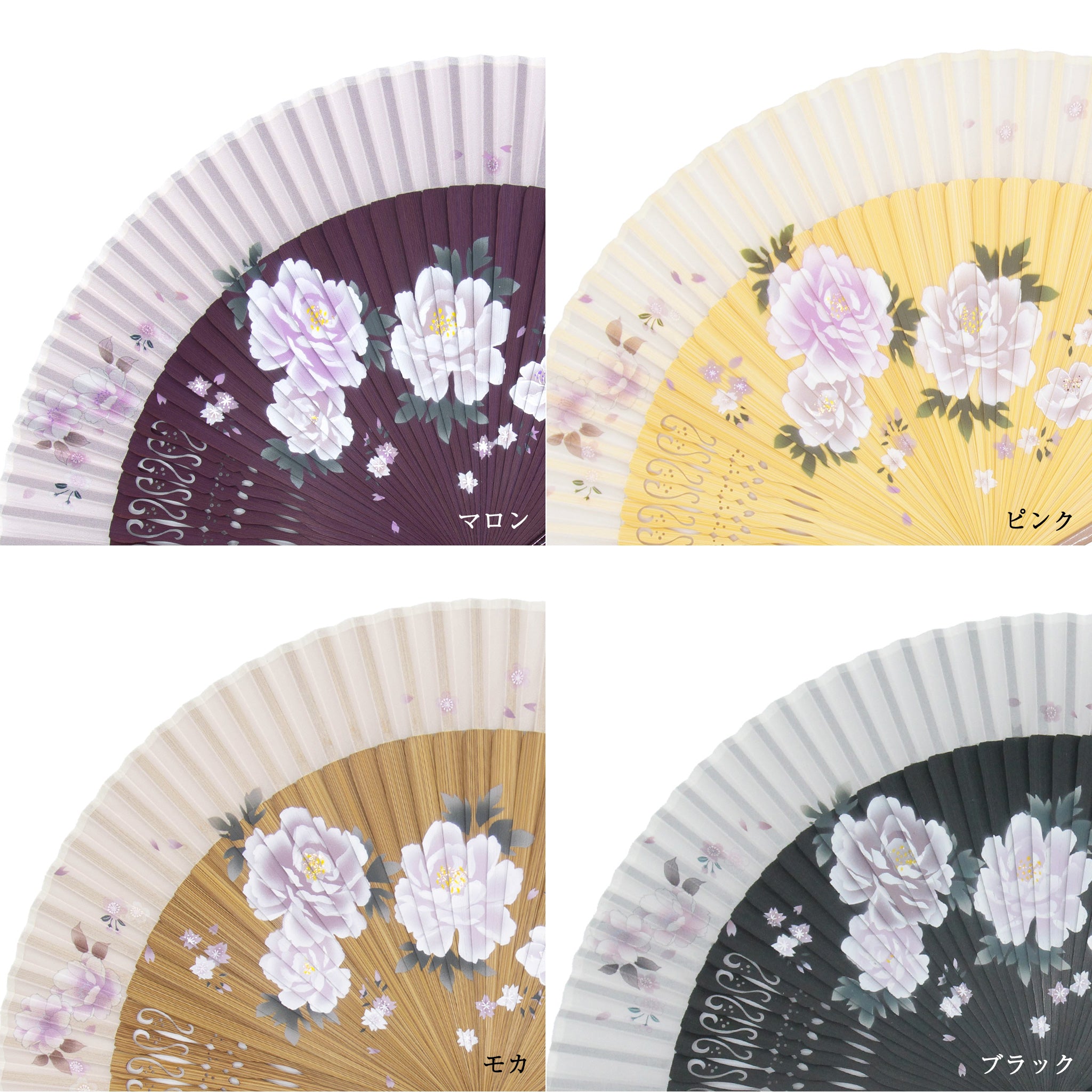 ペンテックスで描かれた大輪の牡丹の花と桜の花が咲き誇る扇子。