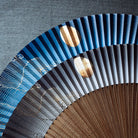 銀箔を硫黄でいぶす「いぶし銀」という技法で、空に浮かぶ月と波模様を表現しました。まるで夜が更けてゆく空のような扇面のグラデーションと合わさり、独特の世界観を描き出しています。