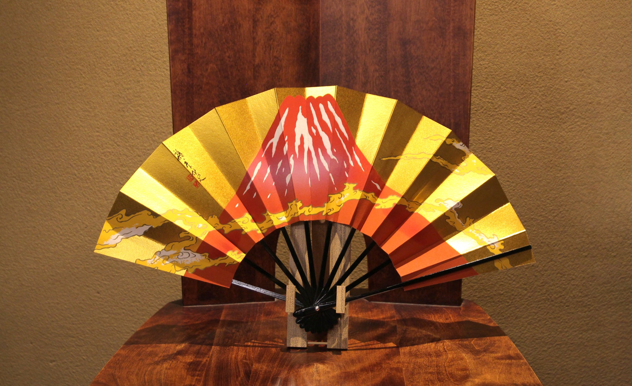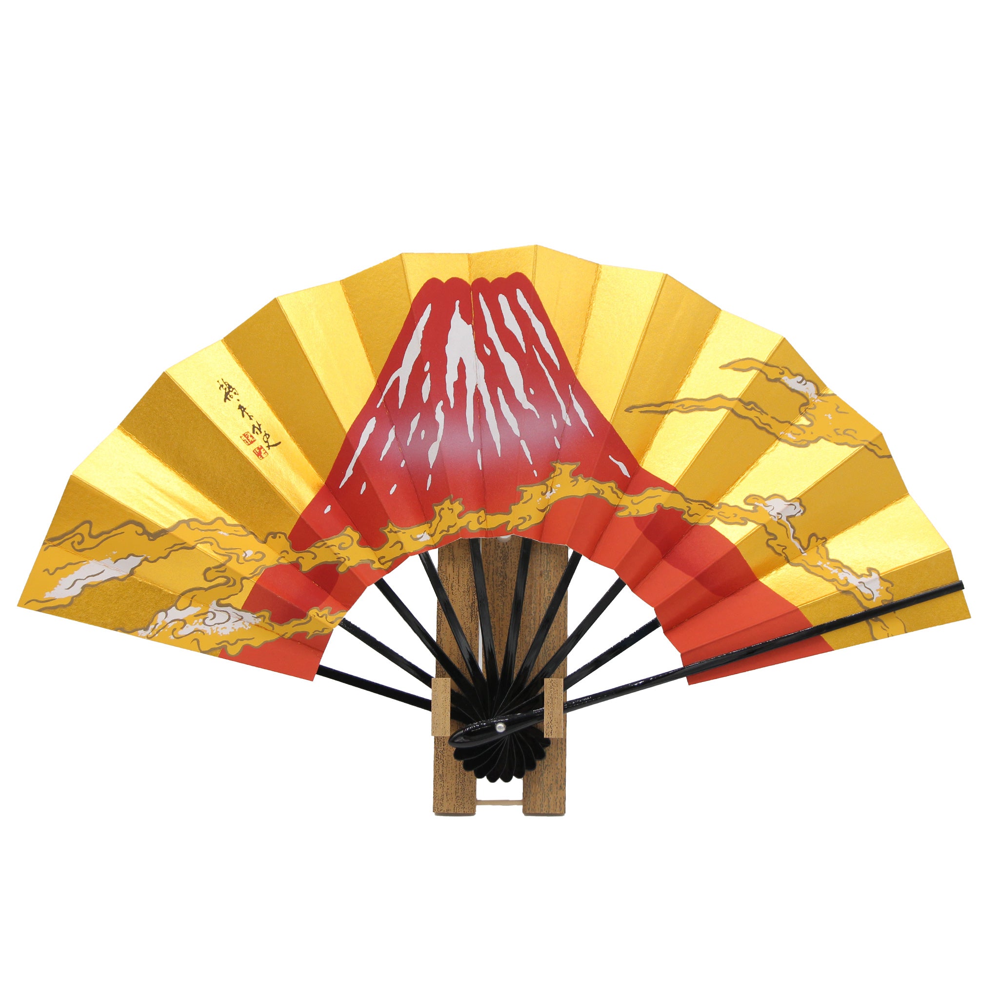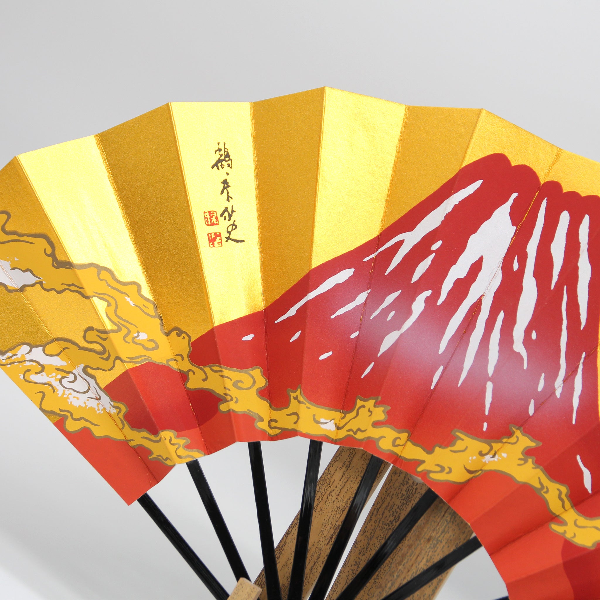 金地の扇面中央にそびえたつ赤富士と流れる雲海。優美なその風貌は、観る人の心を癒してくれます。