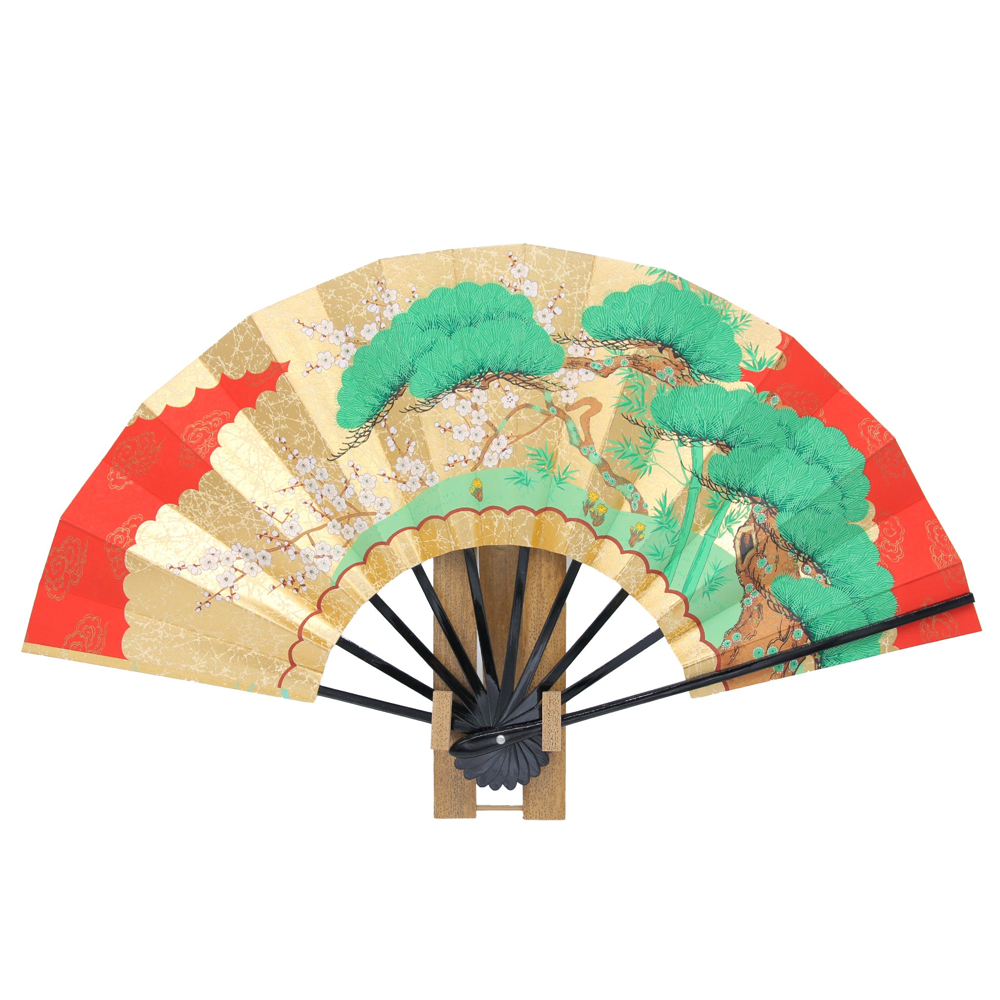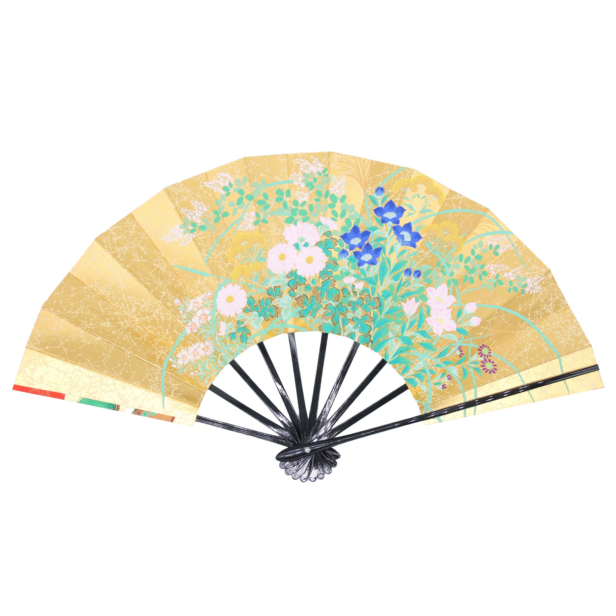 華やかな金地に松の柄と、落ち着いた秋草が描かれた両面絵柄の飾り扇子です。