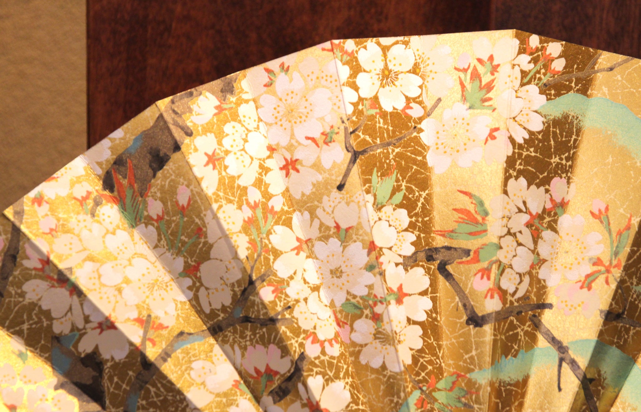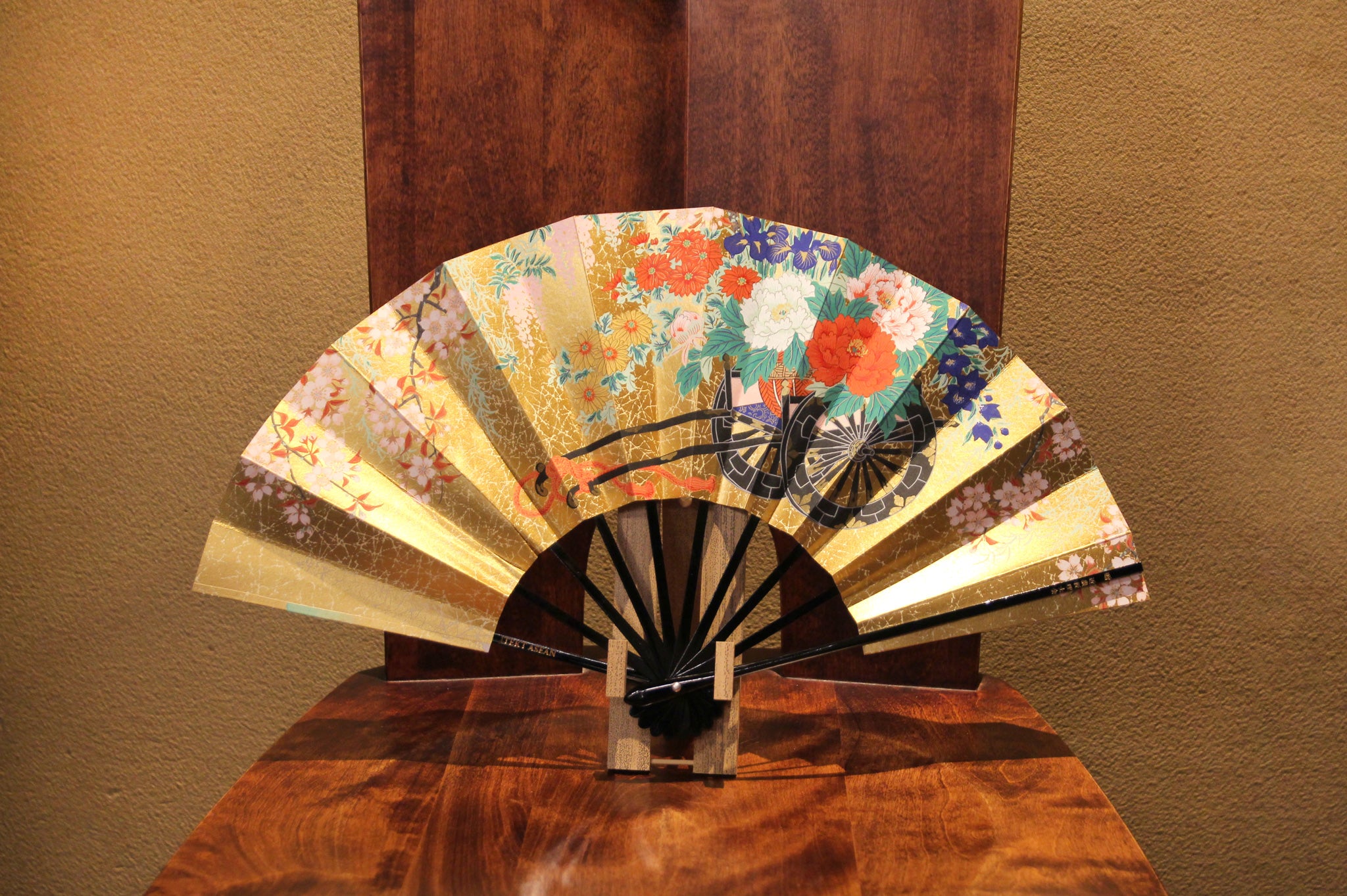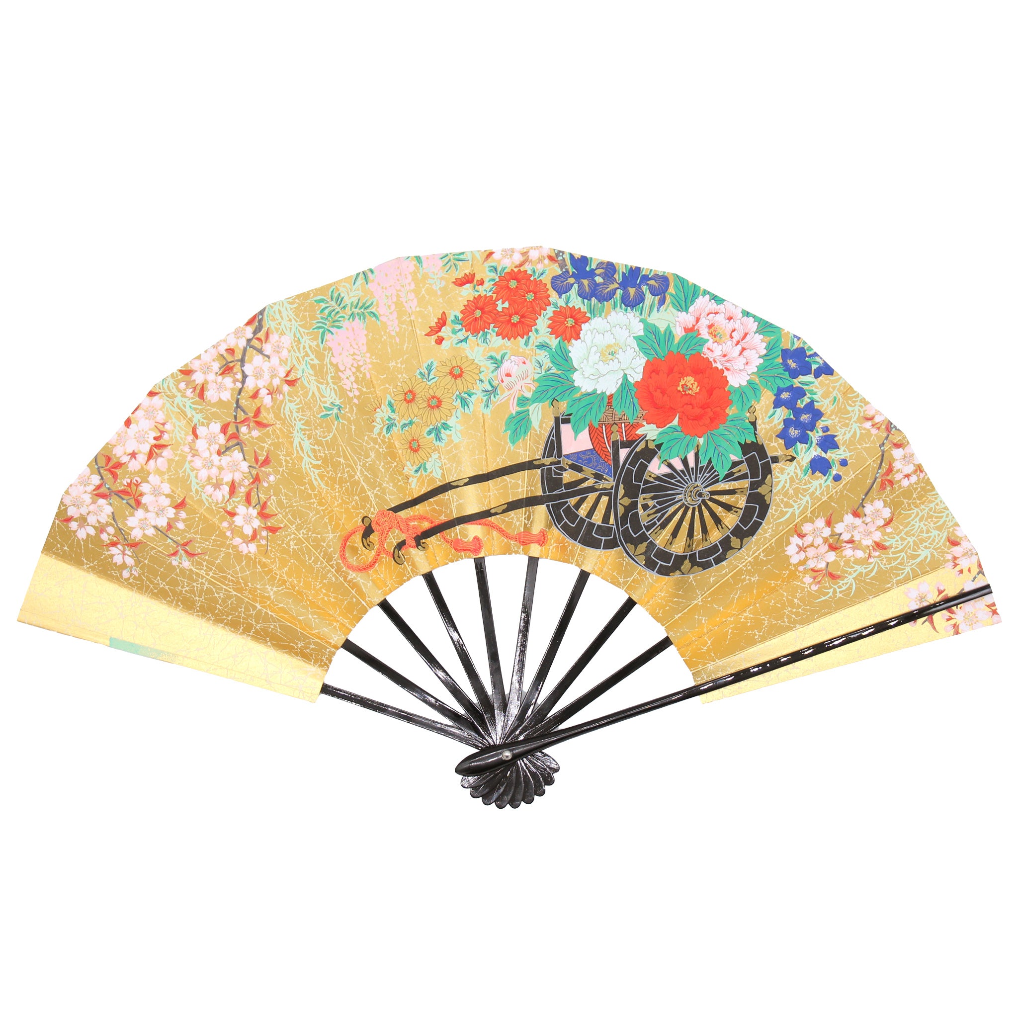 華やかな金地に桜の柄と、花車を描いた両面絵柄の飾り扇子です。