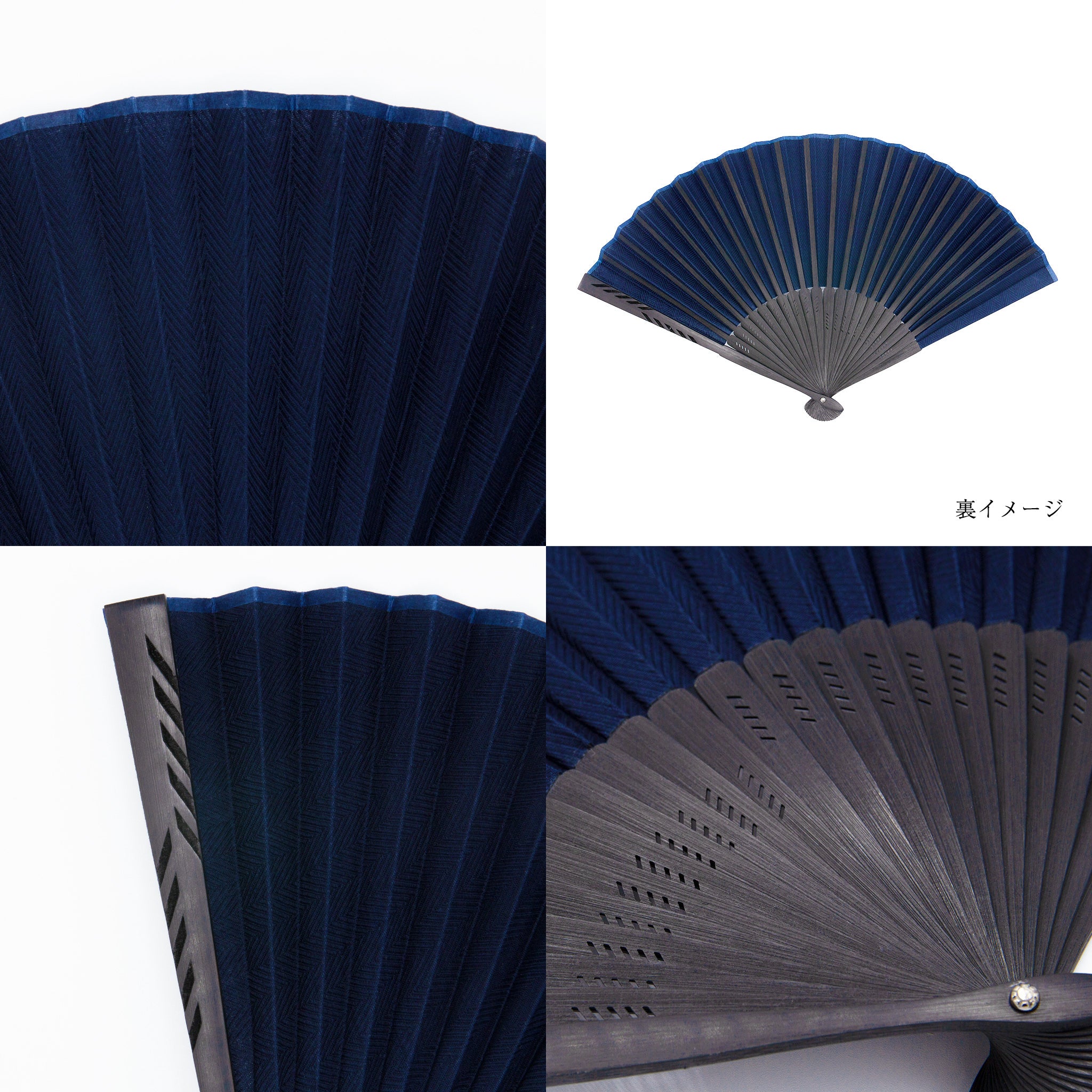 V字が連続するヘリンボーン柄の扇面と親骨・仲骨に並ぶ斜めの切れ込みが特徴的な扇子。