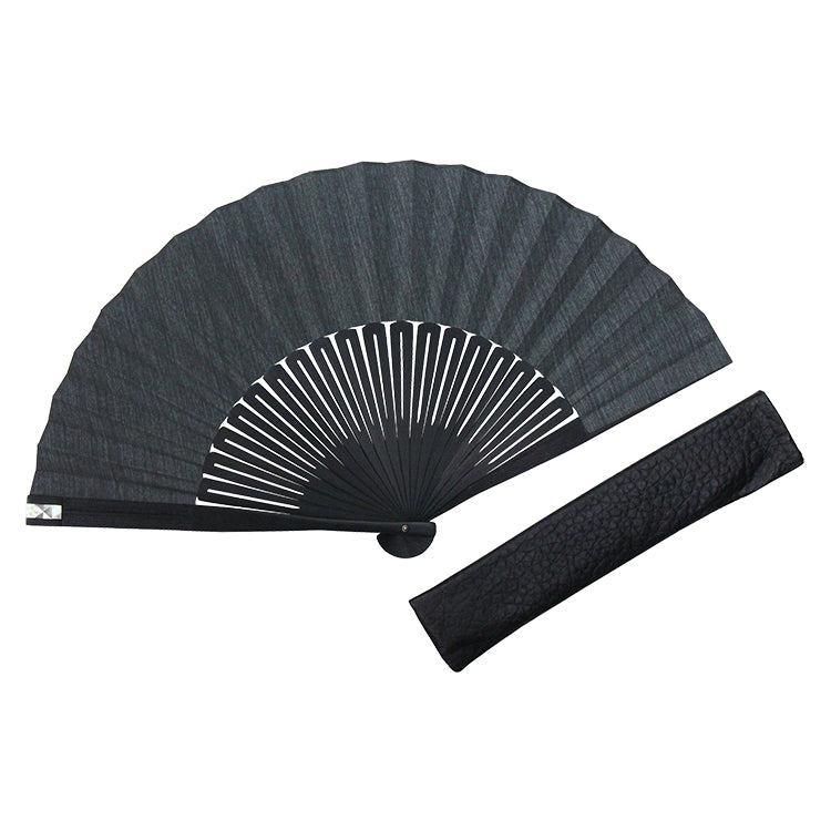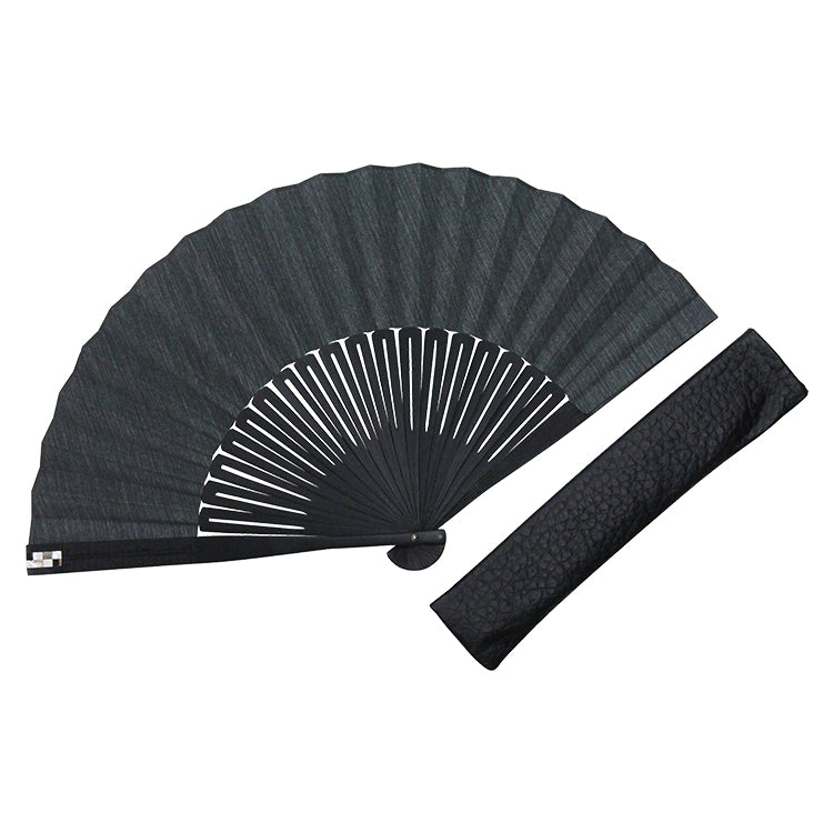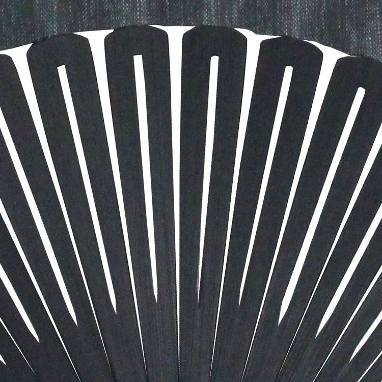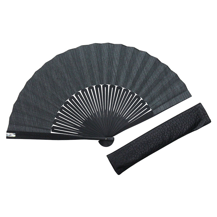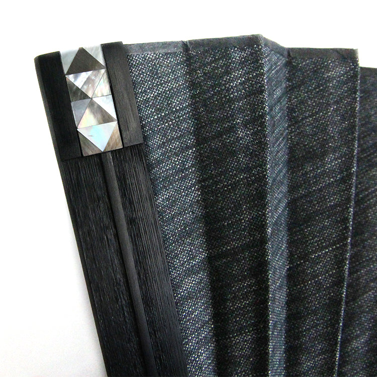 親骨の先端にスタイリッシュで美しい幾何学模様の螺鈿細工が施された、モノトーンでシンプルながらも細部にこだわった扇子。