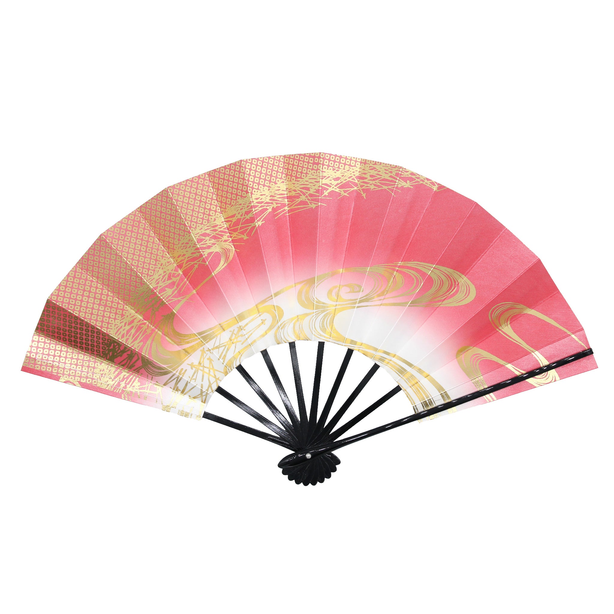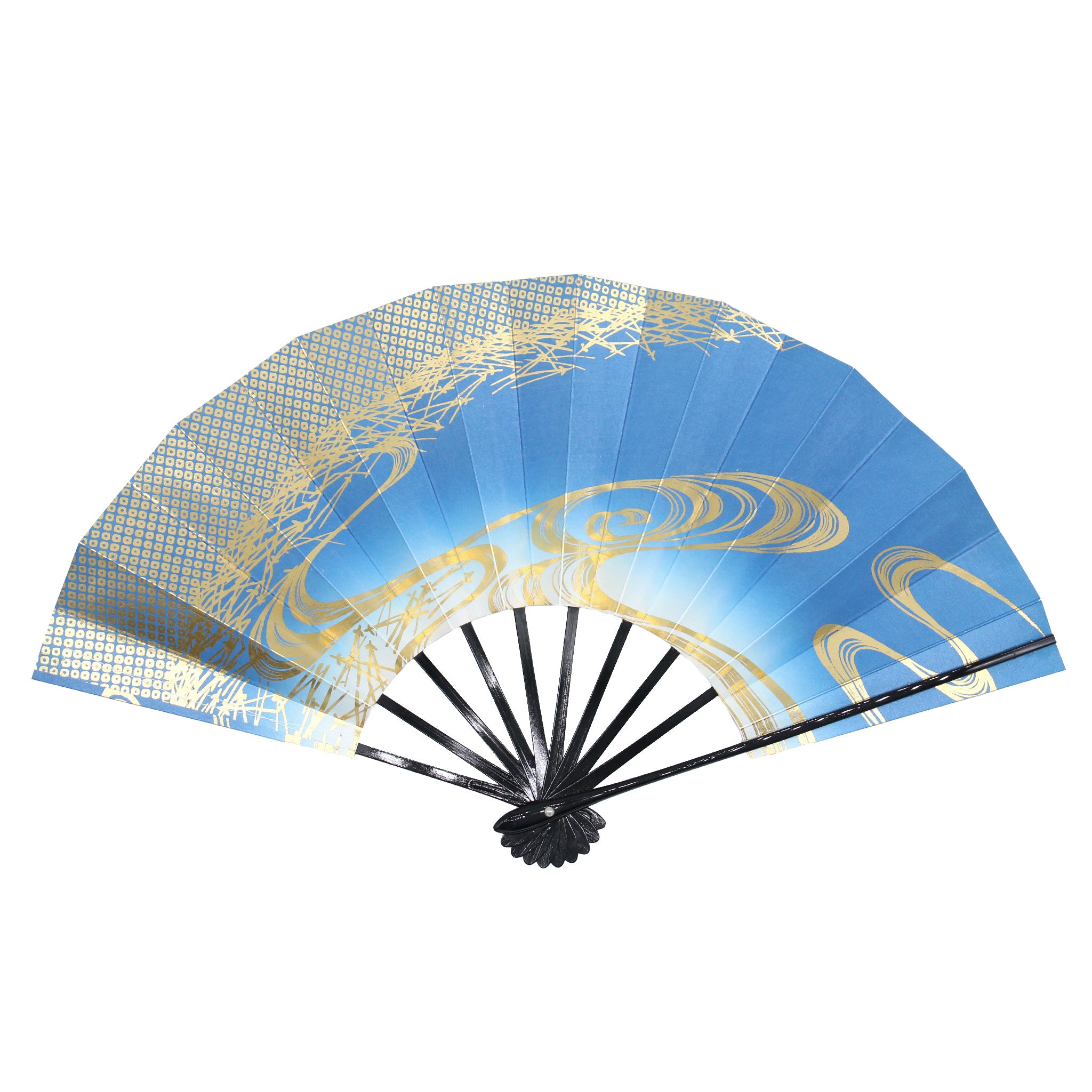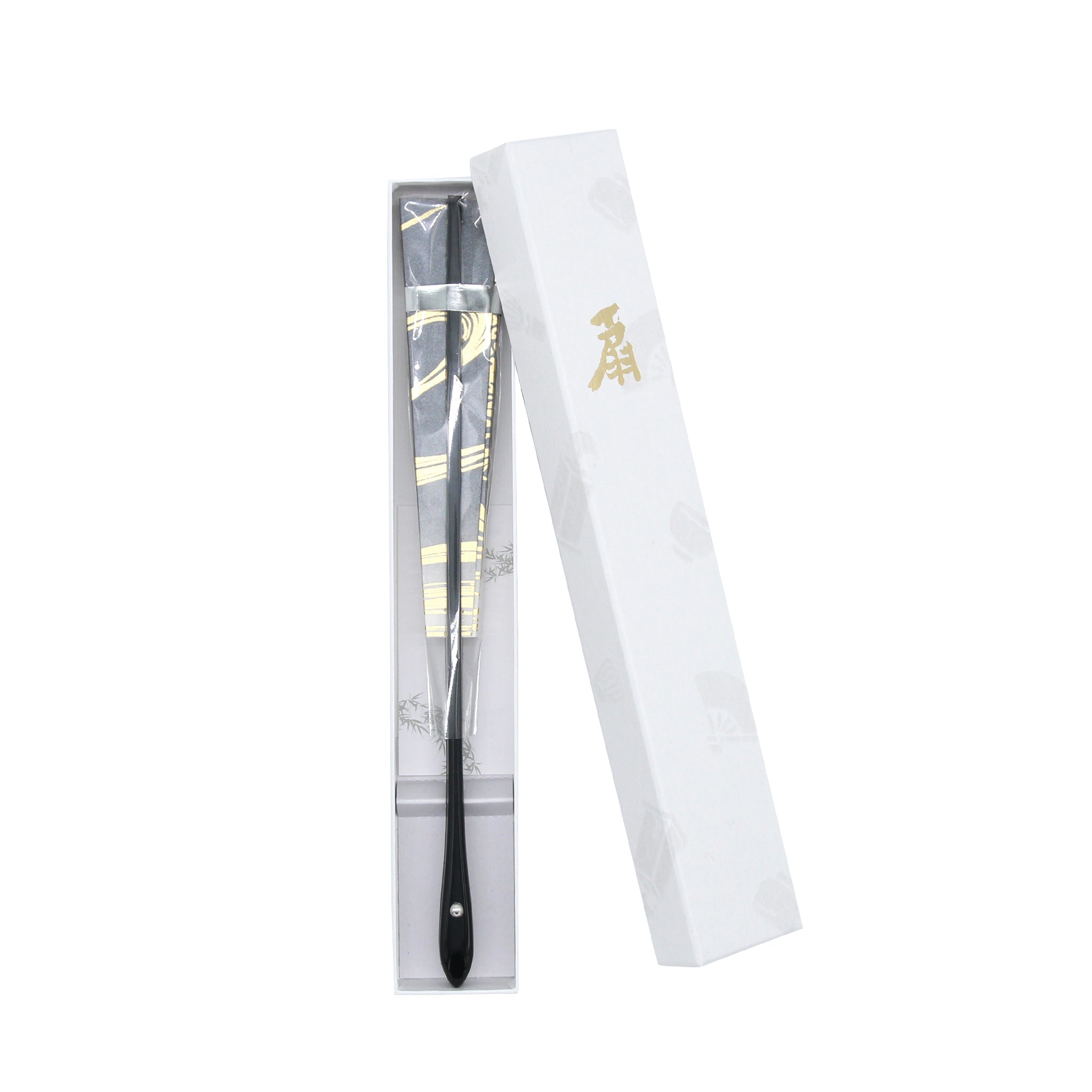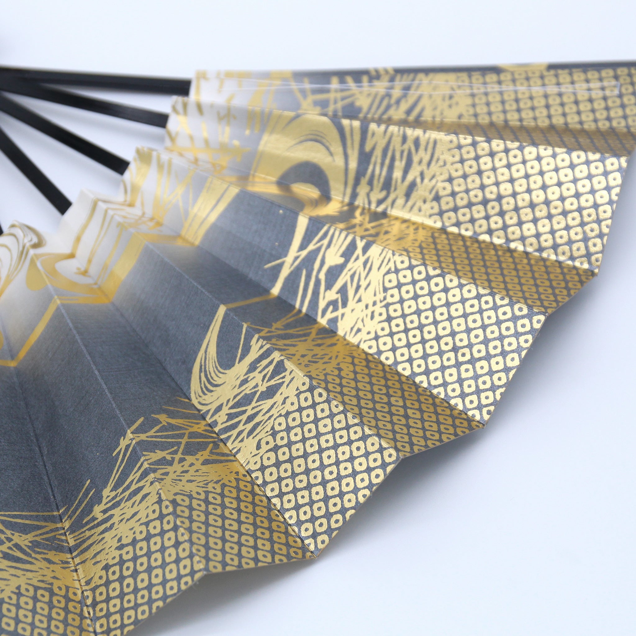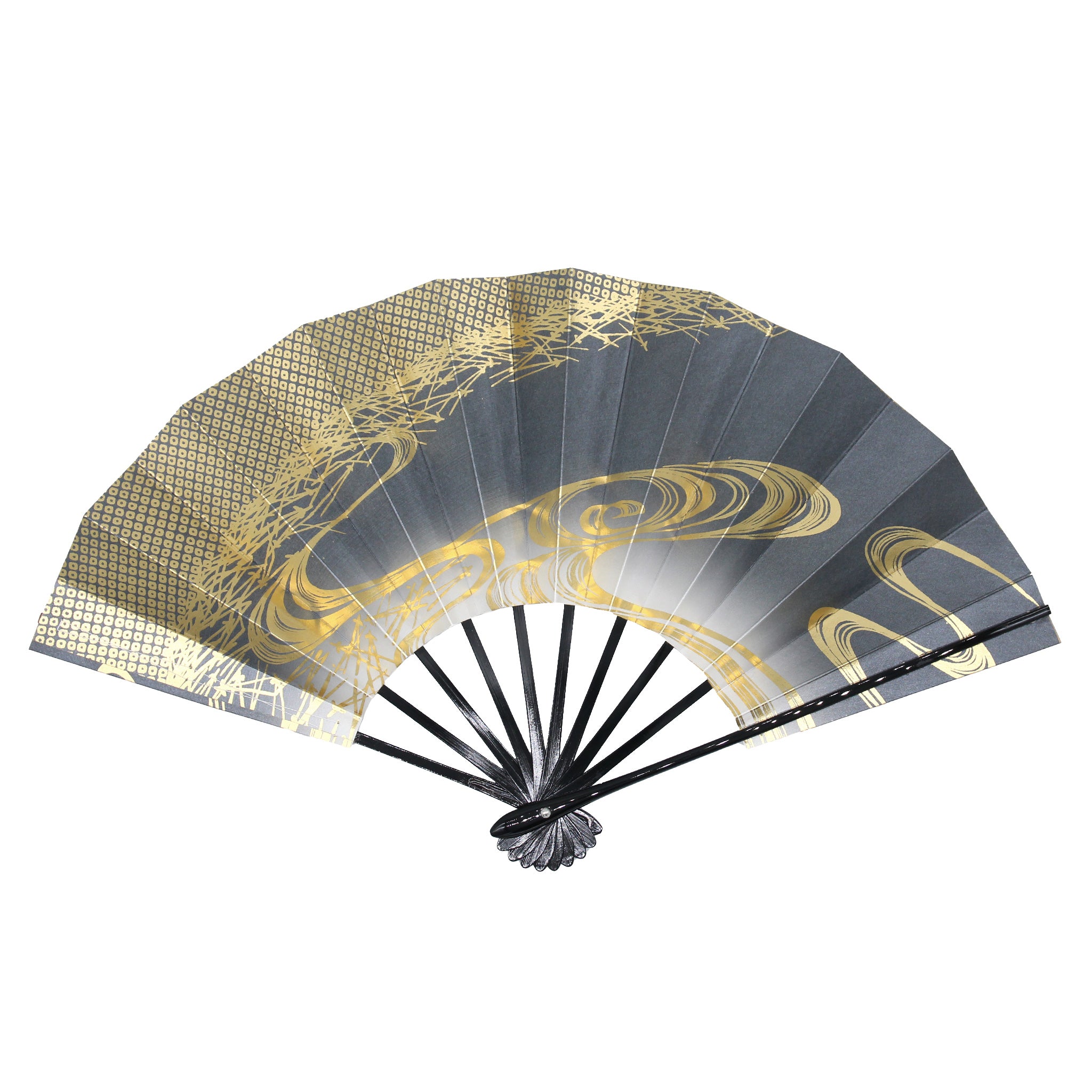 雲母のかかった黒地に水流や松葉が箔押しされた、シンプルかつ上品な舞扇子。