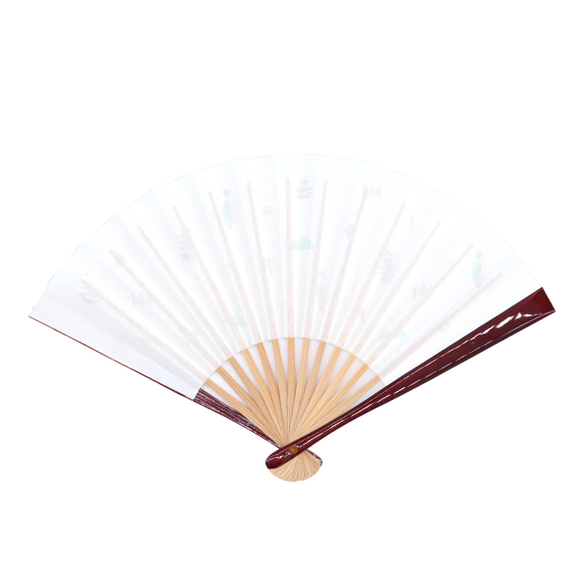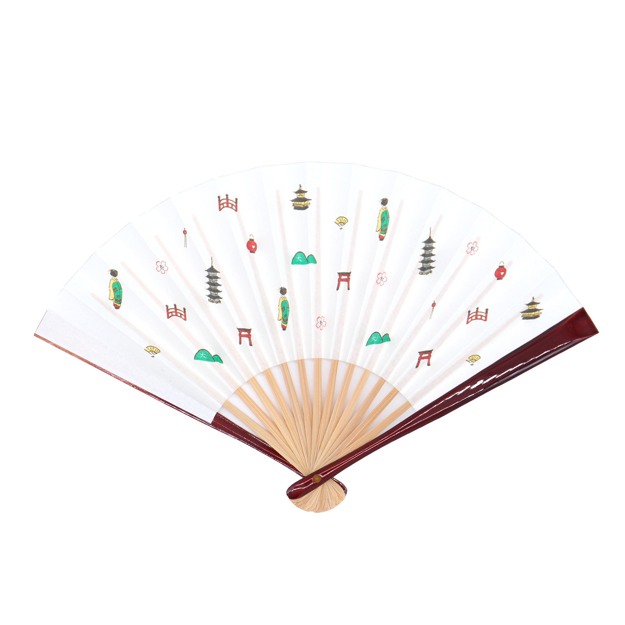 親骨は高級感のある塗り骨に、扇面は京都を代表するモチーフが描かれた、かわいらしい茶扇子です。