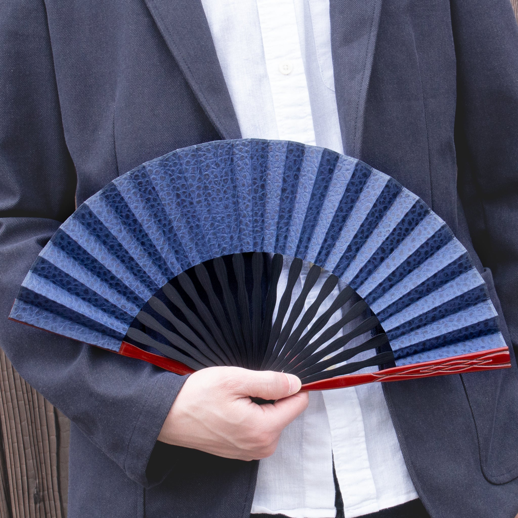 カジュアルにも使えるようにネイビーを選びました。革扇子というのは初めて見ましたが、かっこいいですね。父に渡すのが楽しみです。