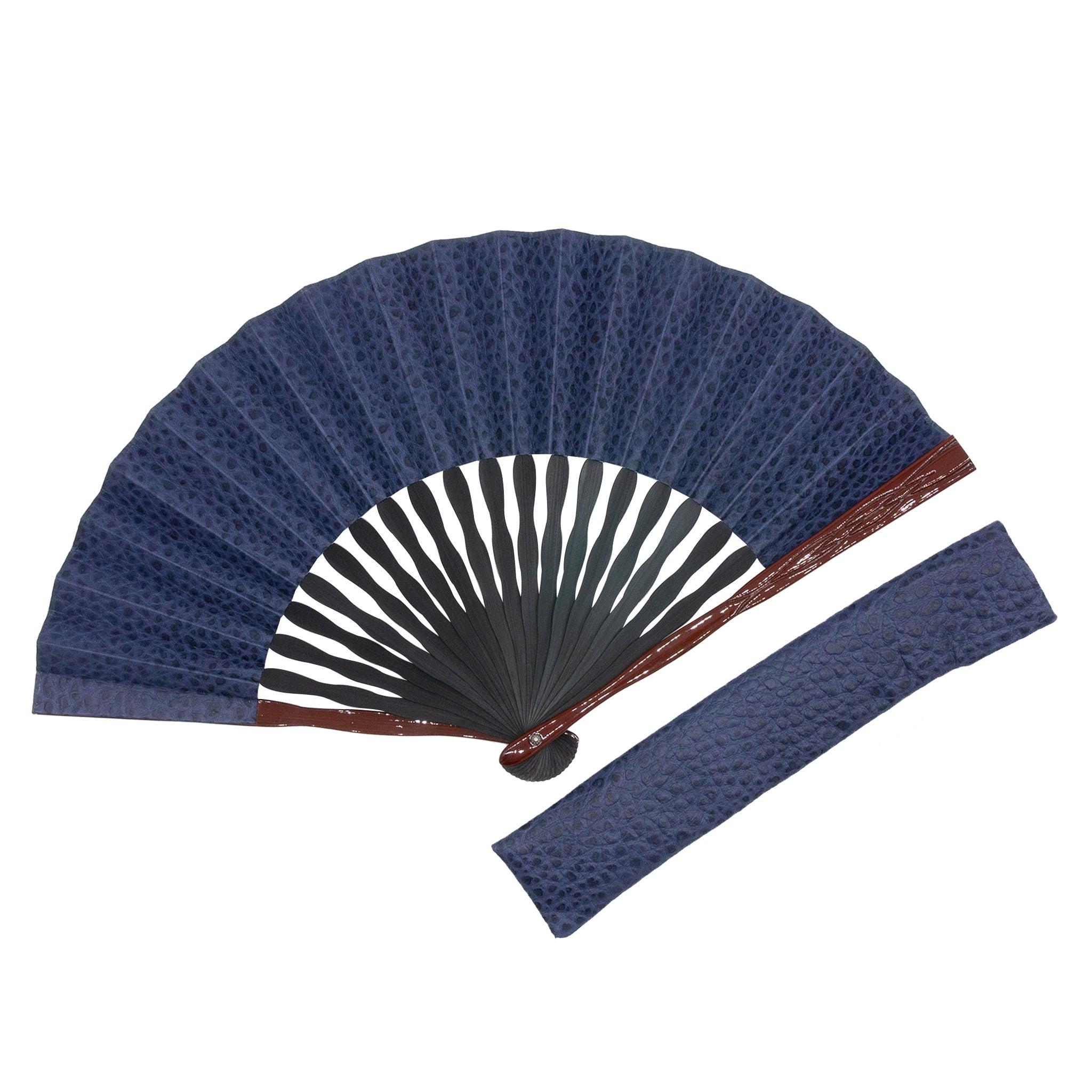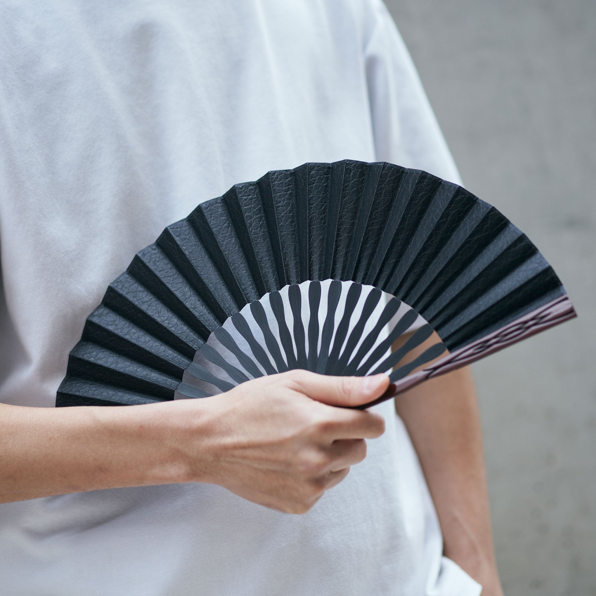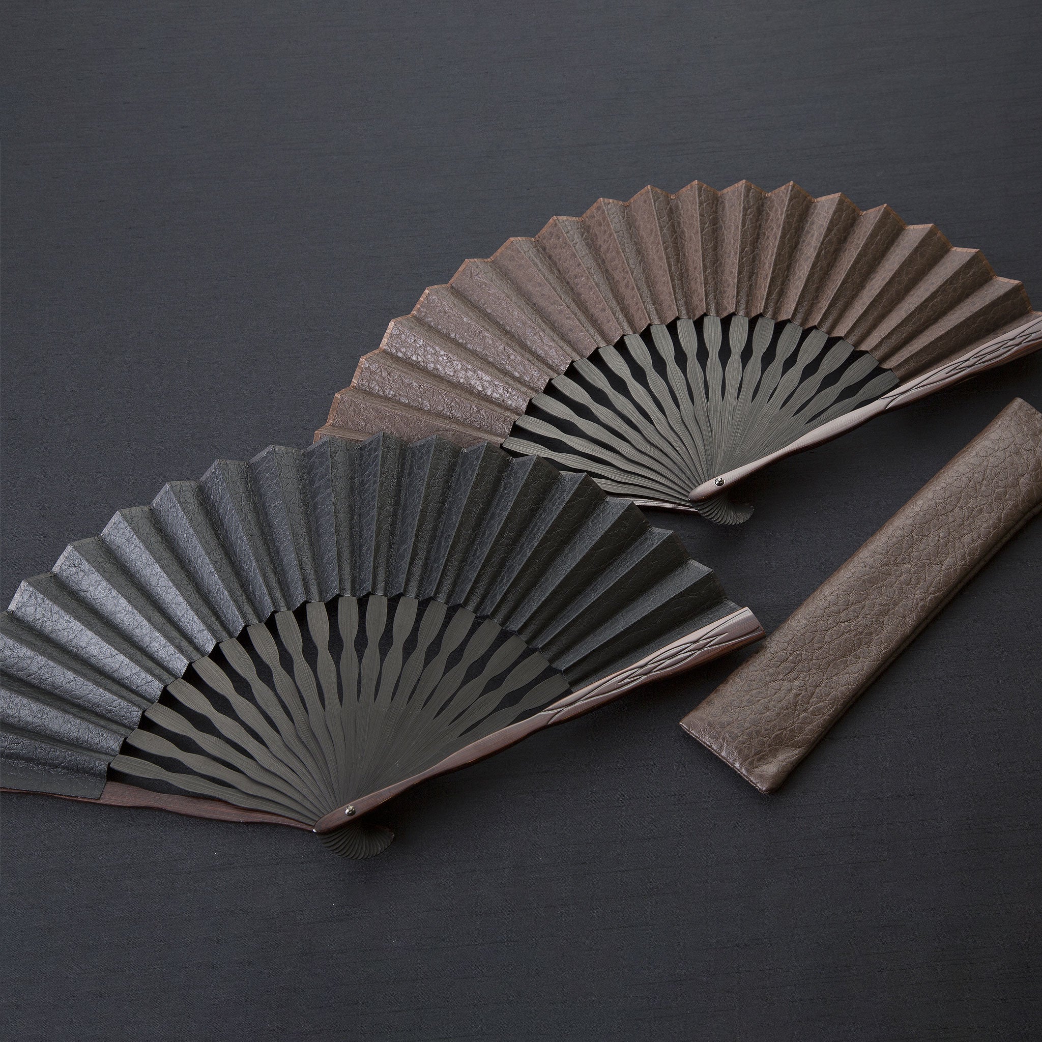 国産の牛革でつくられた扇面と彫り加工を施した艶やかな親骨が魅力の上品でモダンな扇子。