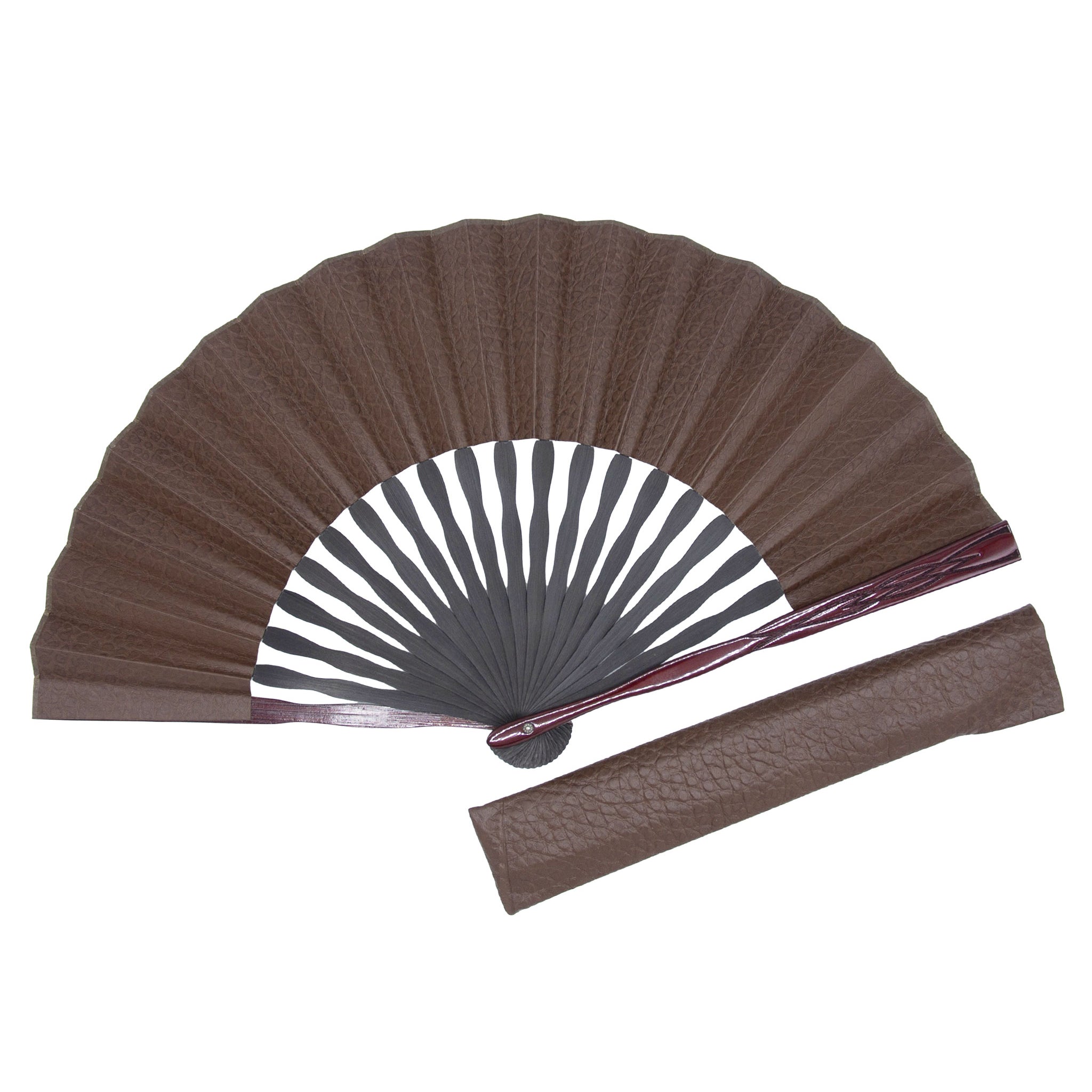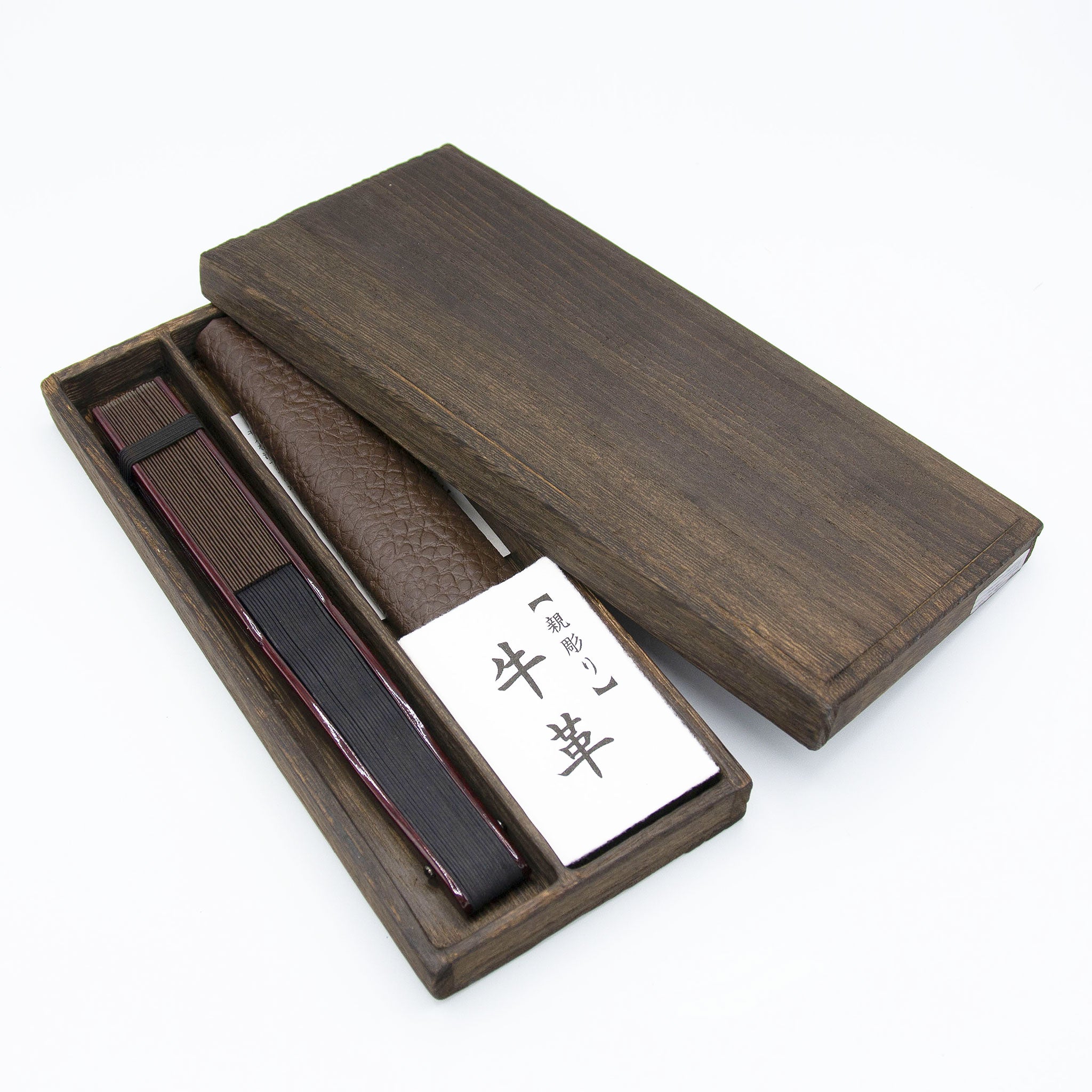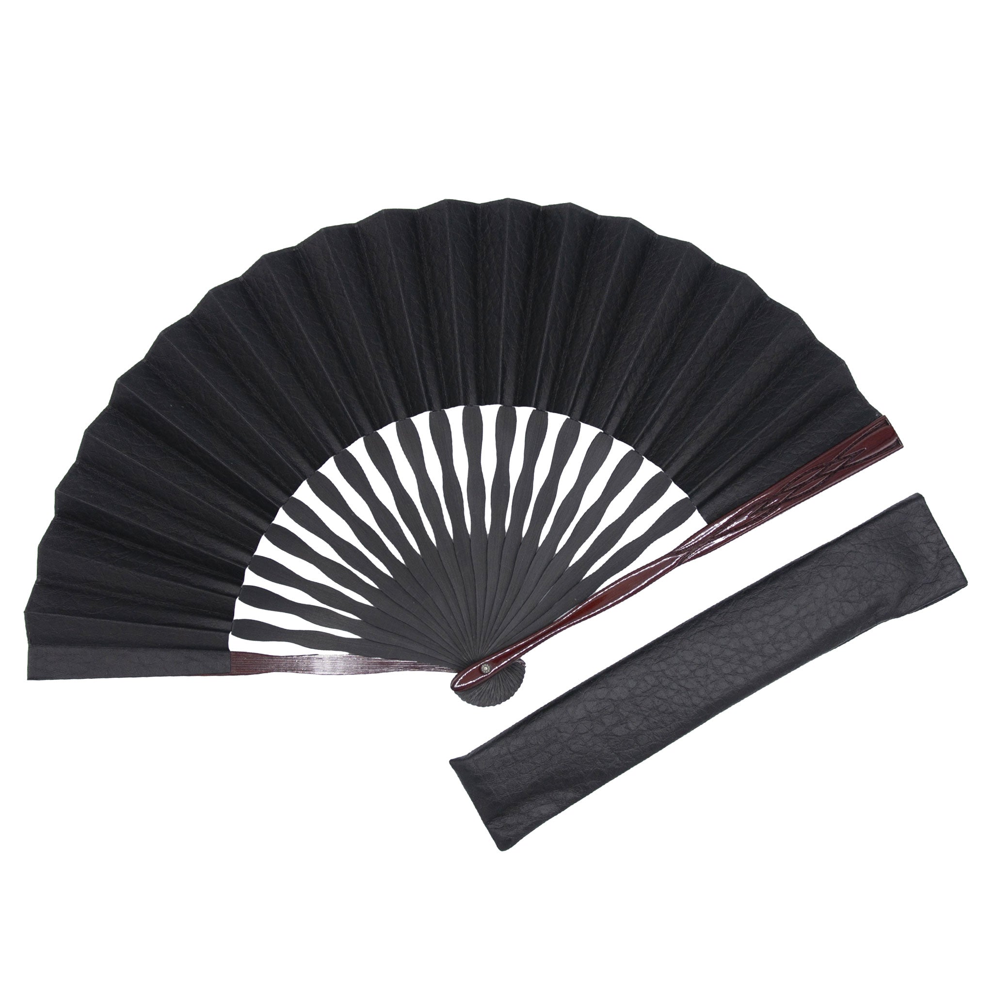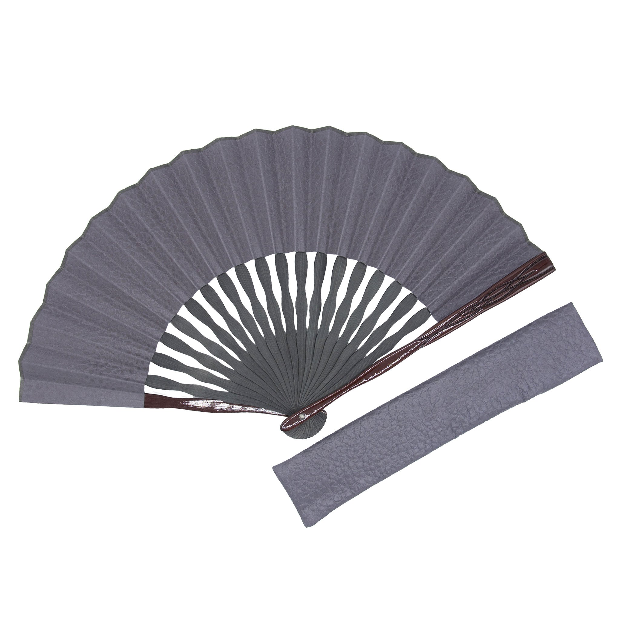 国産の牛革でつくられた扇面と彫り加工を施した艶やかな親骨が魅力の上品でモダンな扇子。