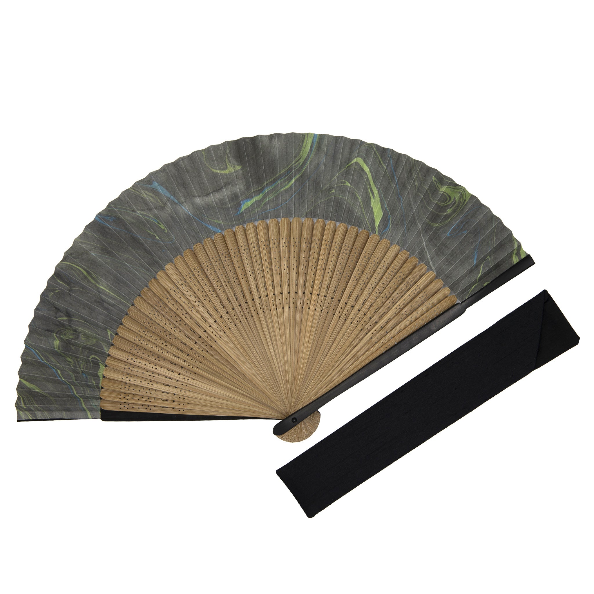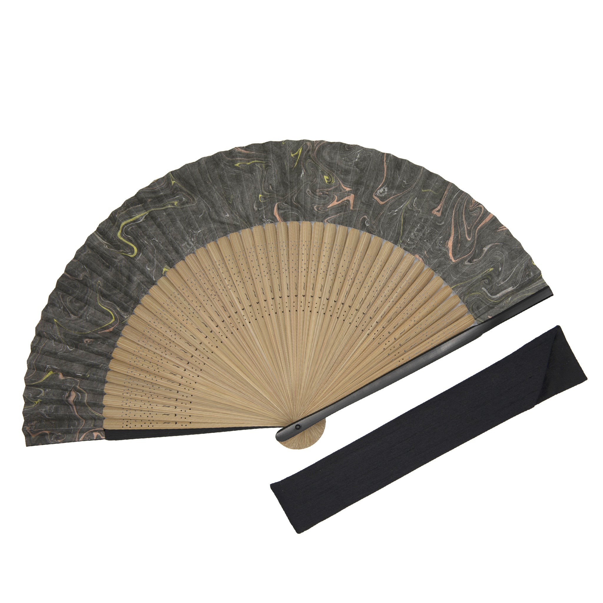 「墨流し」の名の通り、黒に混じる青と緑、赤と黄などの色の流れる動きが感じられます。仲骨には唐木染め、細身の親骨には黒染めを施し、シックな仕上がりに。