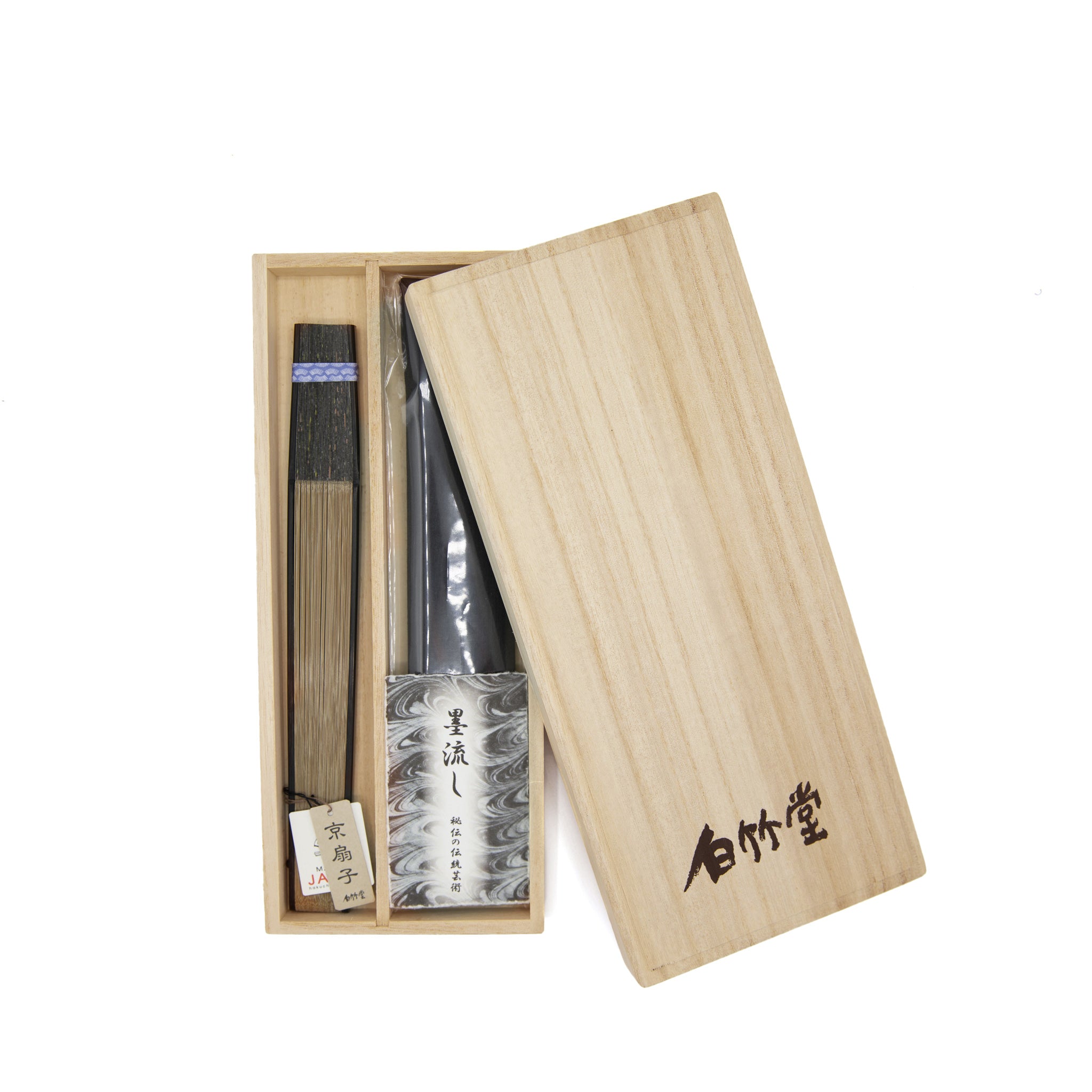 平安時代より伝わる伝統技法「墨流し」を施した美濃和紙を両面に貼り合わせた京扇子。