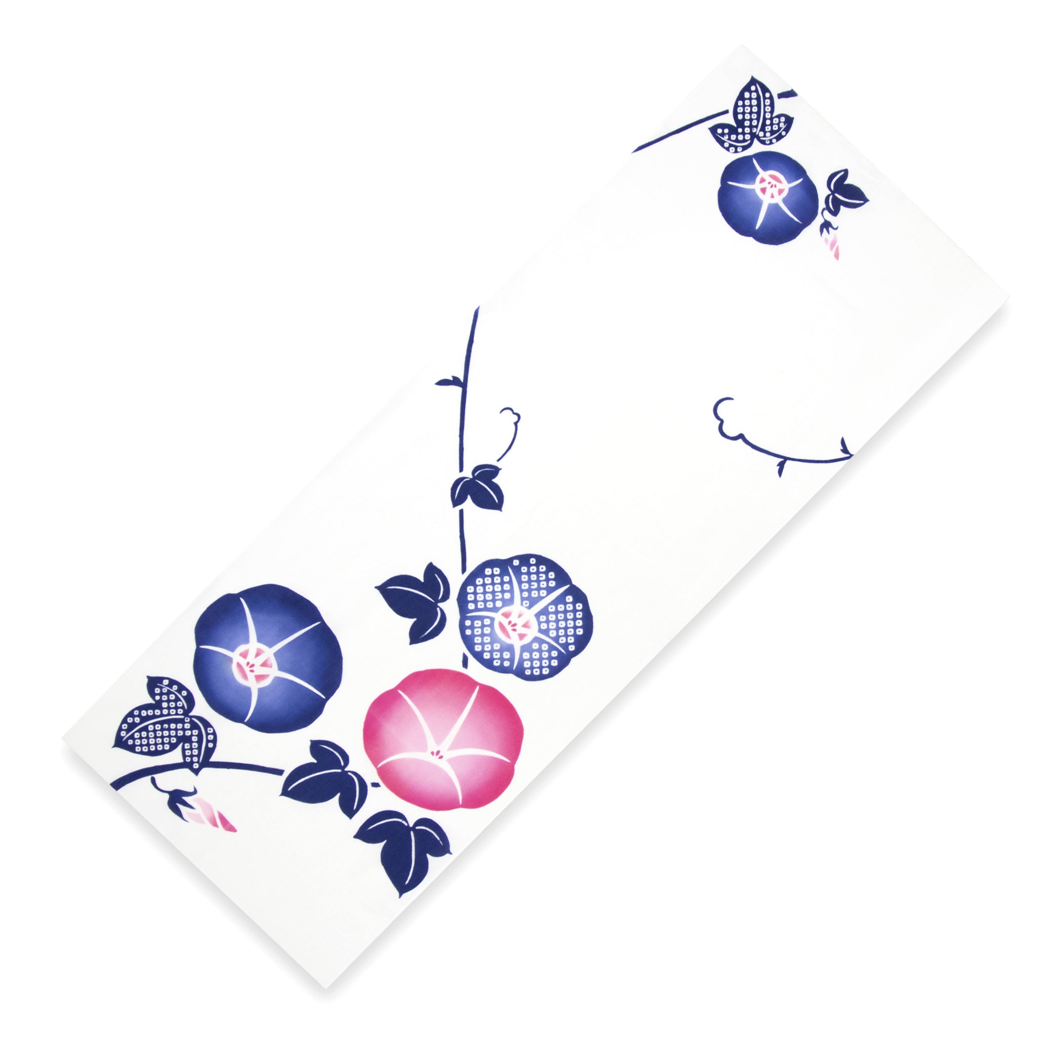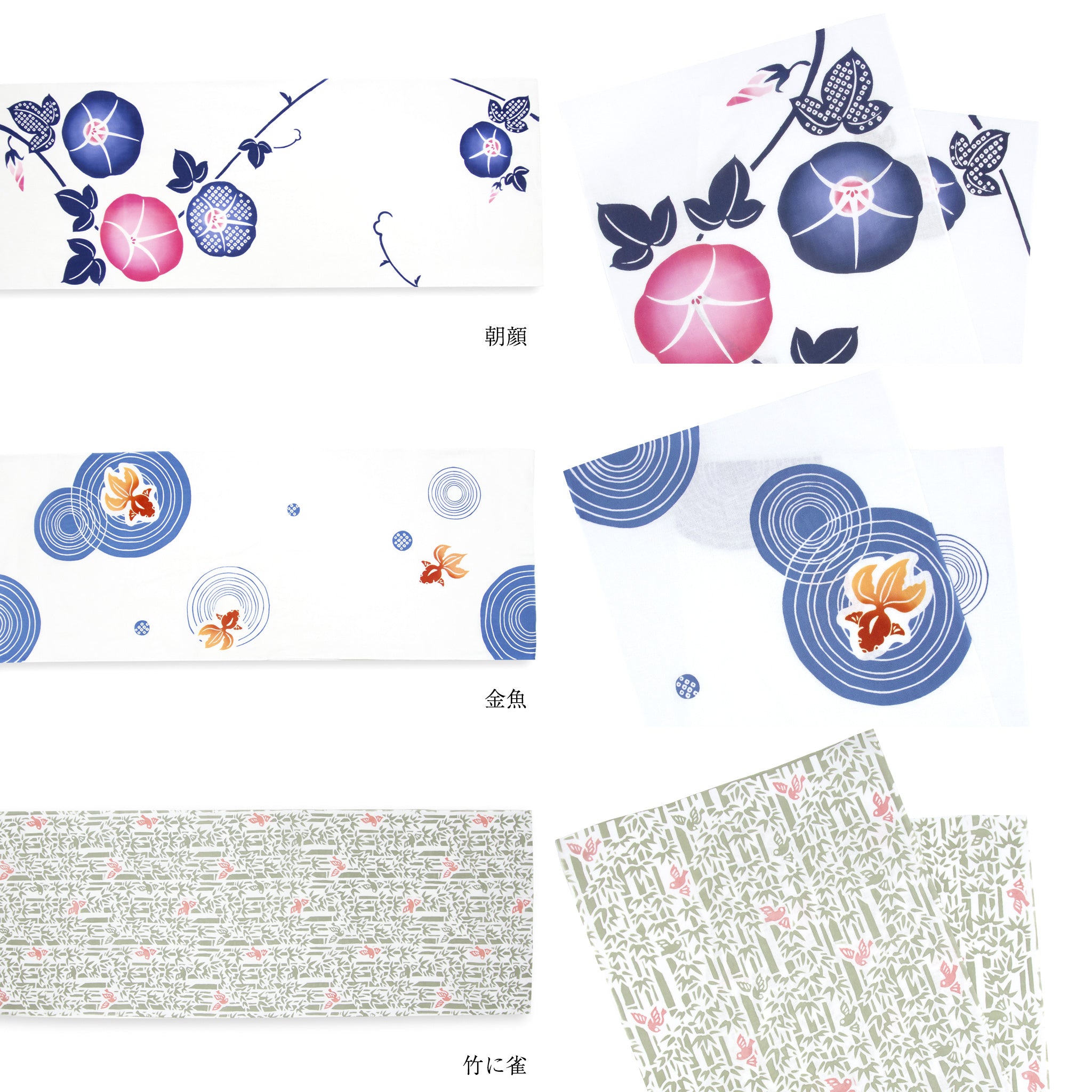 『注染(ちゅうせん)』という明治時代に考案された技法で染められた手ぬぐいです。手染めならではの独特の風合いをお楽しみいただけます。朝顔、金魚、竹に雀の3柄をご用意。